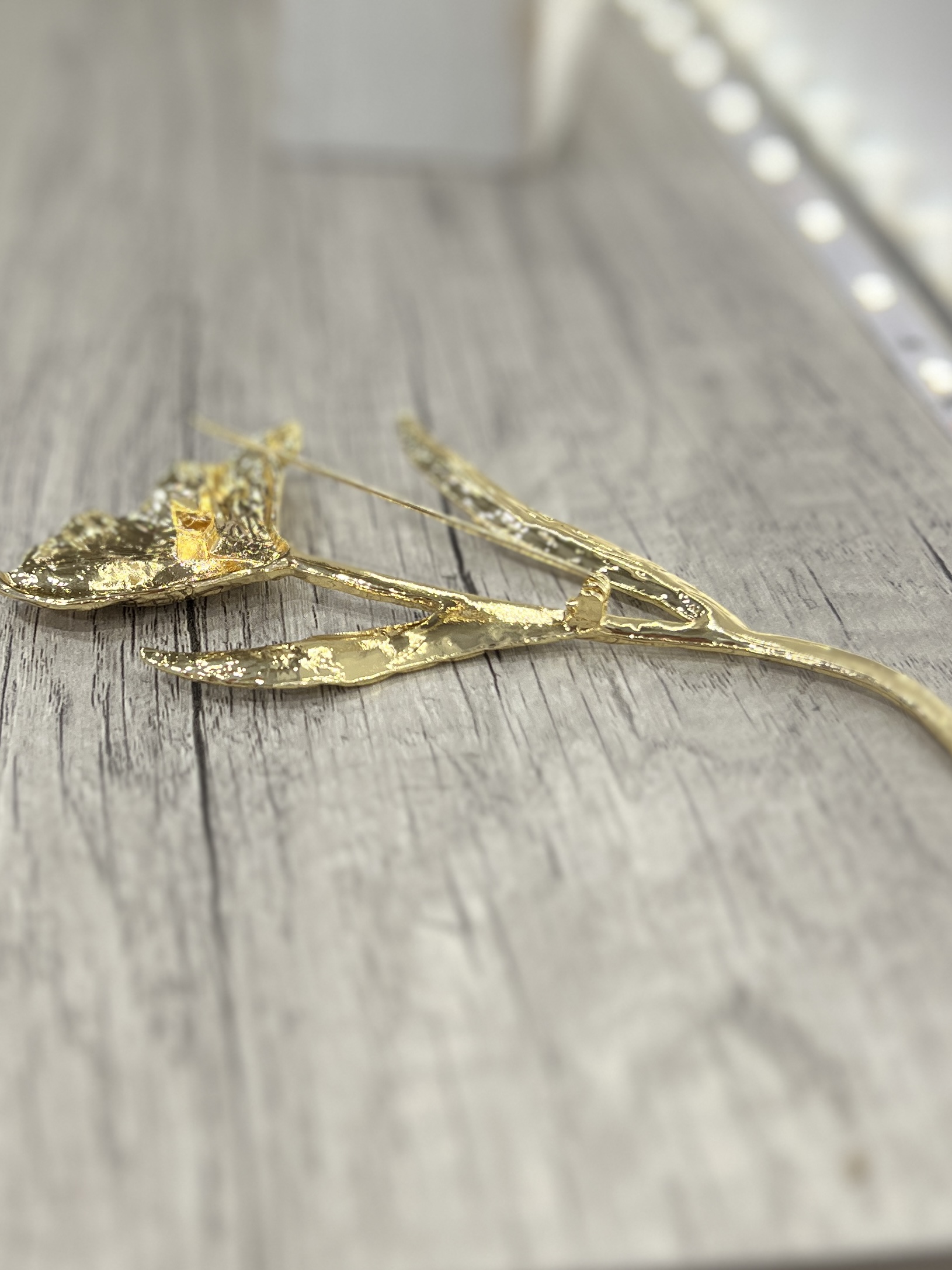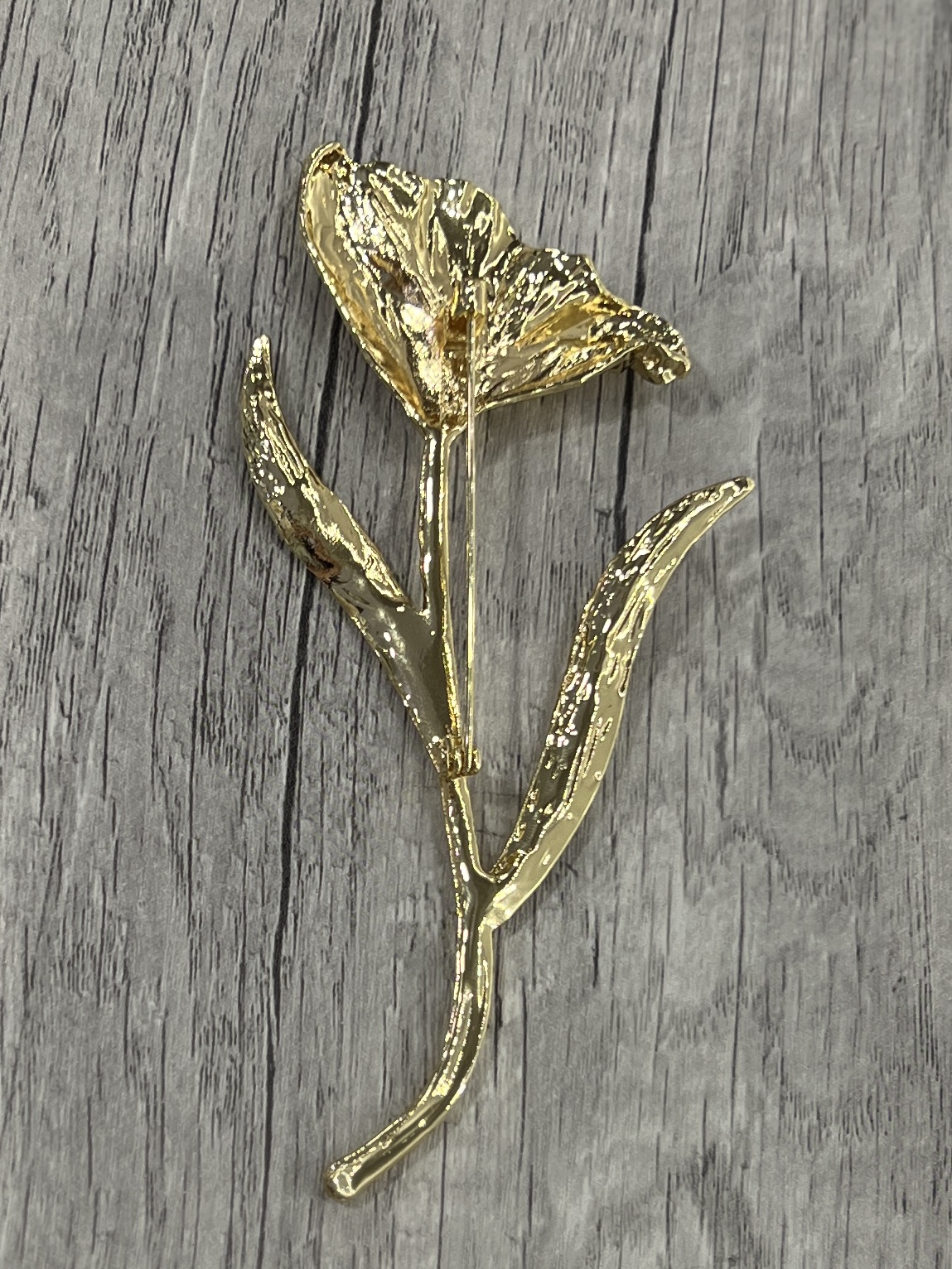 Broche raffinée en forme de fleur entièrement dorée, aux détails finement travaillés qui captent la lumière.