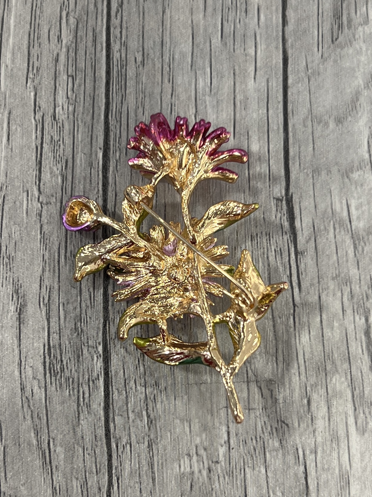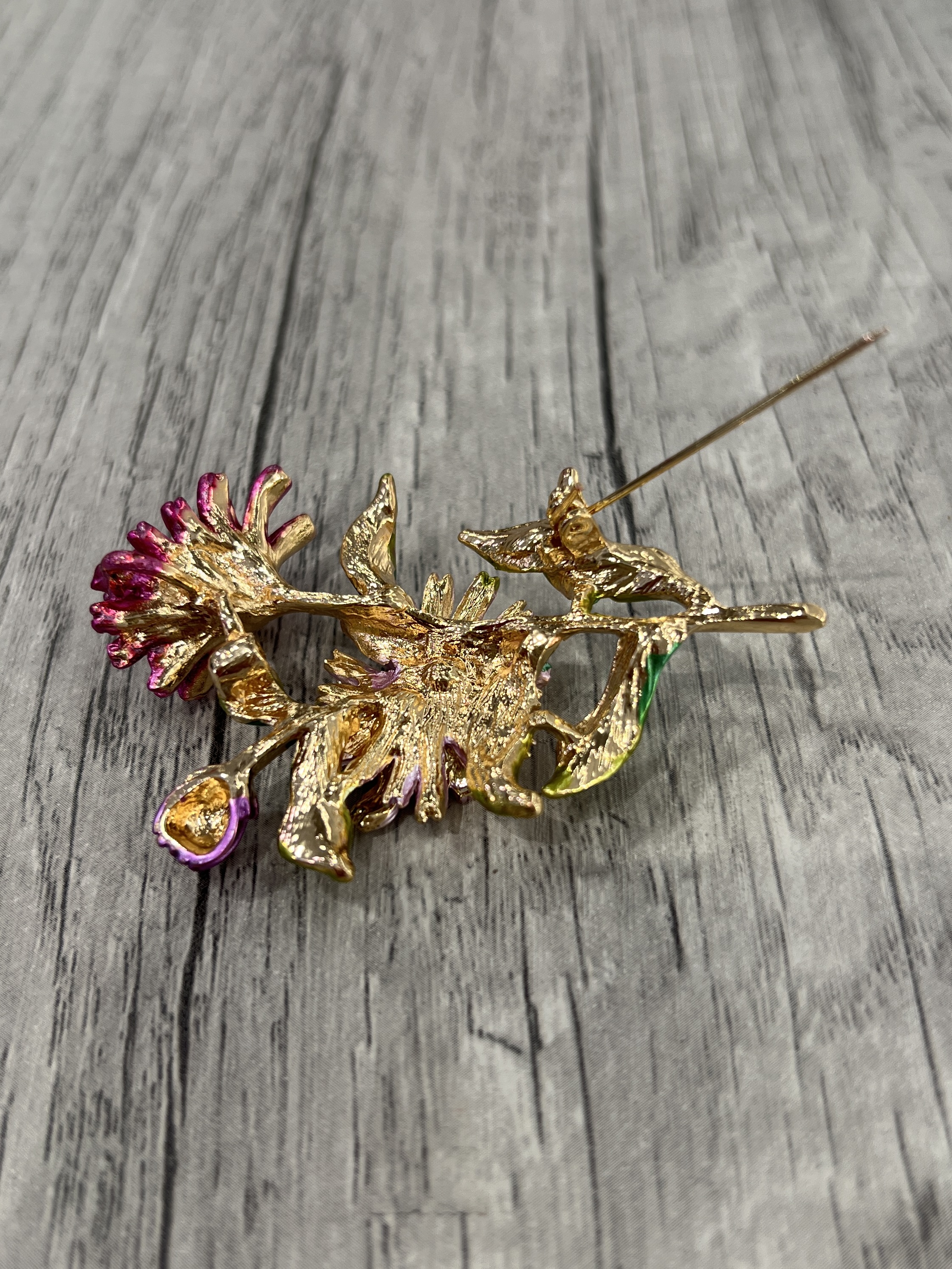 Broche délicate représentant un bouquet de fleurs aux couleurs éclatante: rose, fuchsia et v ert, sublimées par des détails dorés.