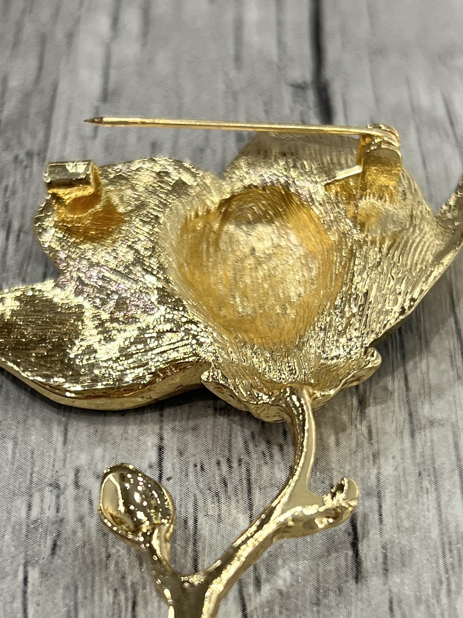 Broche élégante en forme de fleur aux pétales violet émaillés, délicatement souligné de détails dorés.