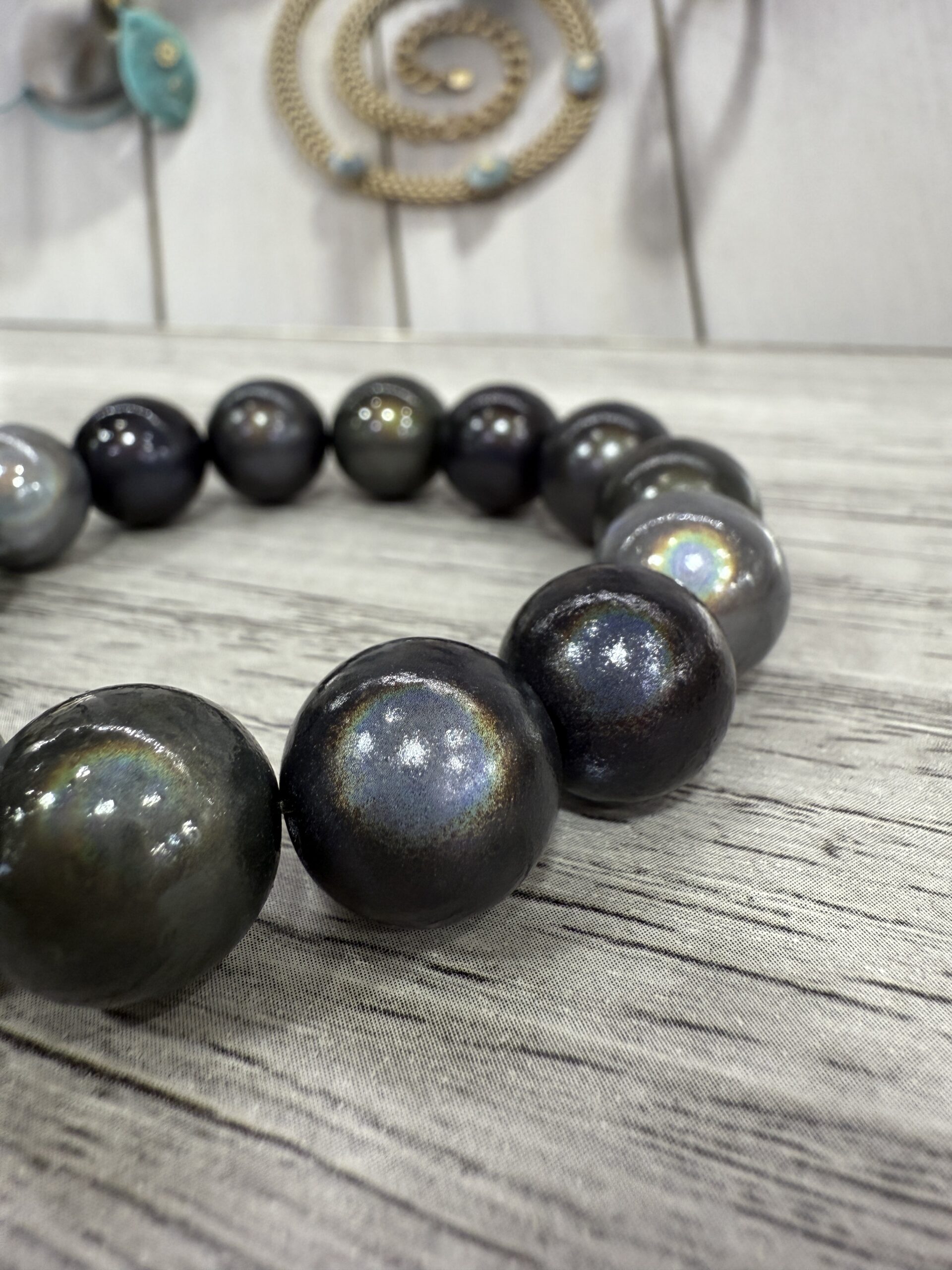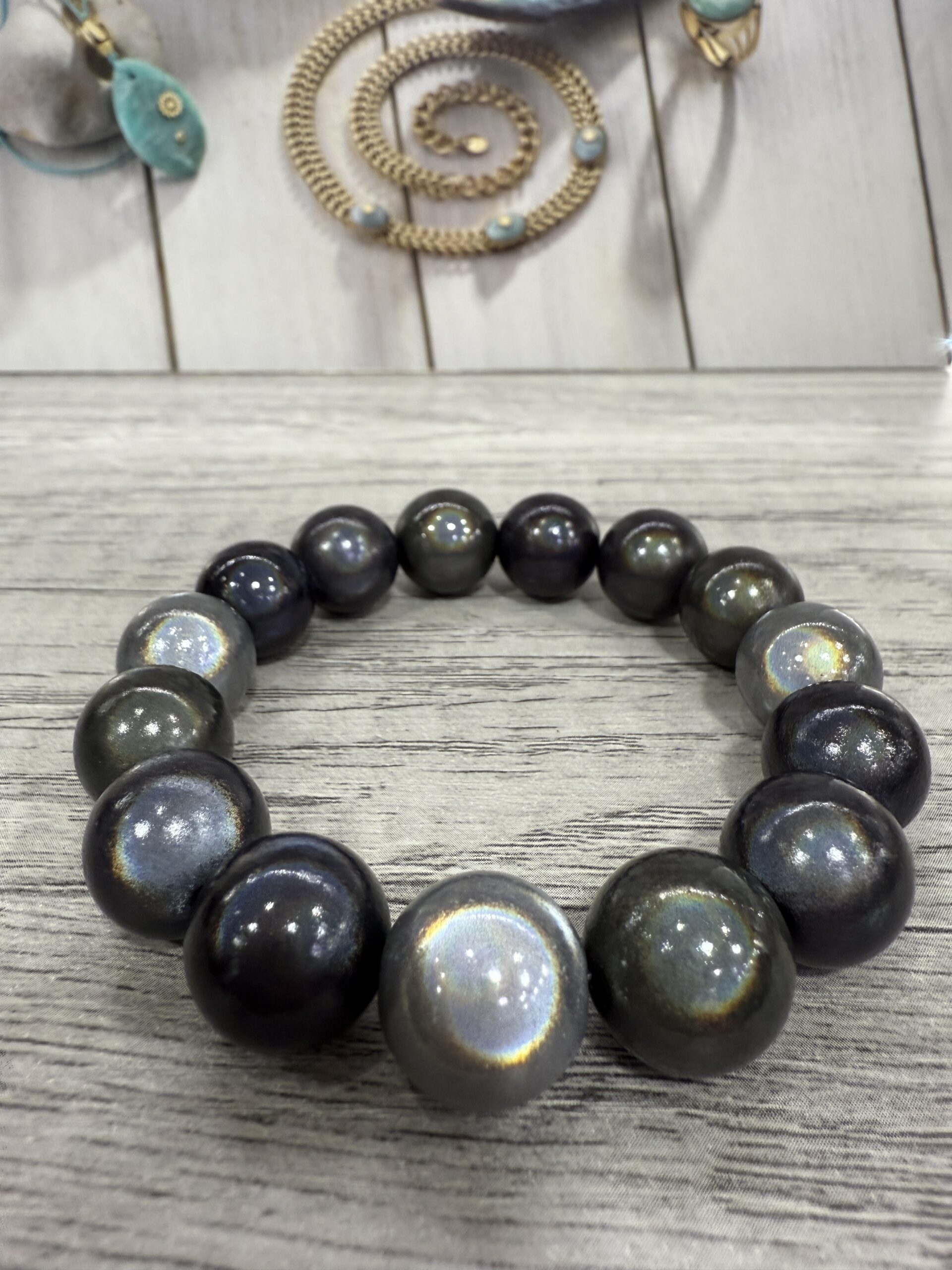 Adoptez ce joli bracelet perles avec un effet 3D en résine gris kaki ! Selon l’exposition à la lumière les couleurs des perles changent, c’est ce qui le rend UNIQUE !