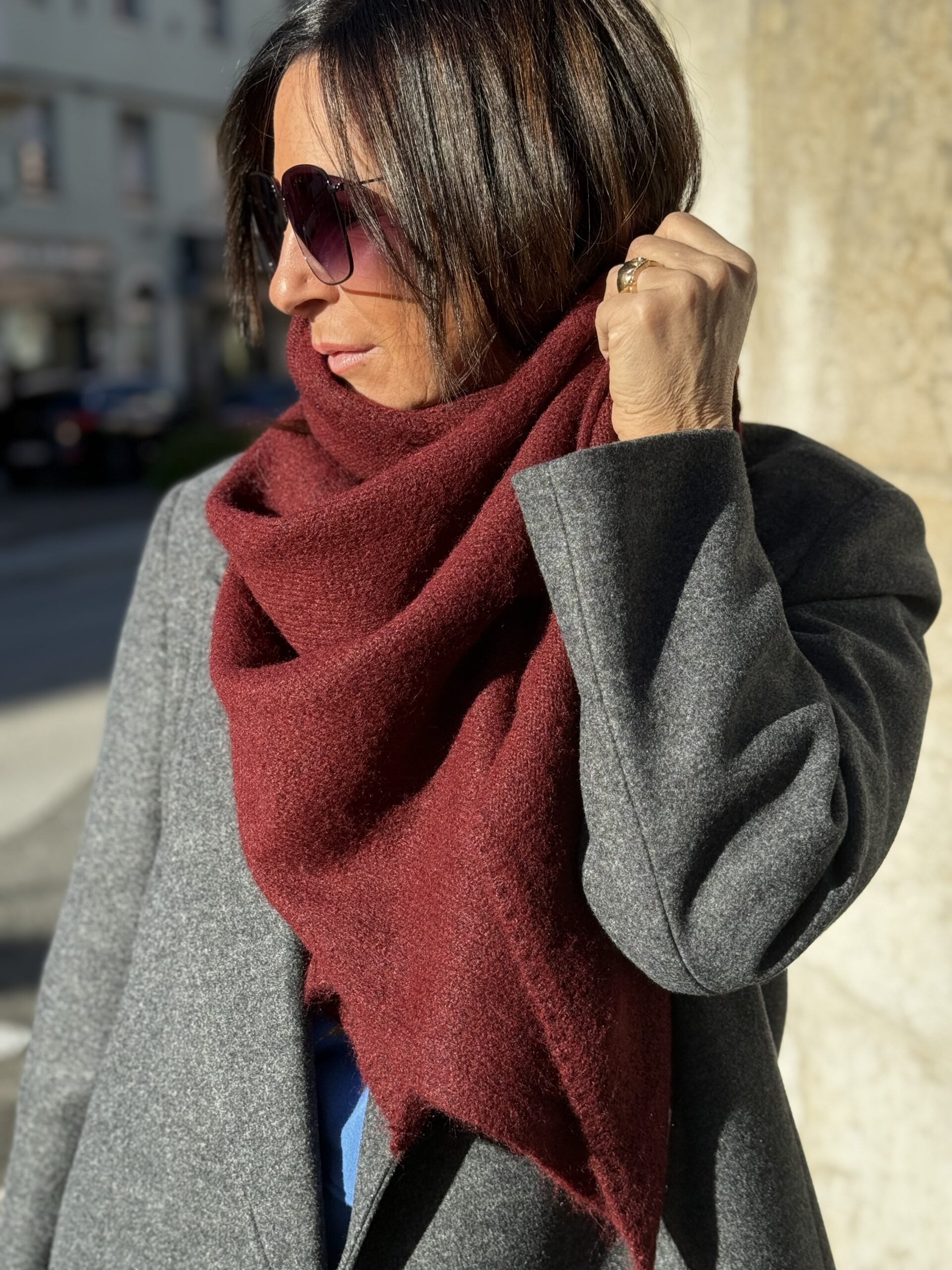 Plongez dans la douceur de l’hiver avec cette somptueuse écharpe en laine bordeaux.