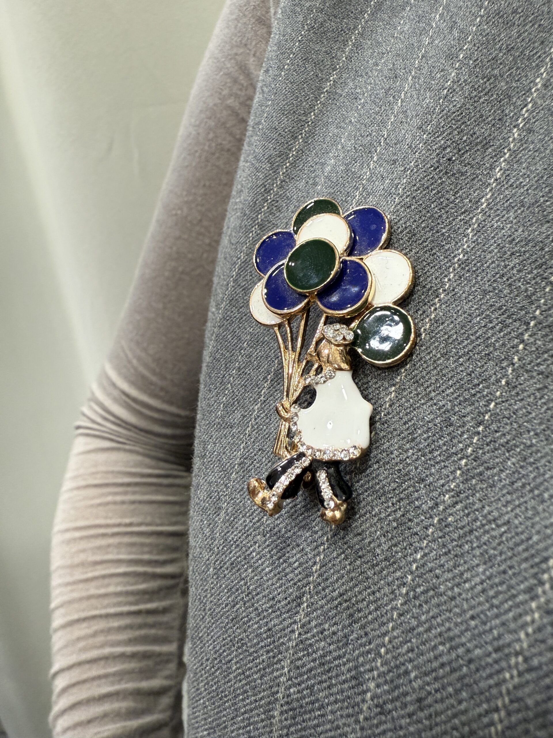 Craquez pour cette broche pleine de charme représentant un petit personnage tenant un bouquet de ballons colorés !