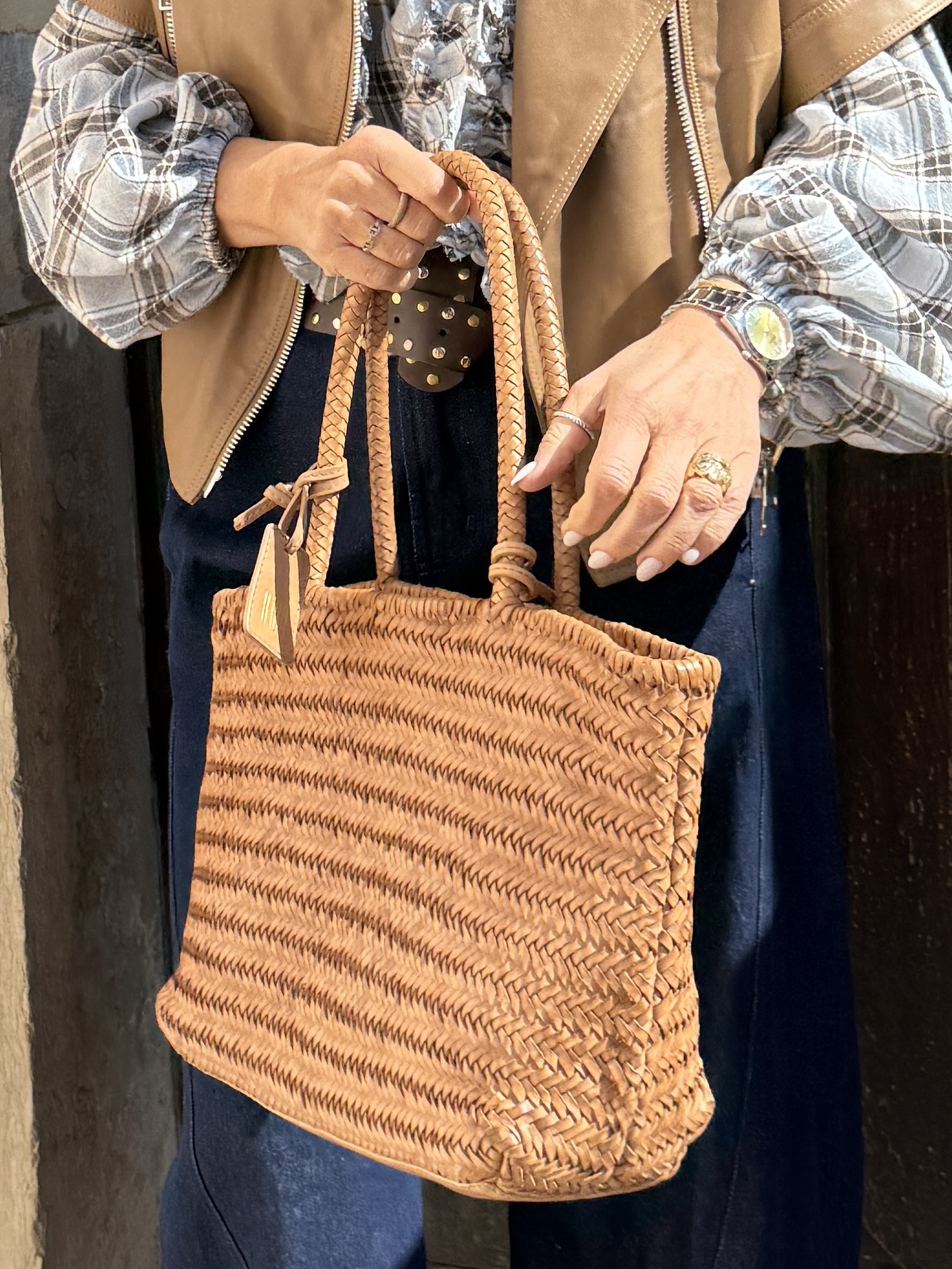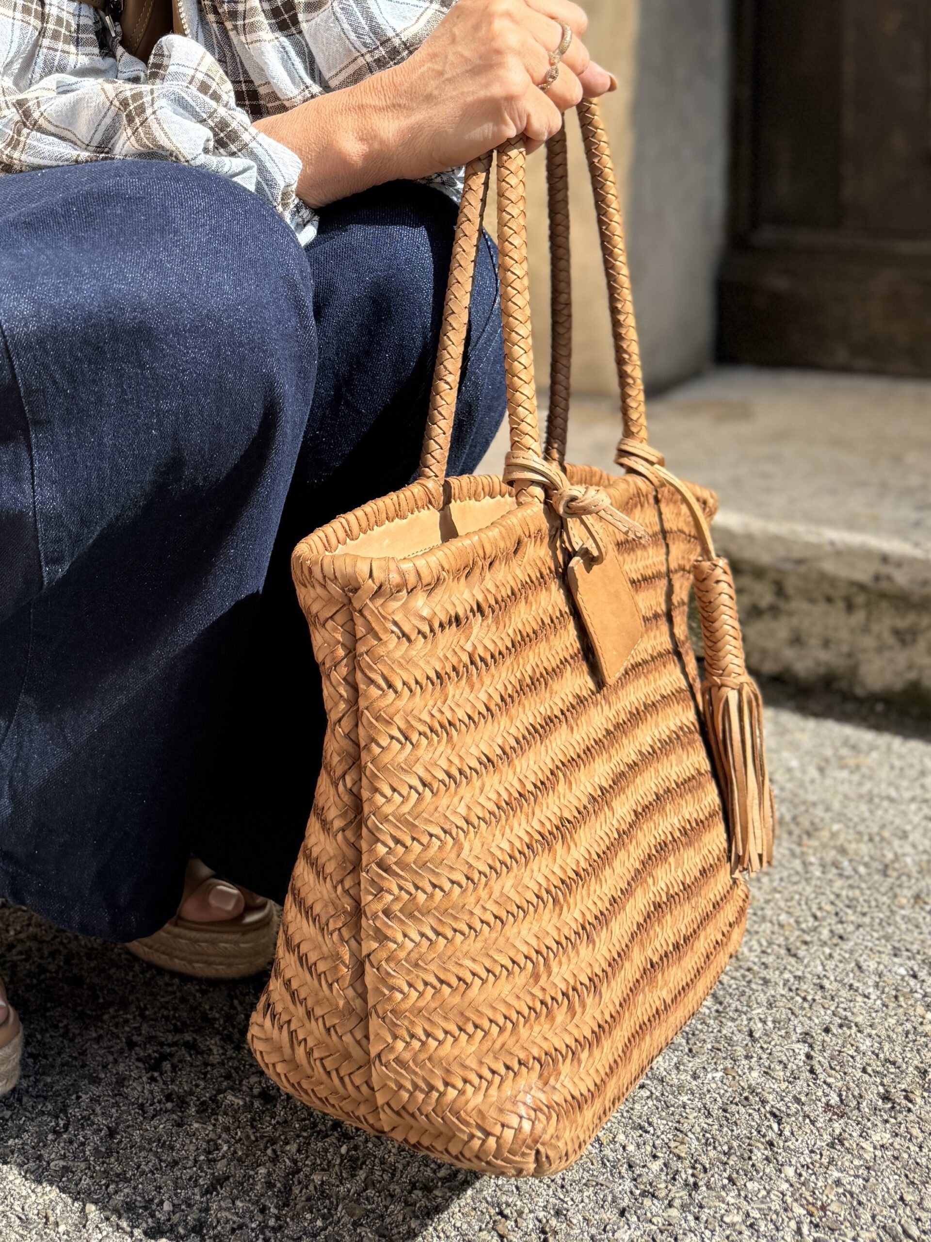 Avec son cuir tressé et sa silhouette généreuse, ce sac incarne l’élégance naturelle et l’esprit estival, idéal pour sublimer les looks du quotidien avec une touche bohème chic.