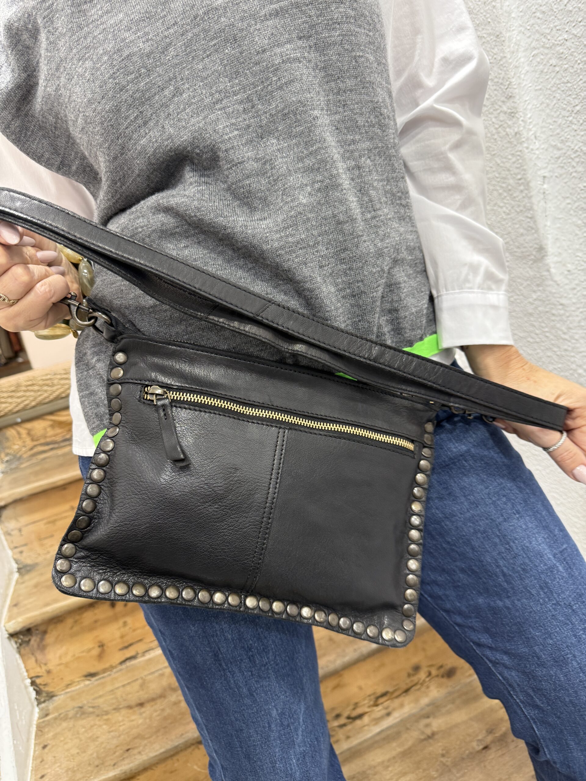 Purchase & earn 10 points!Ce sac bandoulière cloutée en cuir noir sera votre allié pour la vie de tous les jours !