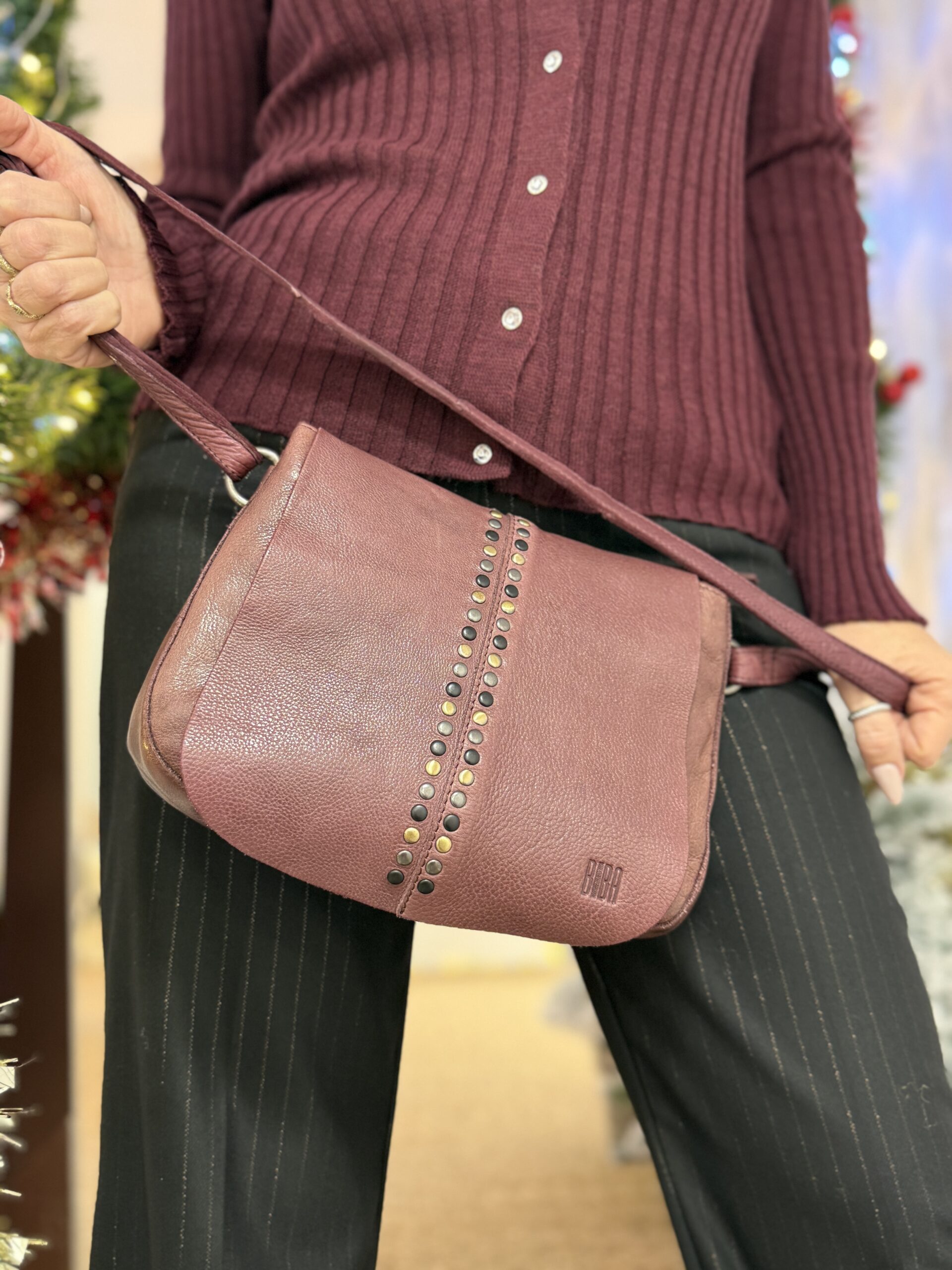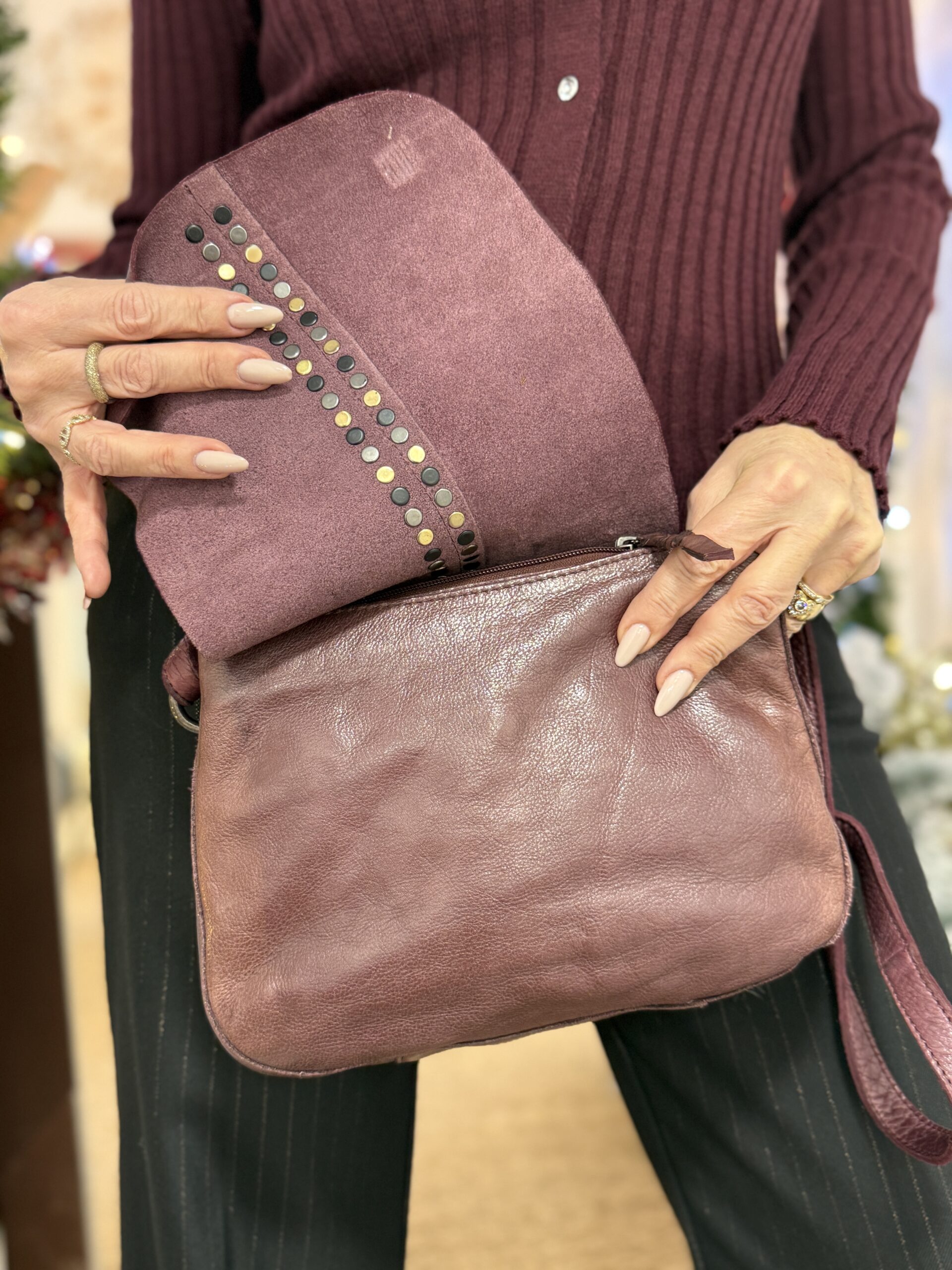 Sac bandoulière en cuir avec un rabat à clous prune