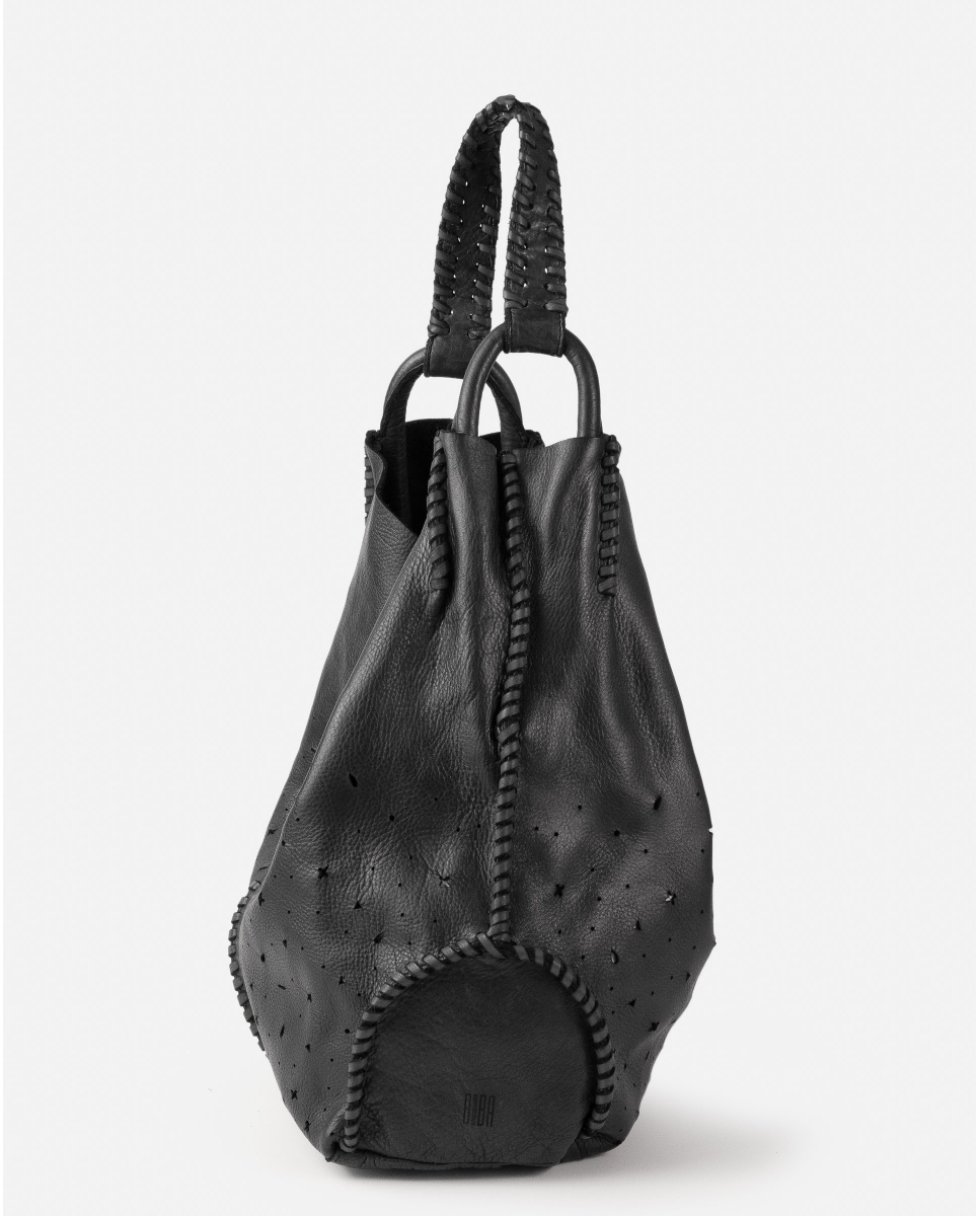 Un sac en cuir noir au design souple et audacieux, rehaussé de détails tressés et de perforations délicates pour une allure contemporaine et sophistiquée.