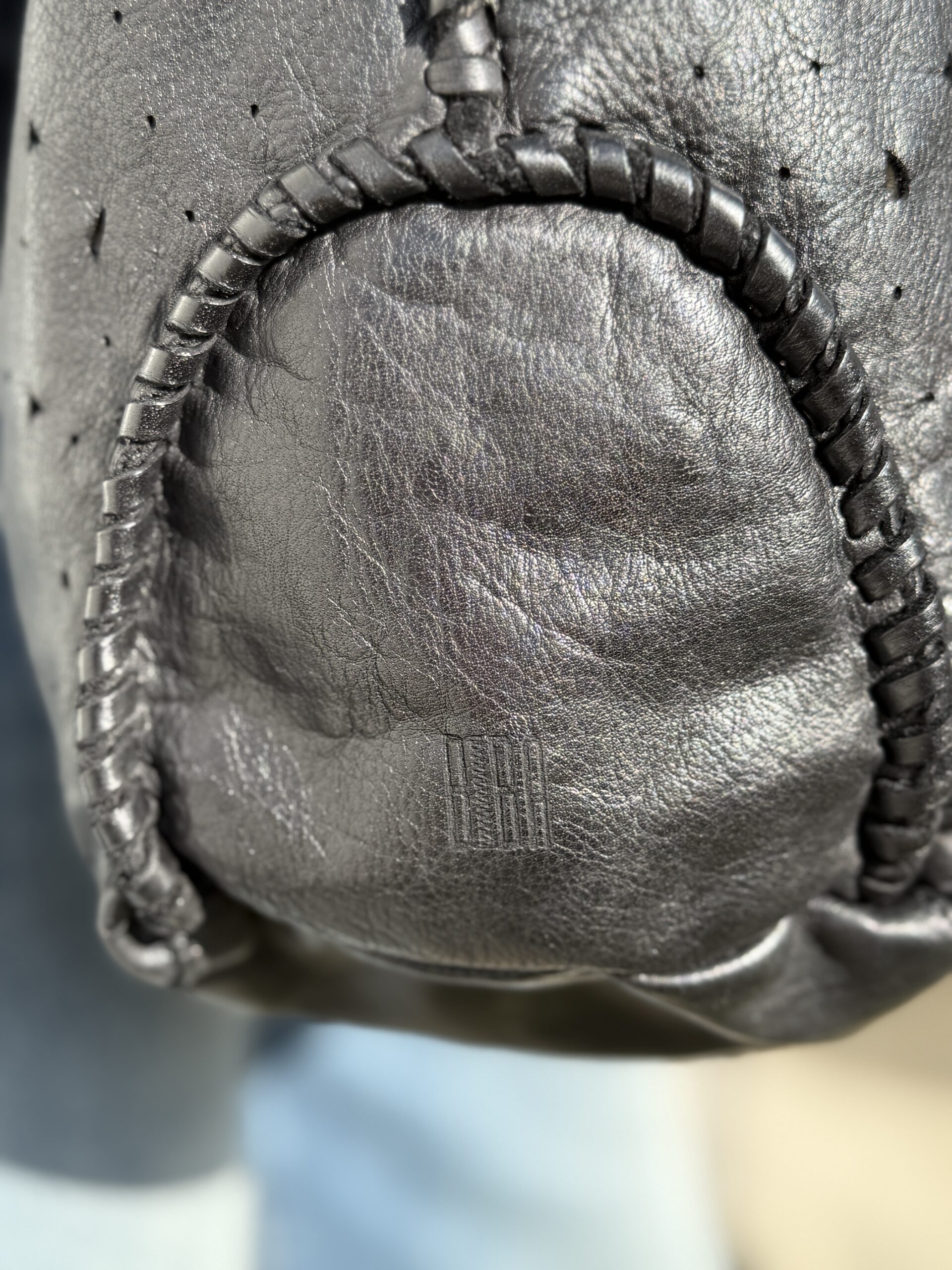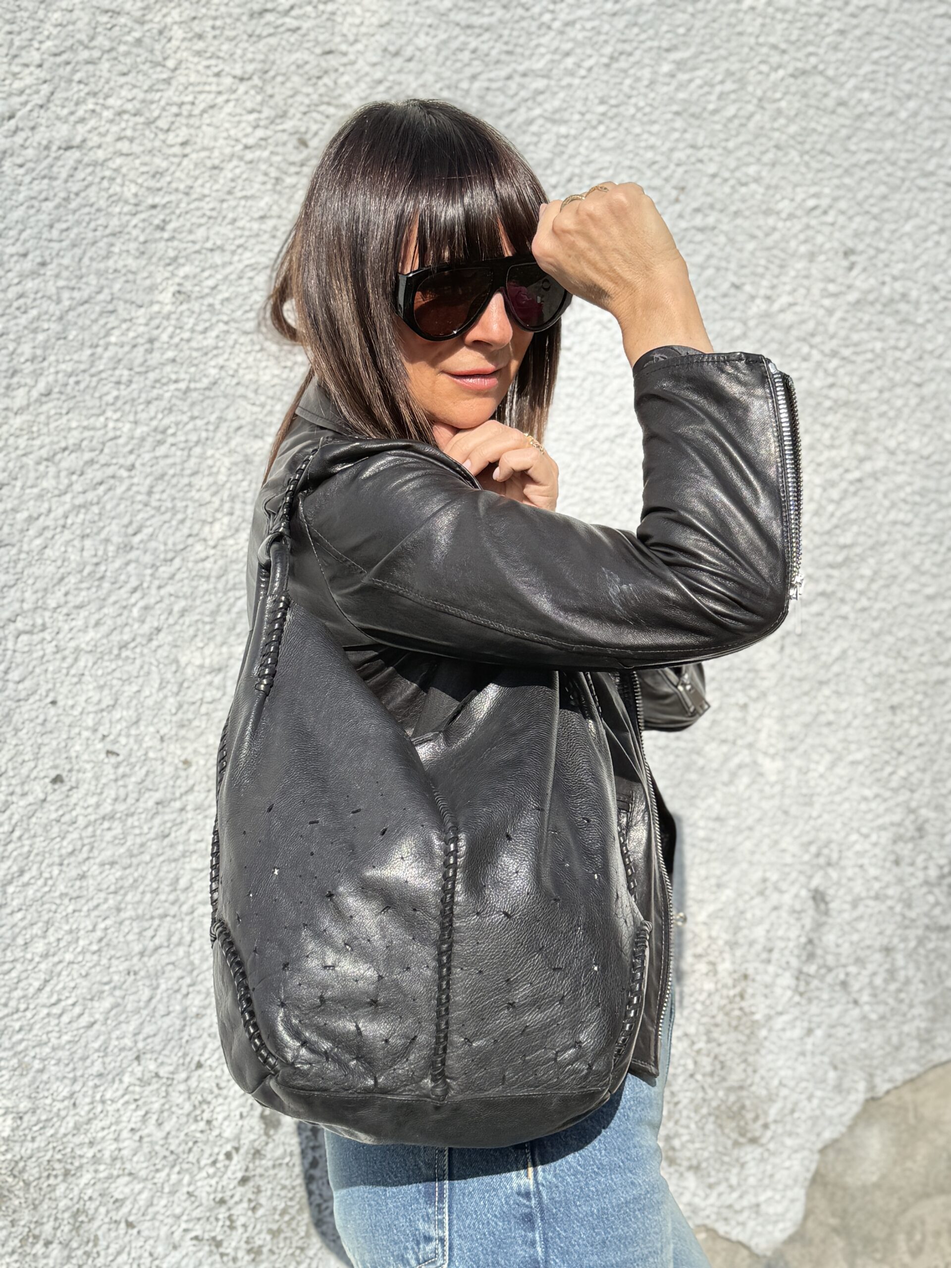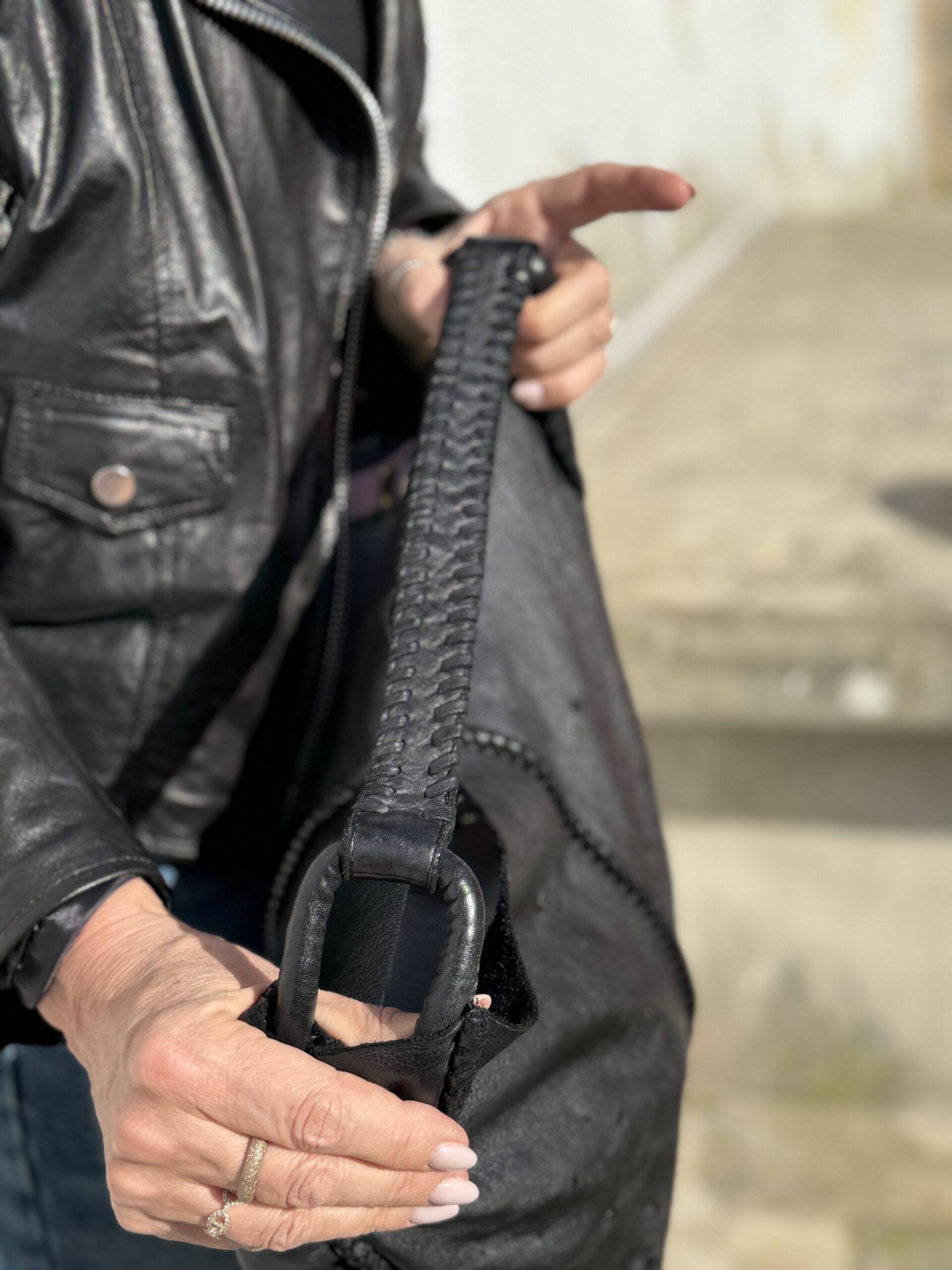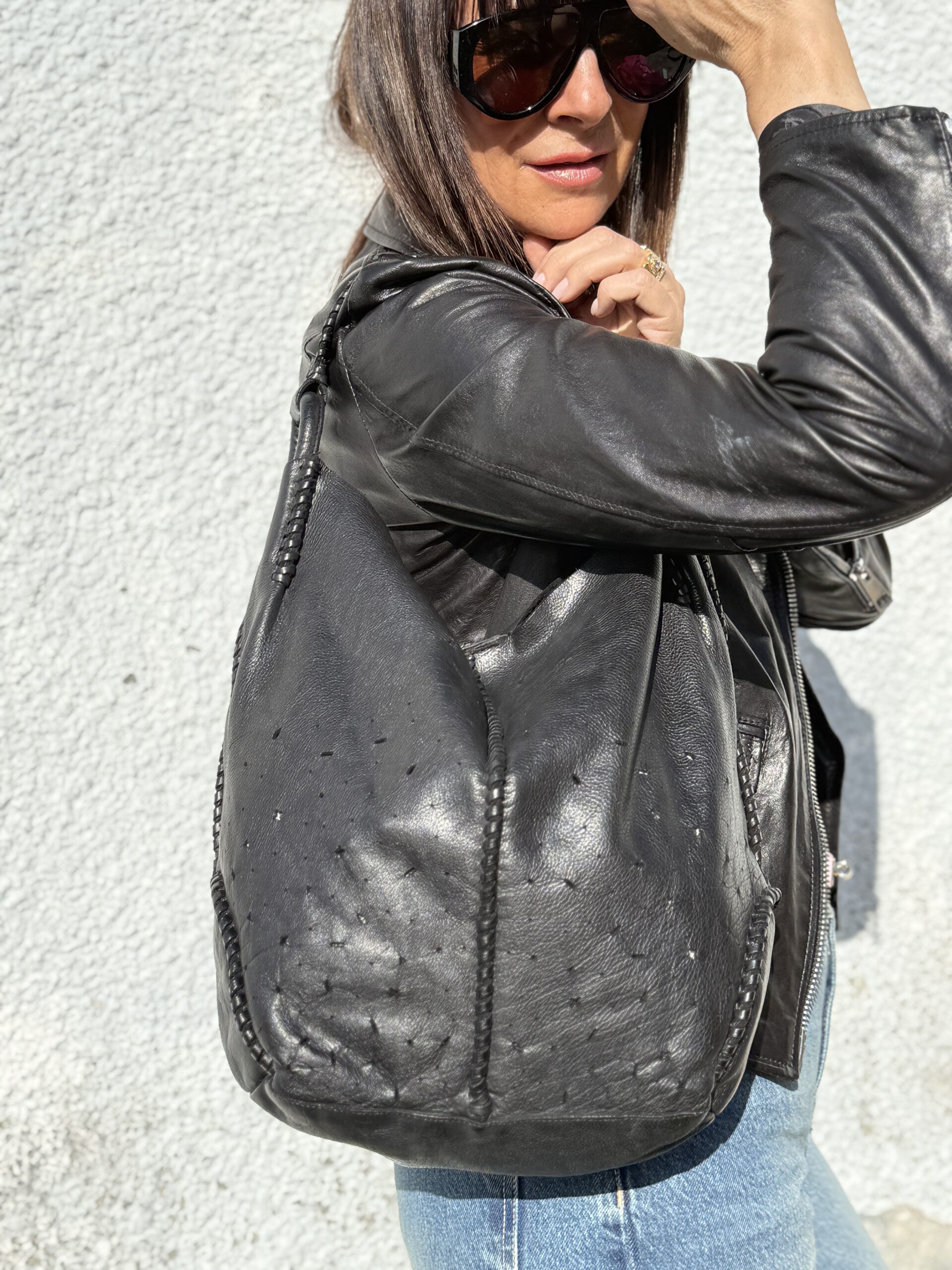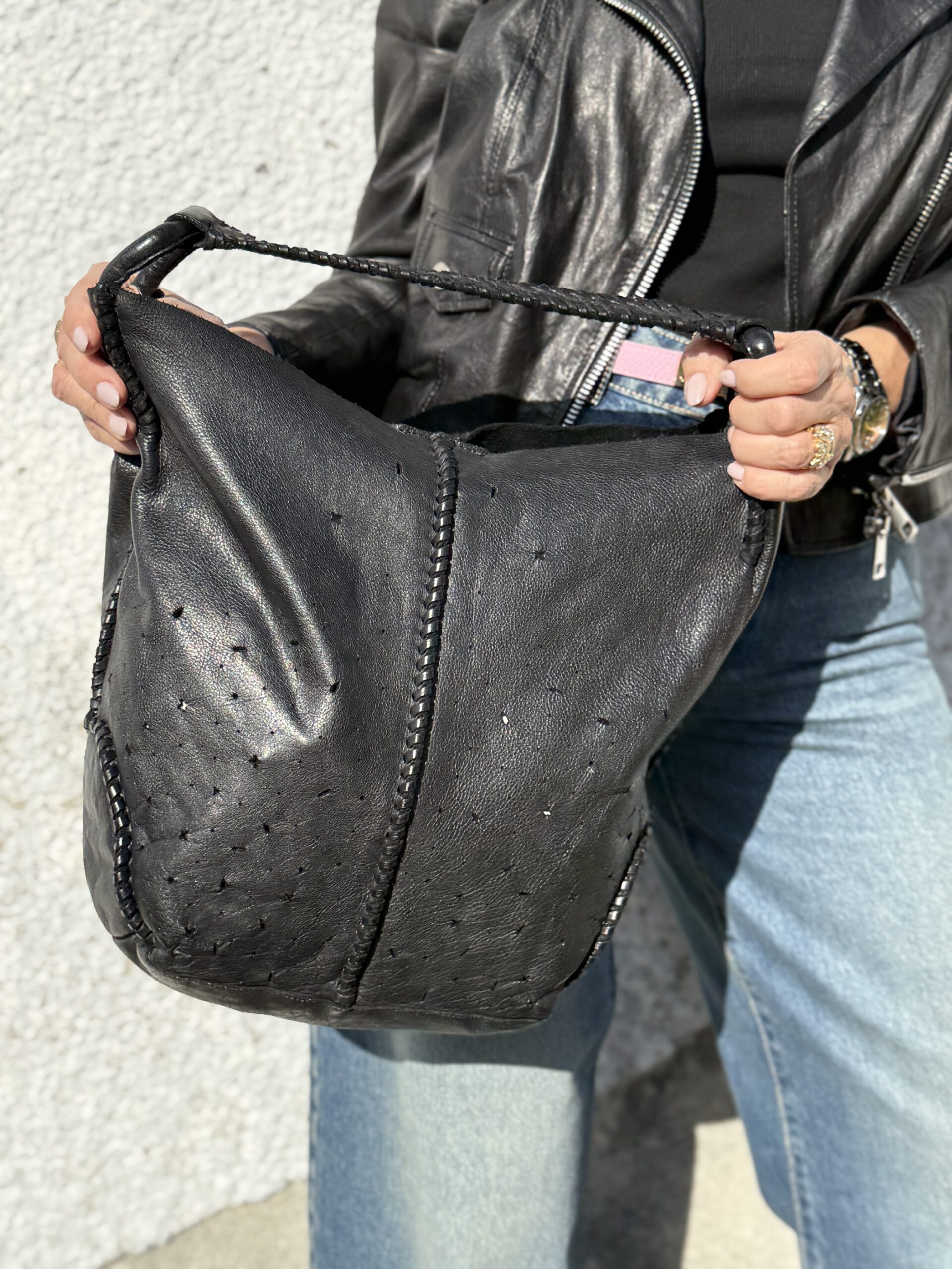 Un sac en cuir noir au design souple et audacieux, rehaussé de détails tressés et de perforations délicates pour une allure contemporaine et sophistiquée.