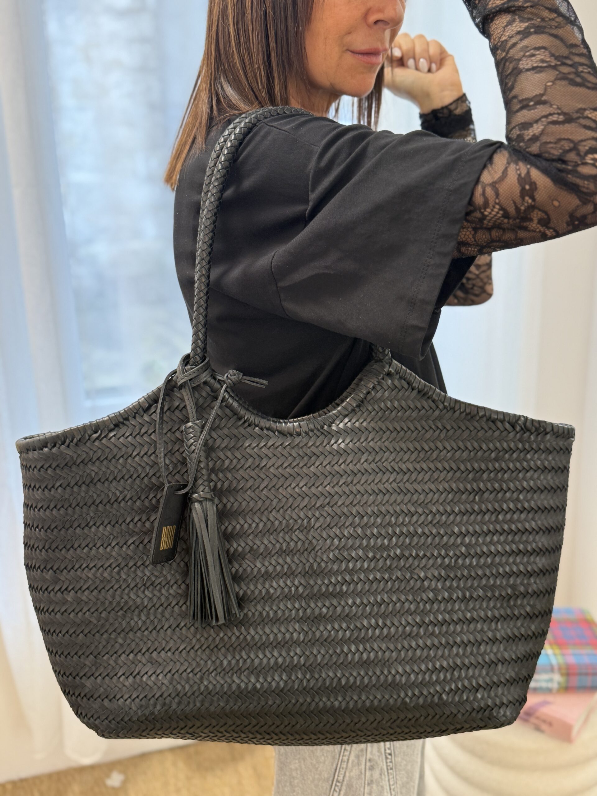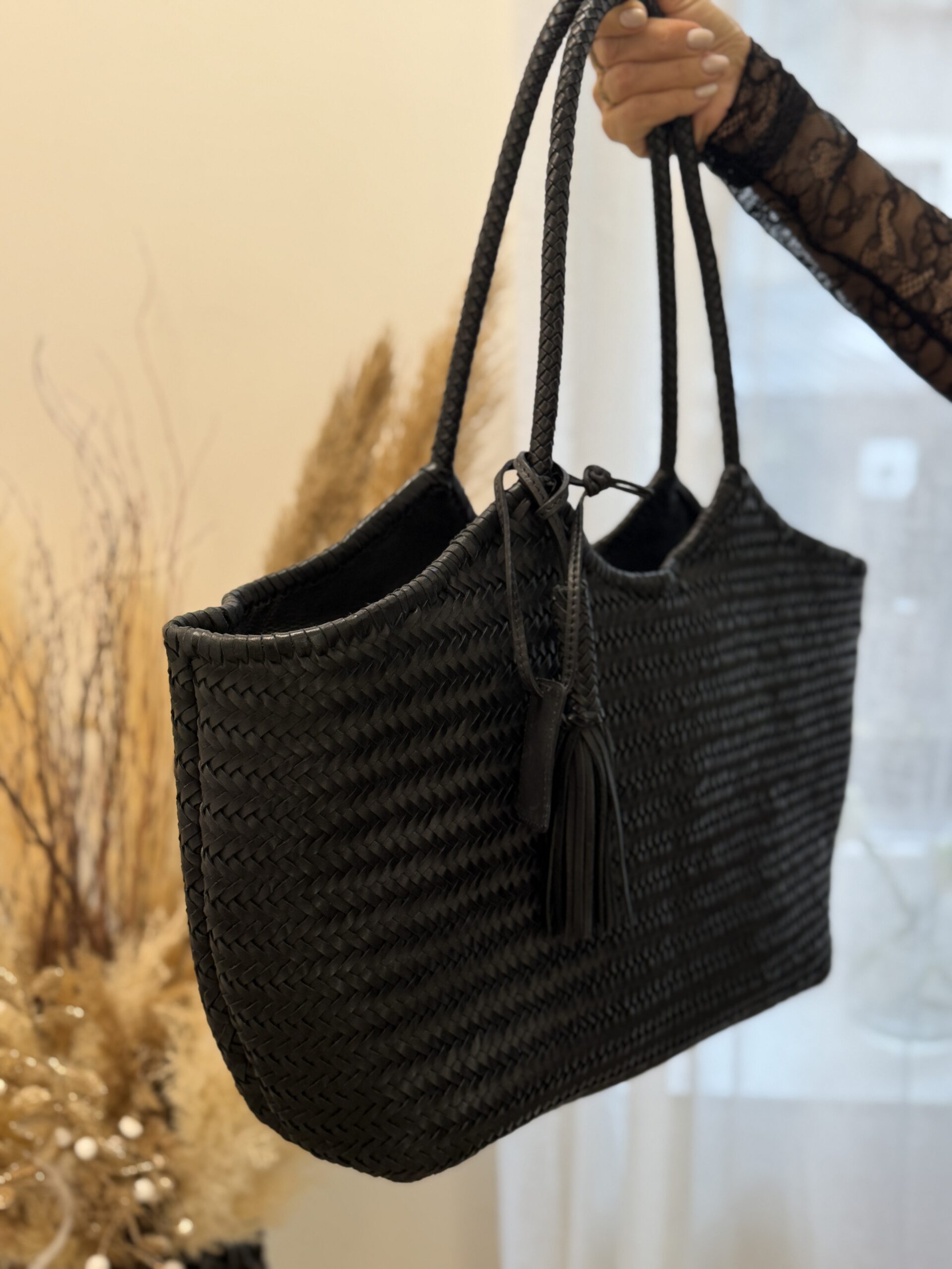 Ce sac tressée est l’allié parfait des silhouettes solaires : chic sans effort, naturel mais terriblement désirable. Il apporte instantanément une allure bohème raffinée.