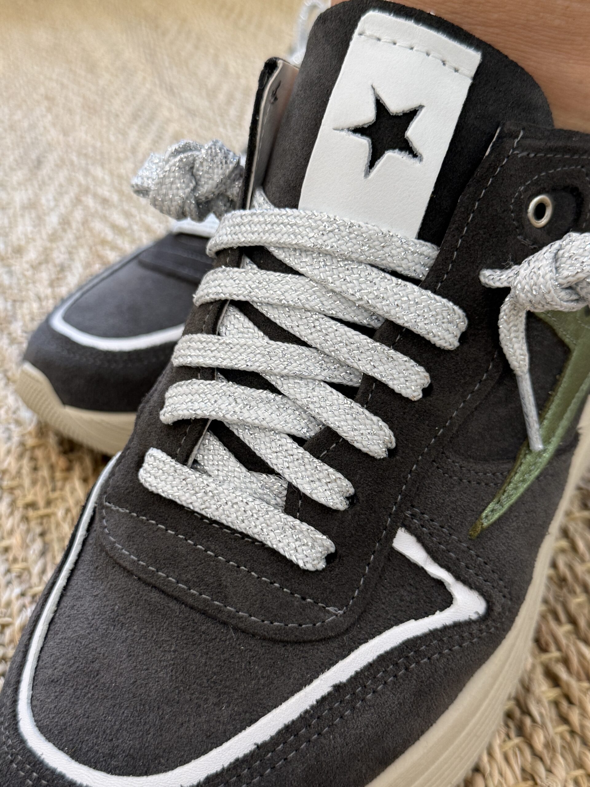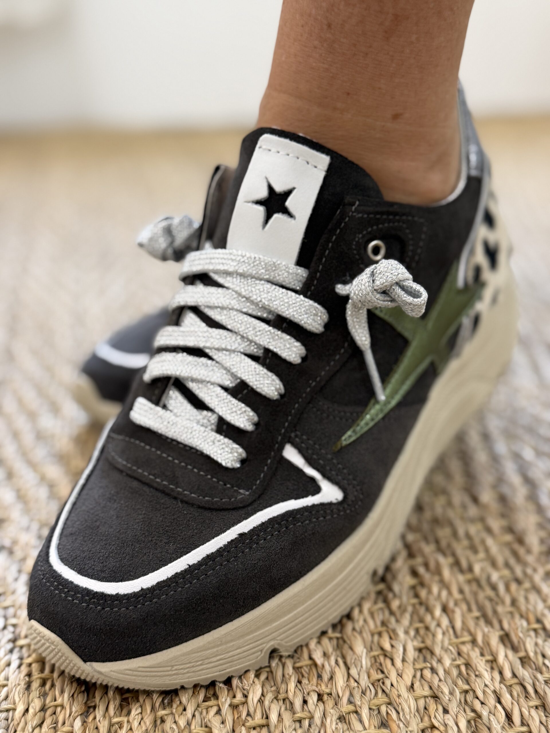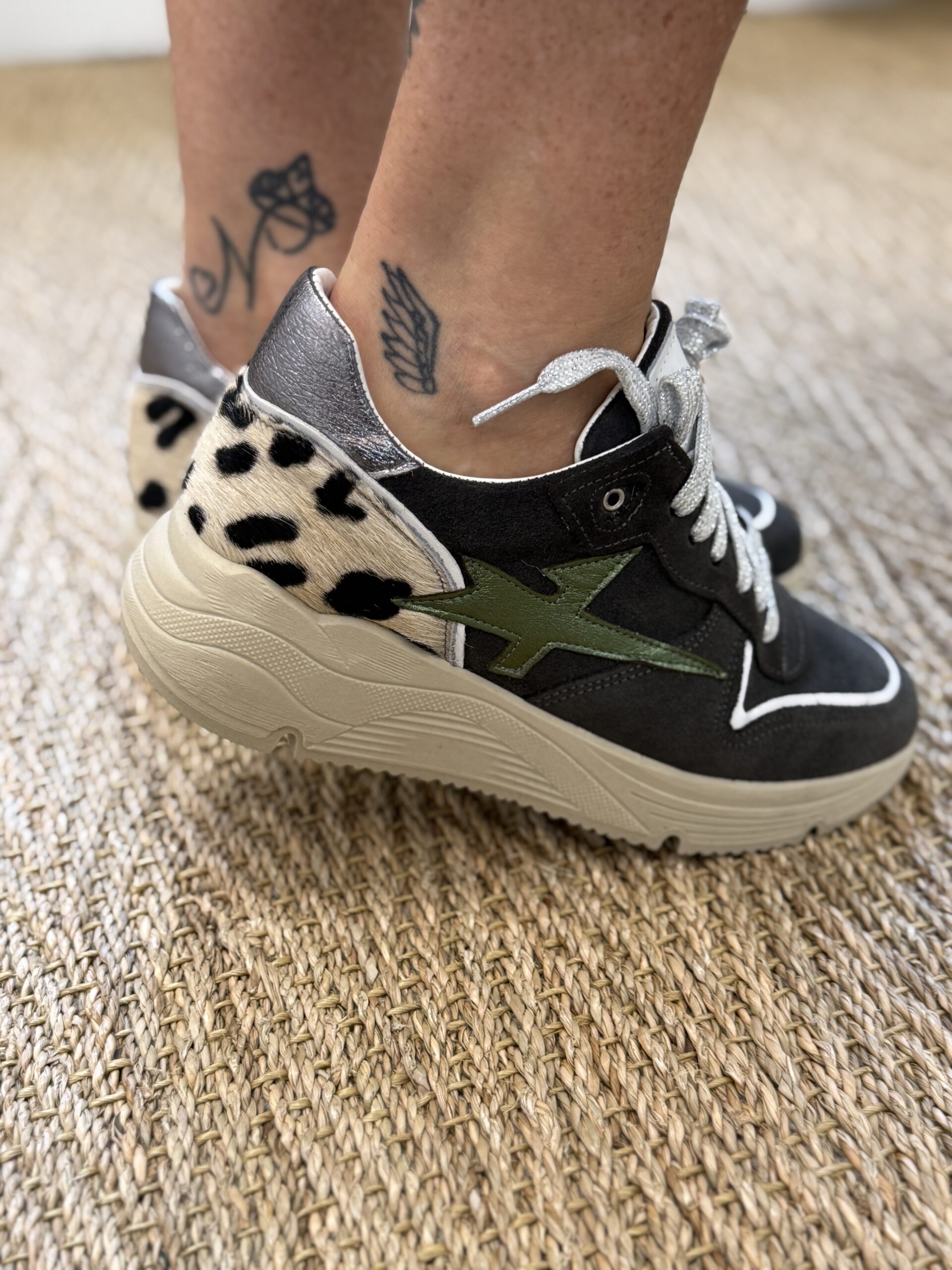 Les baskets en cuir suédé gris et imprimé animal mêlent caractère et confort dans un design résolument contemporain. La tige en daim gris et rehaussée de détails contrastés avec un empiècement arrière, imprimé animal et des lacets verts vif qui apportent une touche mode assurée !