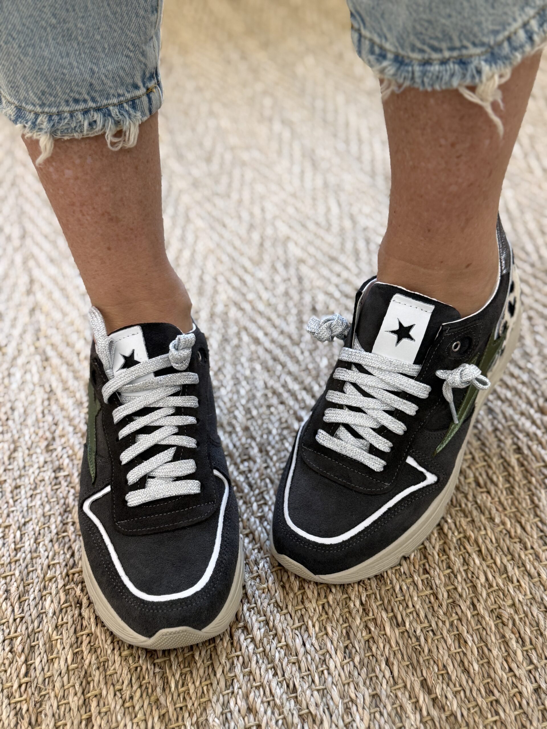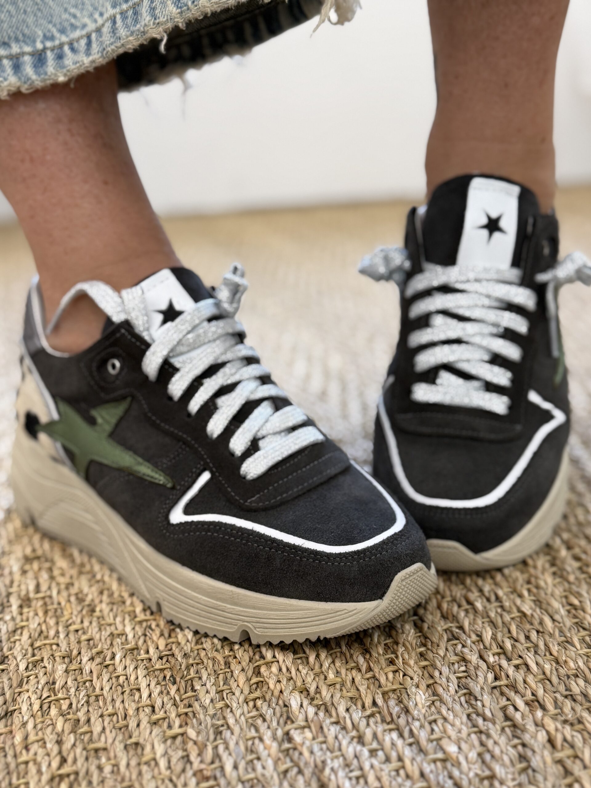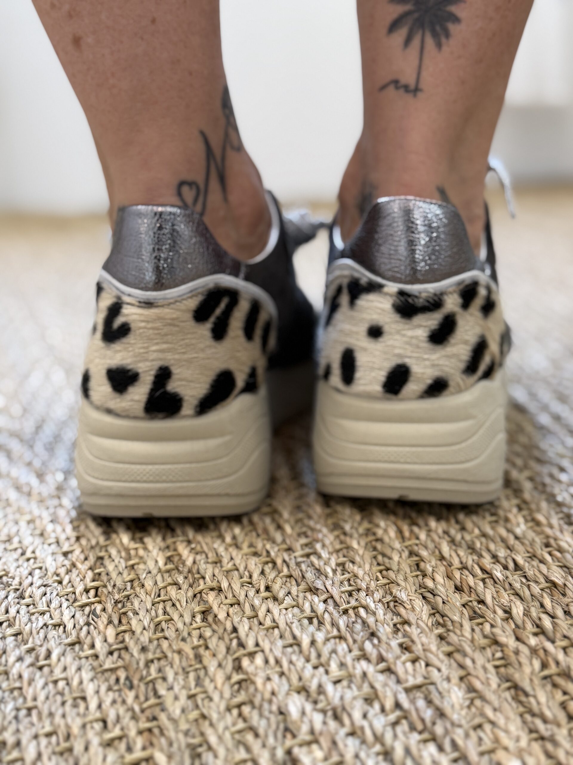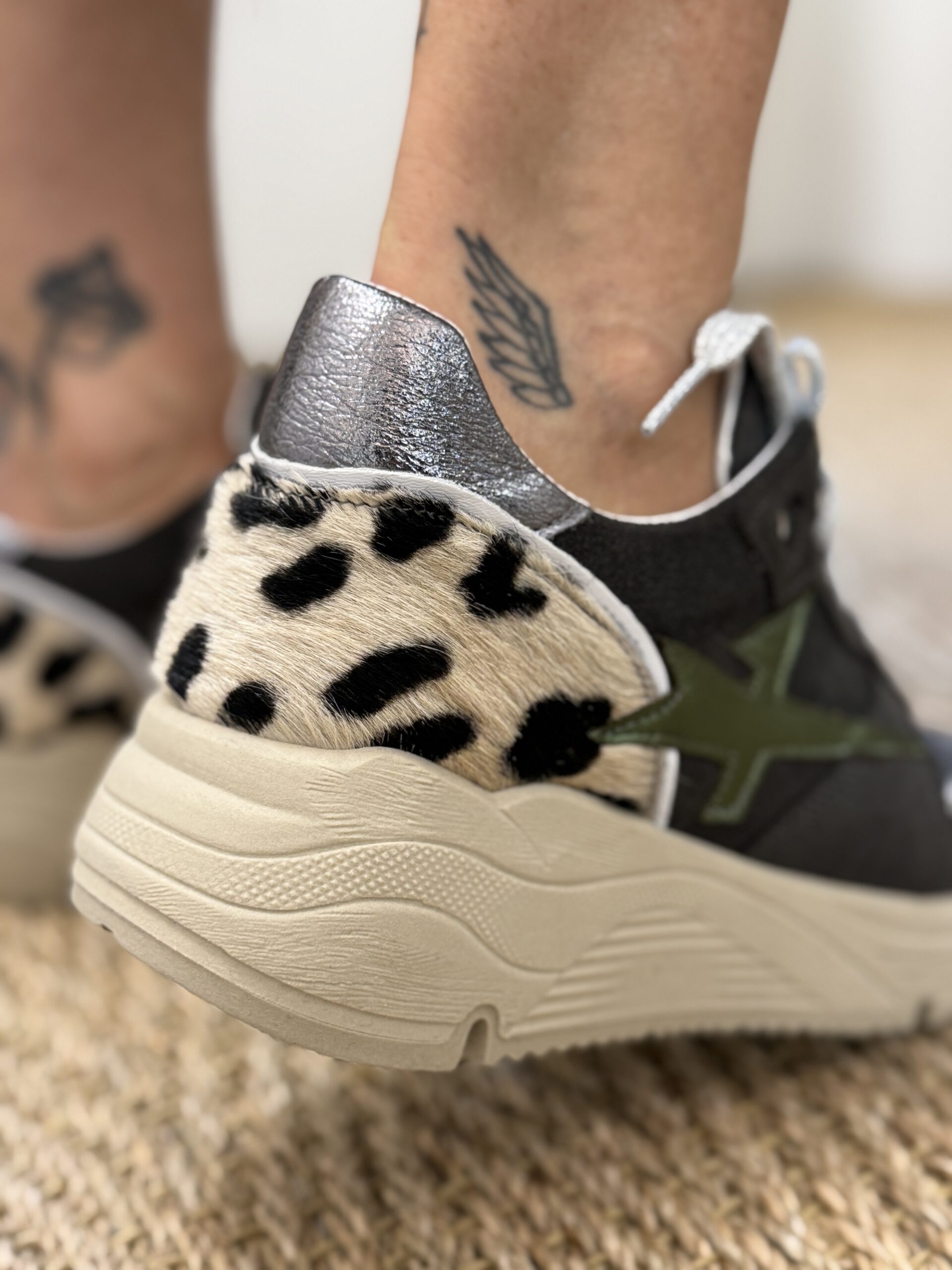 Les baskets en cuir suédé gris et imprimé animal mêlent caractère et confort dans un design résolument contemporain. La tige en daim gris et rehaussée de détails contrastés avec un empiècement arrière, imprimé animal et des lacets verts vif qui apportent une touche mode assurée !
