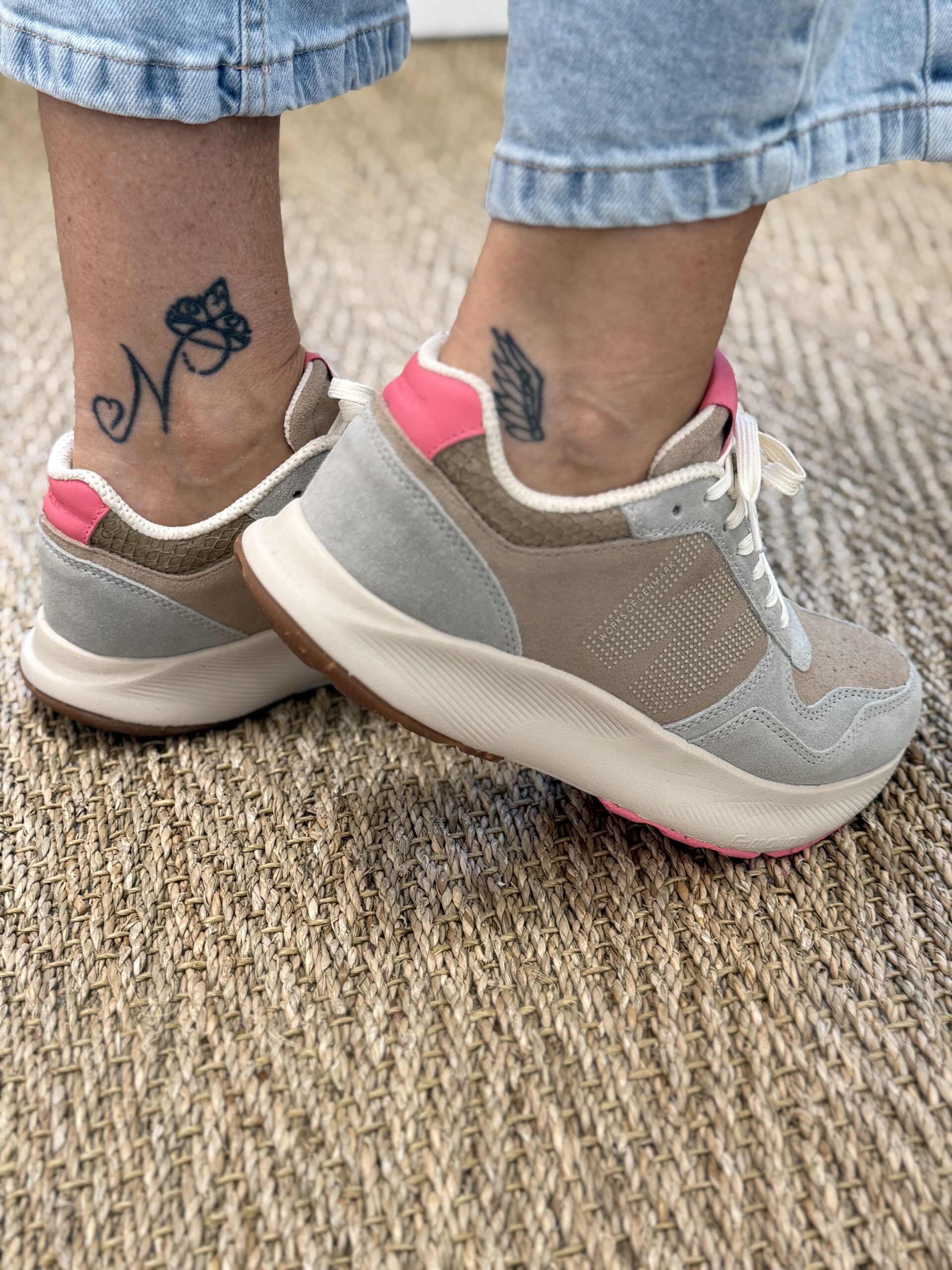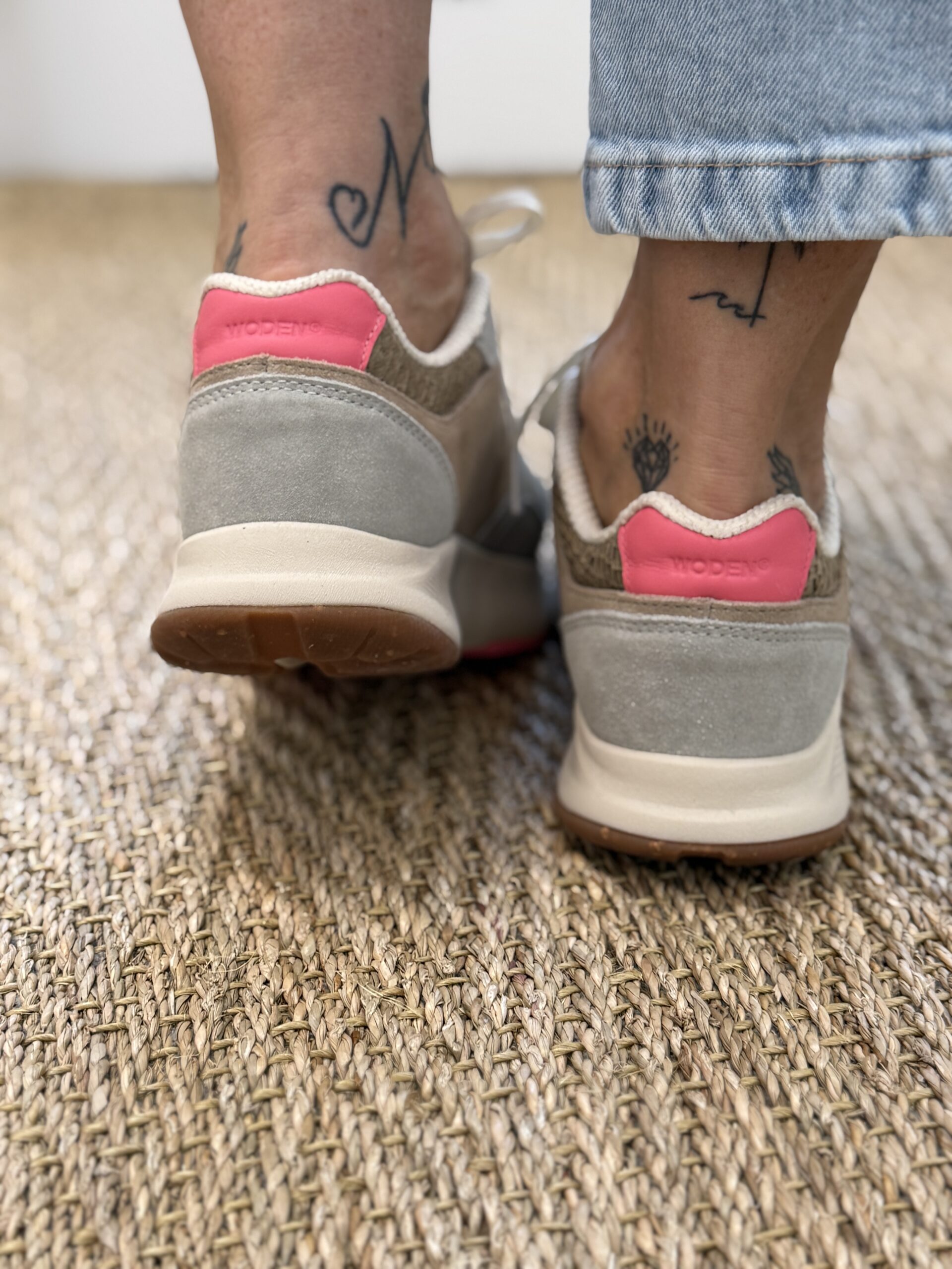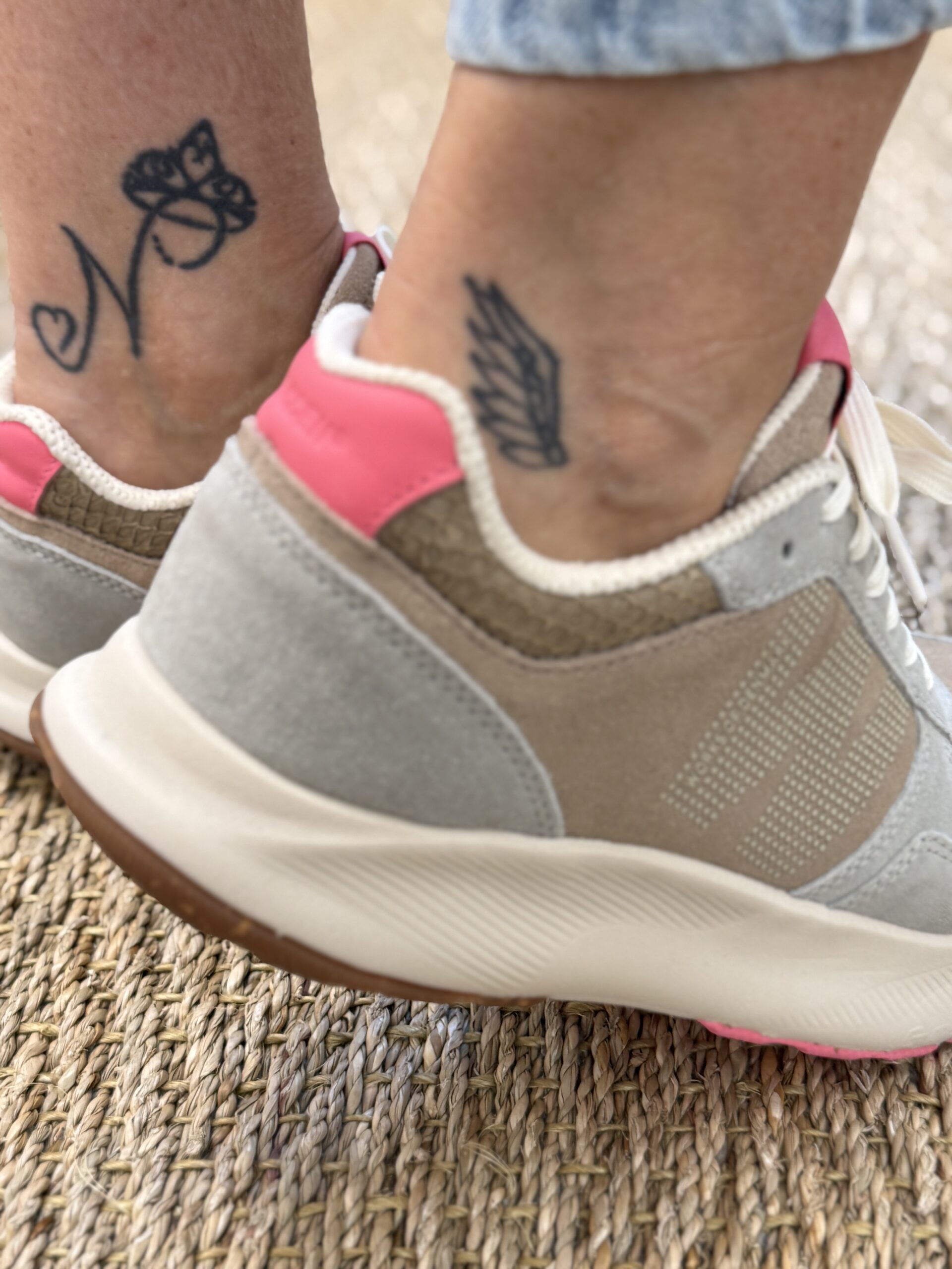 La basket « Mathilde » Runner allie un design sportif à des lignes épurées et à des matériaux éco-responsables. Son empeigne associe du daim certifié et du cuir de poisson recyclé, créant un style moderne à la texture subtile. Sa semelle légère assure un confort optimal tout au long de la journée