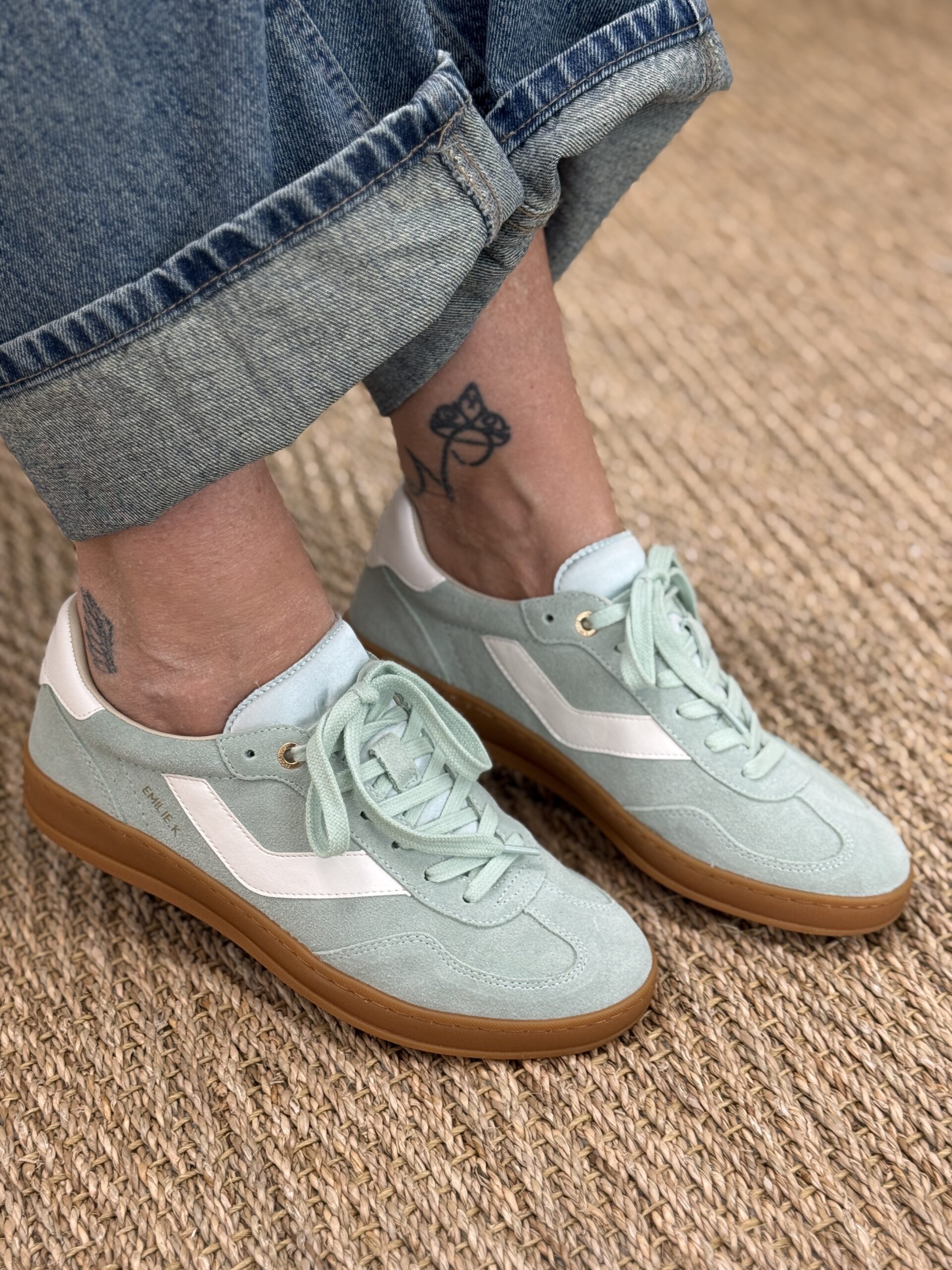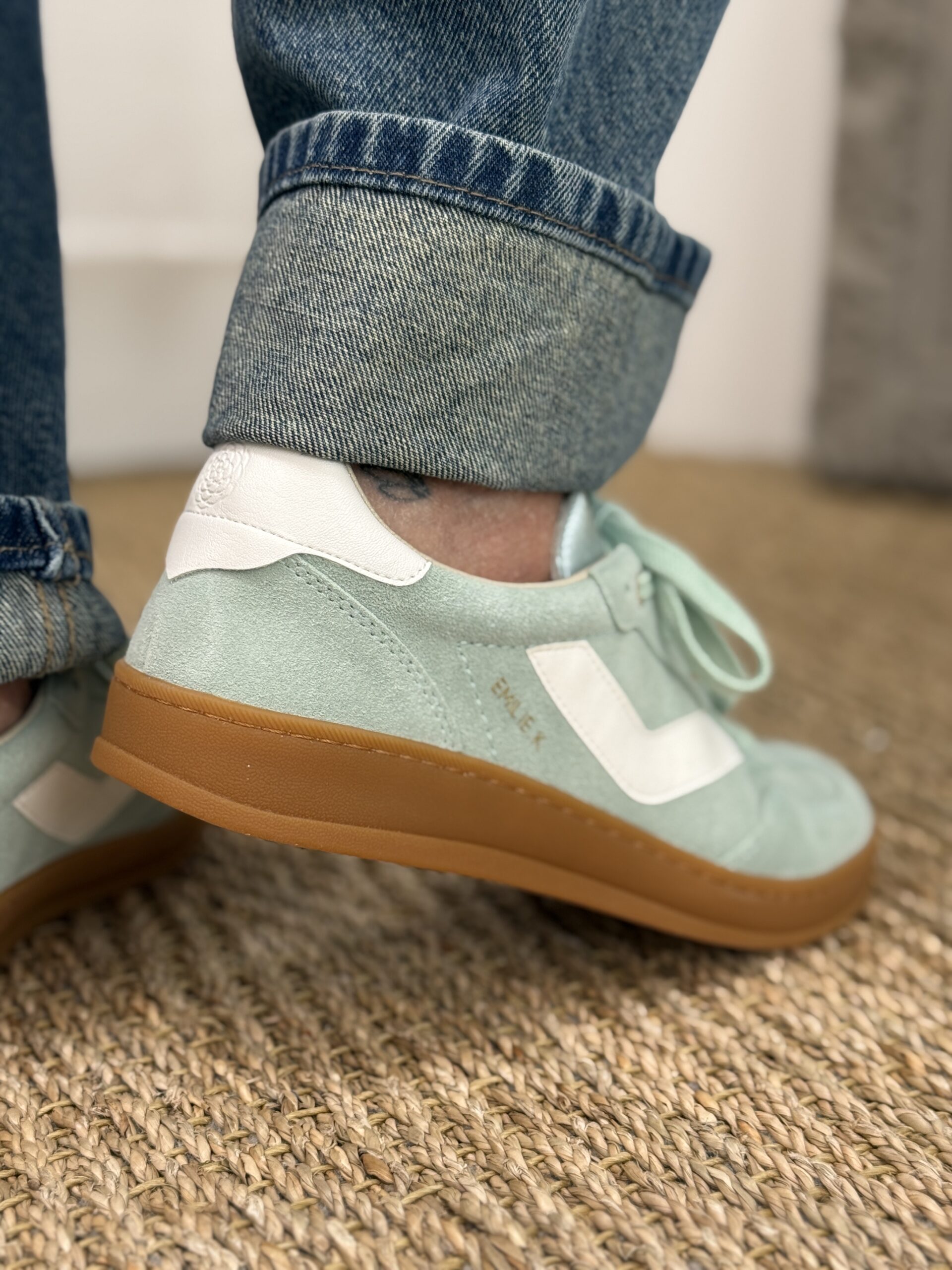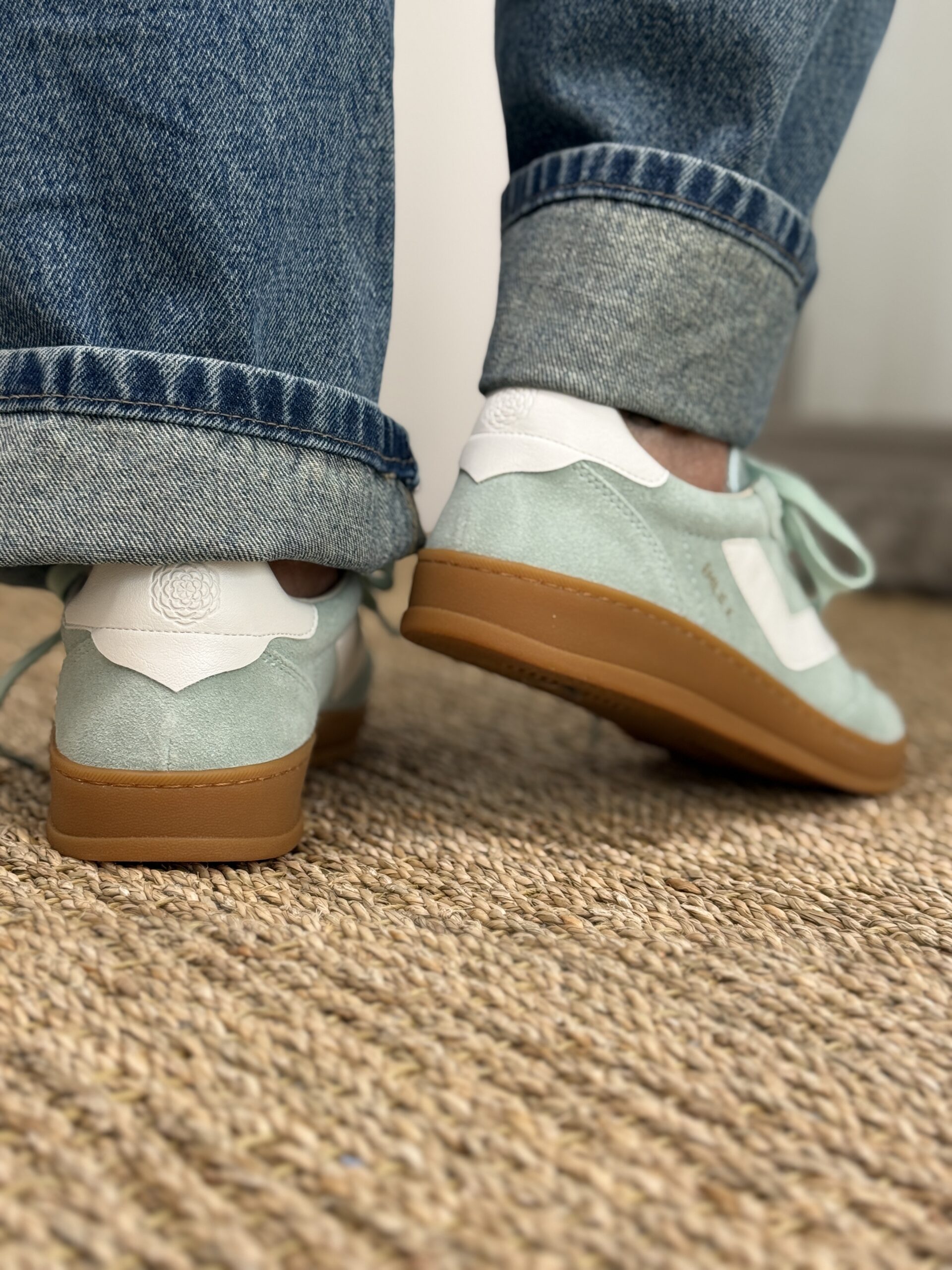 Une basket minimaliste et élégante en suède vert pastel, relevée par un empiècement blanc et une semelle gomme.Un design doux et moderne, parfait pour un style casual chic au quotidien.