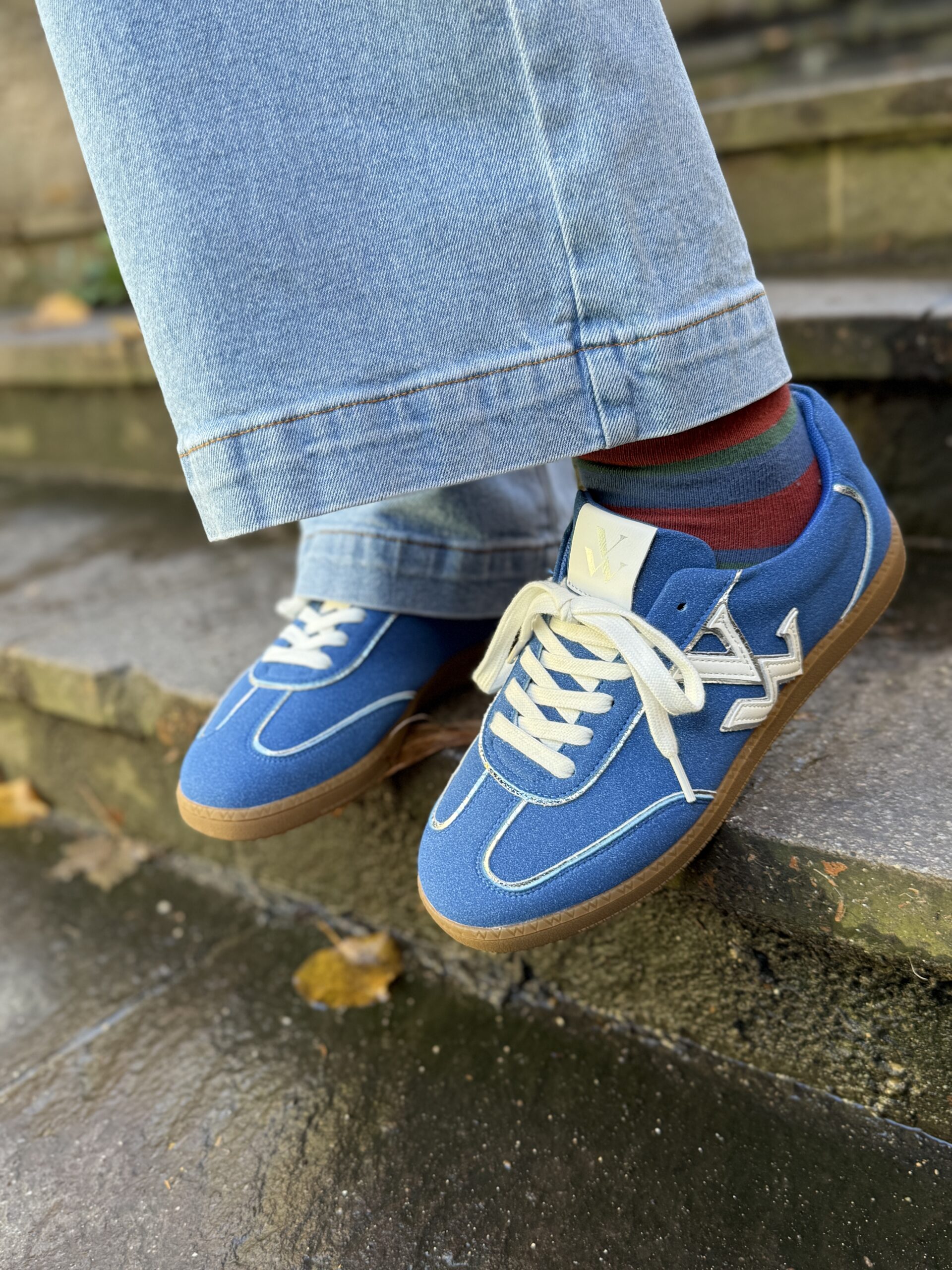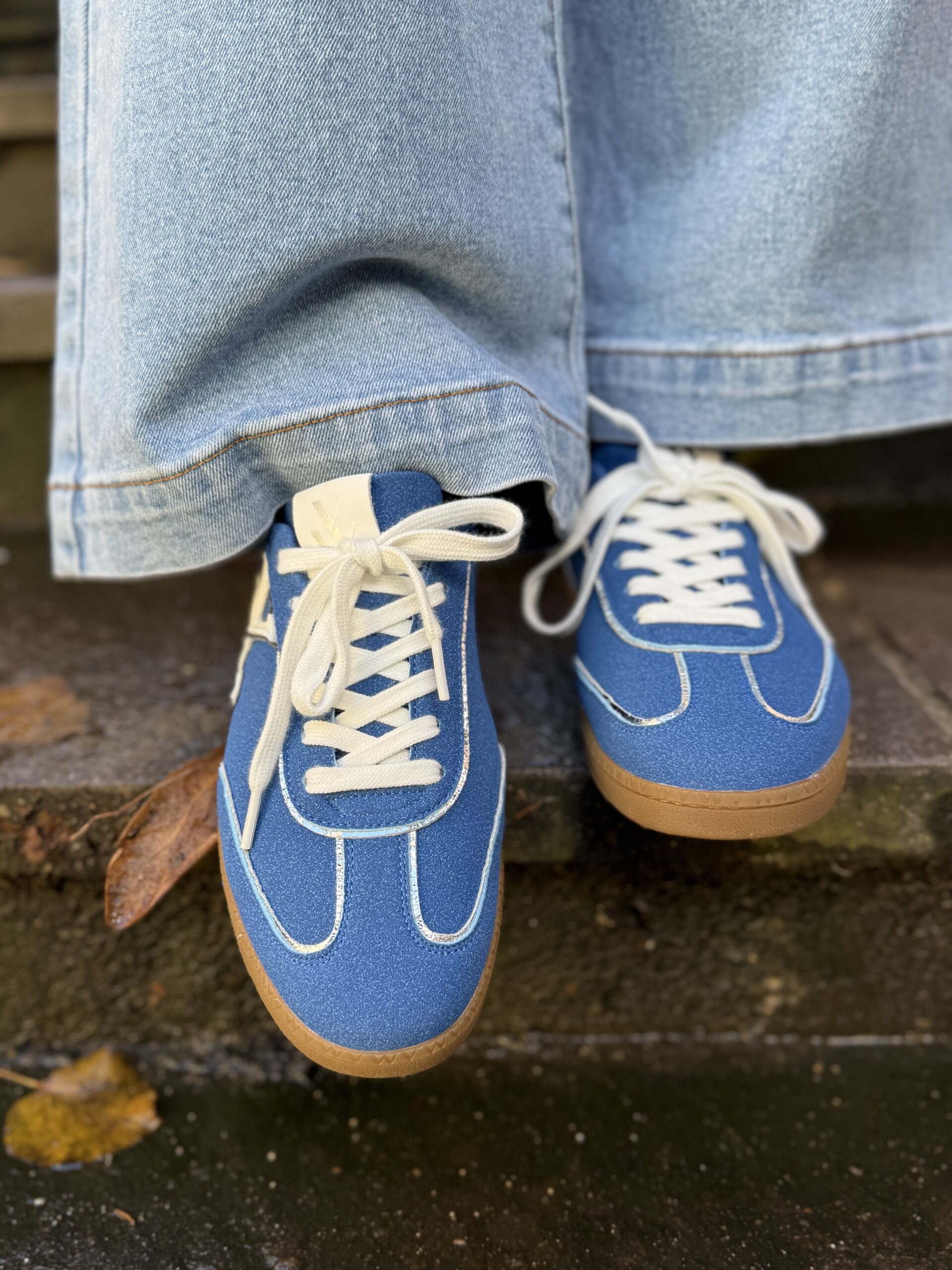 Ces baskets en suédine Sarah effet daim bleu revisitent le style vintage des sneackers des années 70.