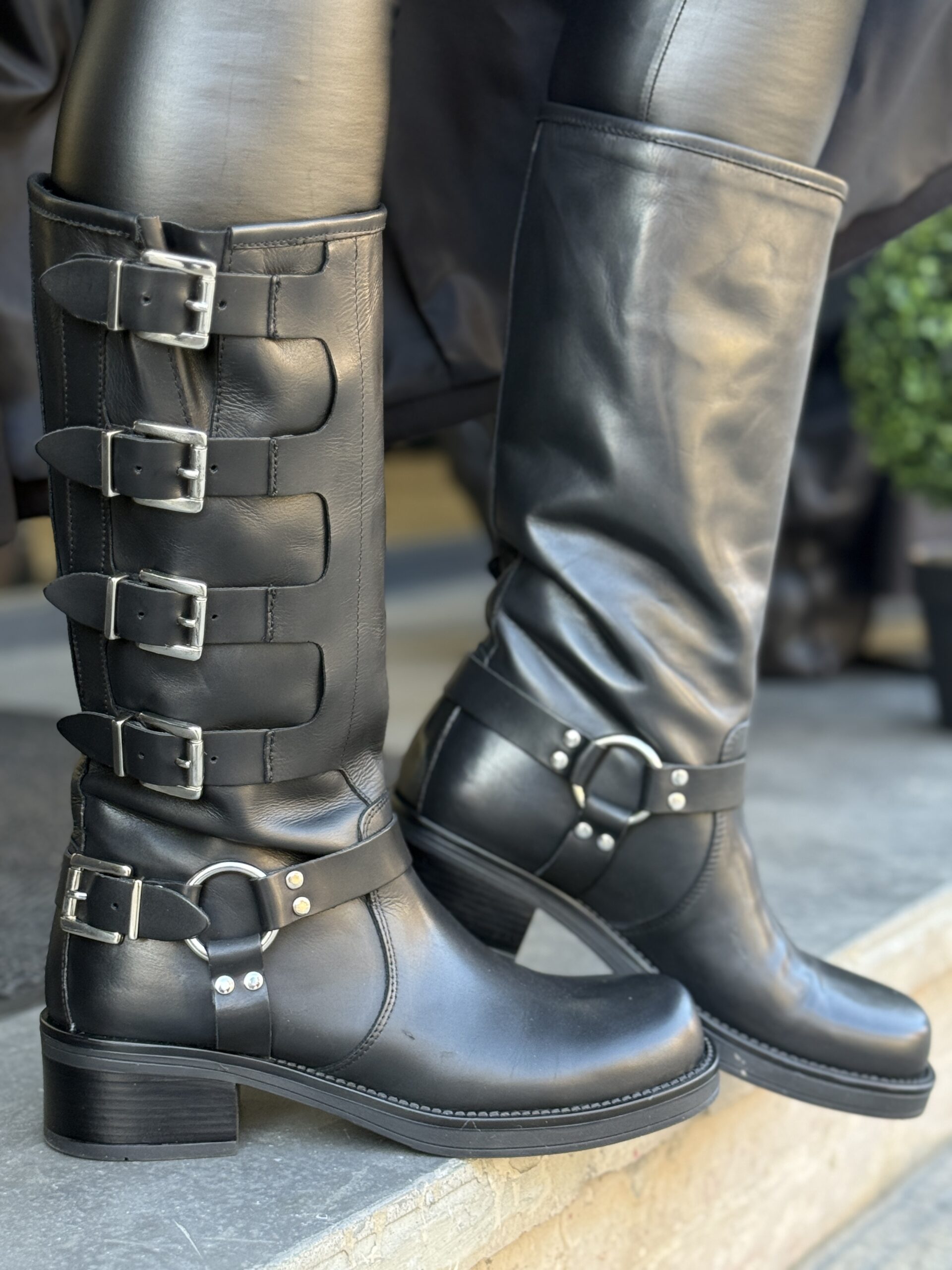 Affirmez votre style avec ces bottes noires en cuir et boucles argentés esprit biker chic au design audacieux et intemporel !