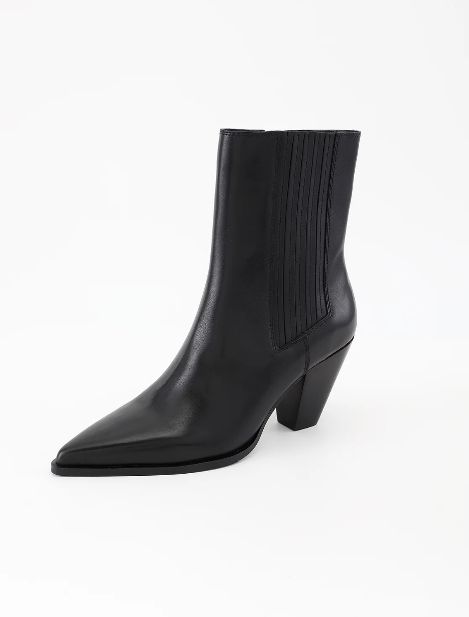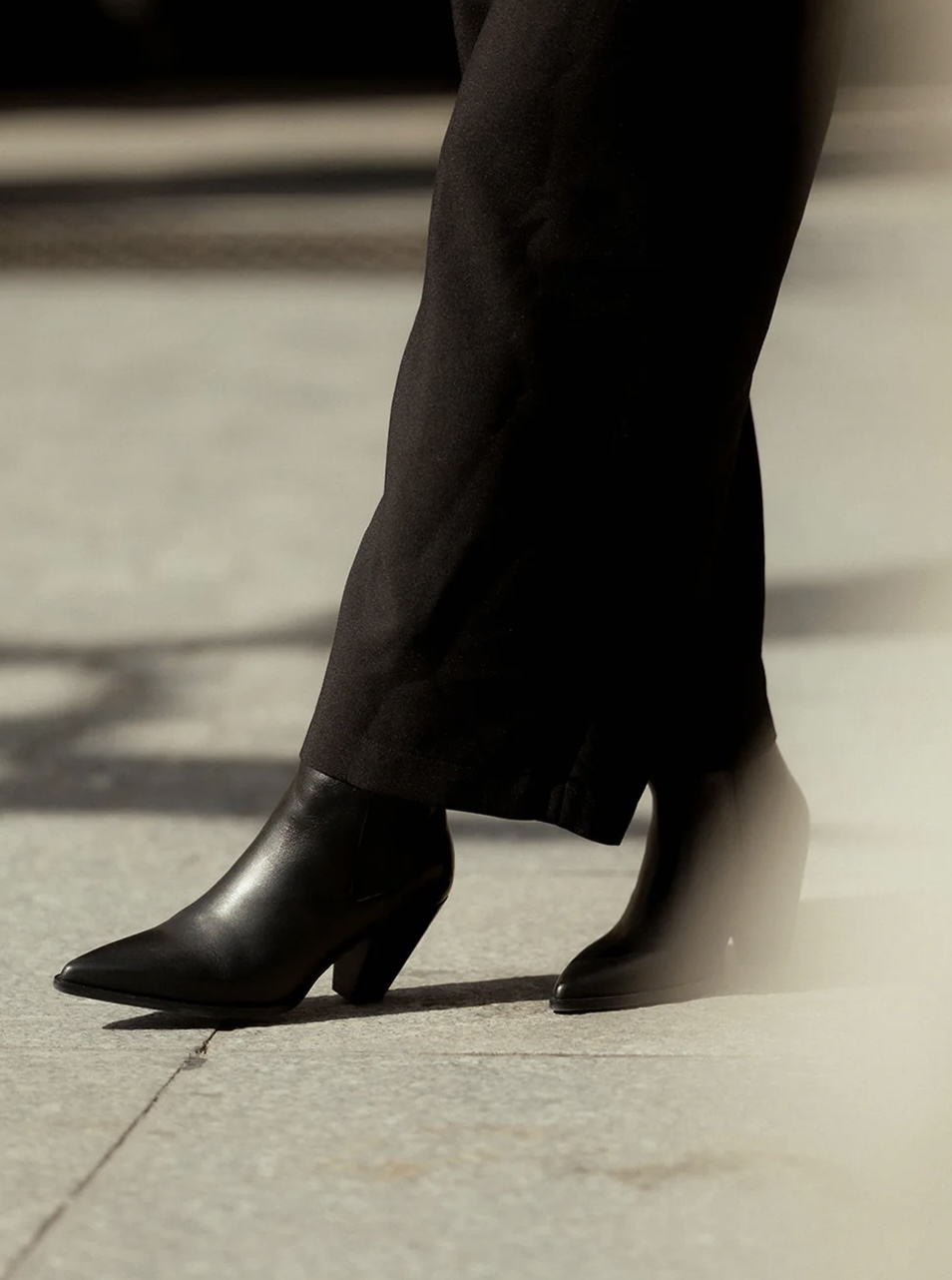 Ces bottines en cuir lisse noir séduisent par leur allure à la fois moderne et intemporelle. Elles se distinguent par leur bout pointu, le talon biseauté et leurs surpiqûres latérales décoratives. Elégantes et confortables, elles accompagnent vos tenues du quotidien avec une touche de caractère.
