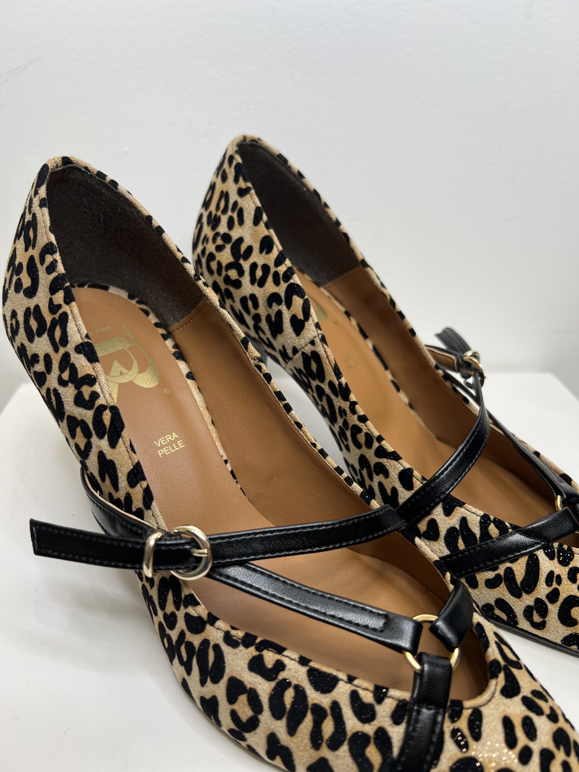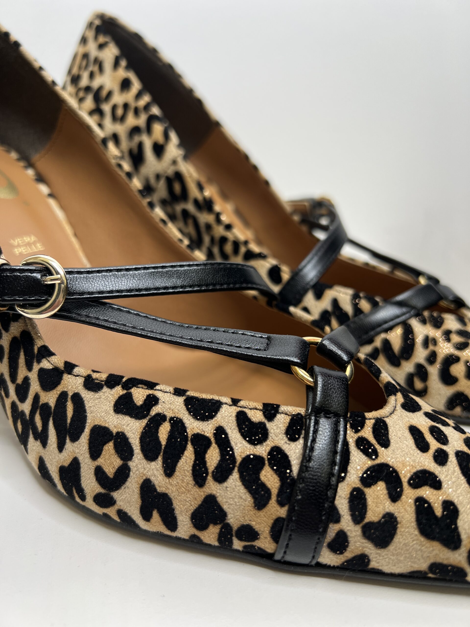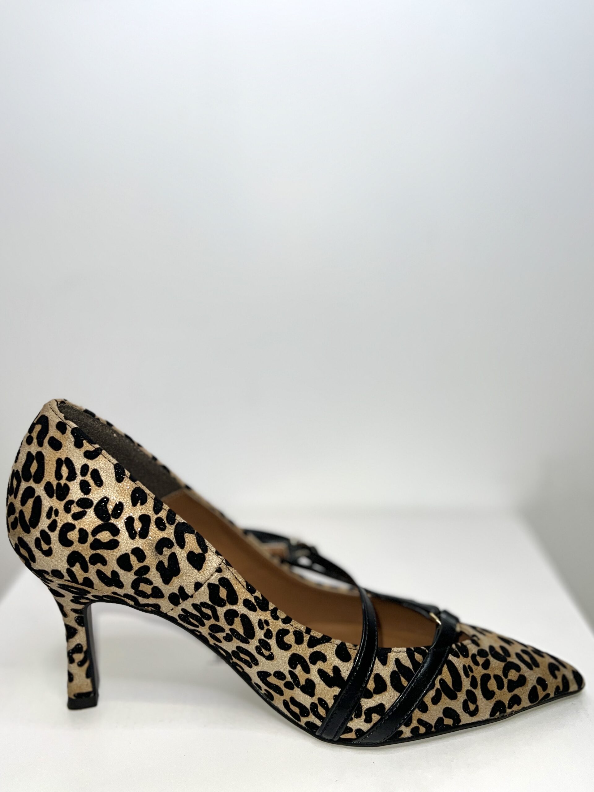 Escarpins élégants à bout pointu, habillés d’un imprimé léopard sophistiqué. Les fines brides noires structurent la silhouette et apportent une touche moderne et féminine. Talon fin pour une allure élancée et raffinée.
