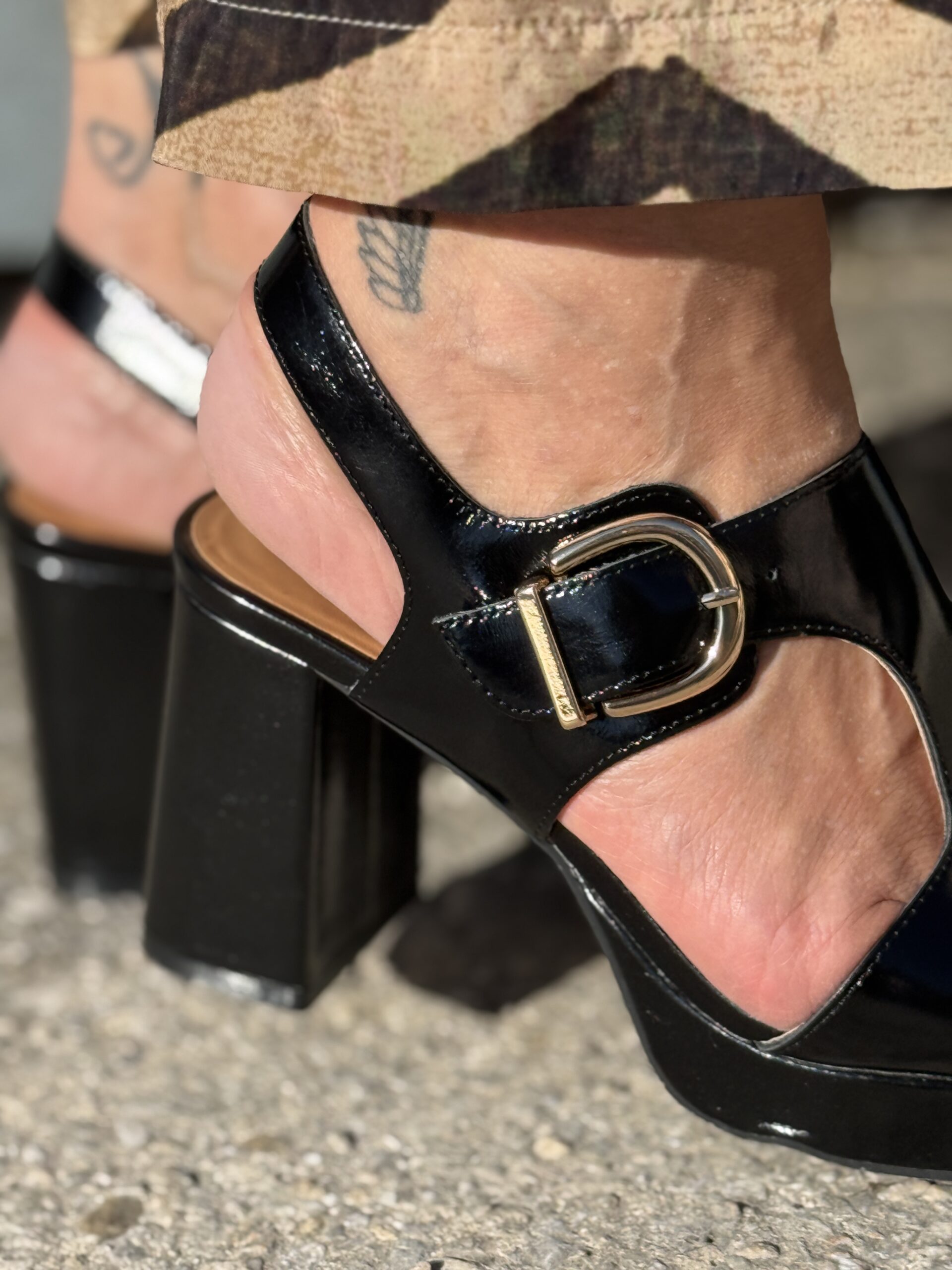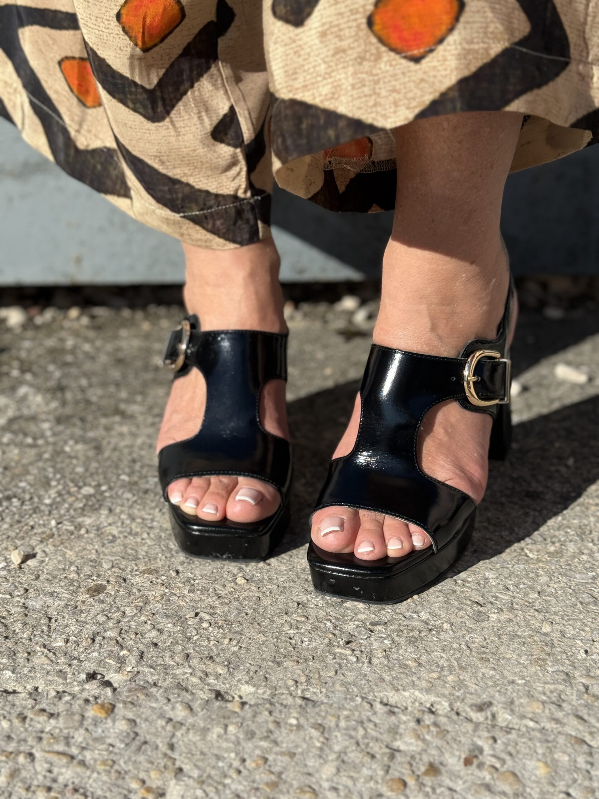 Les sandales séduisent par leur silhouette affirmée et contemporaine. Confectionnées en cuir brillant, elles associent une plateforme confortable à talons large évasé, offrant stabilité et allure.