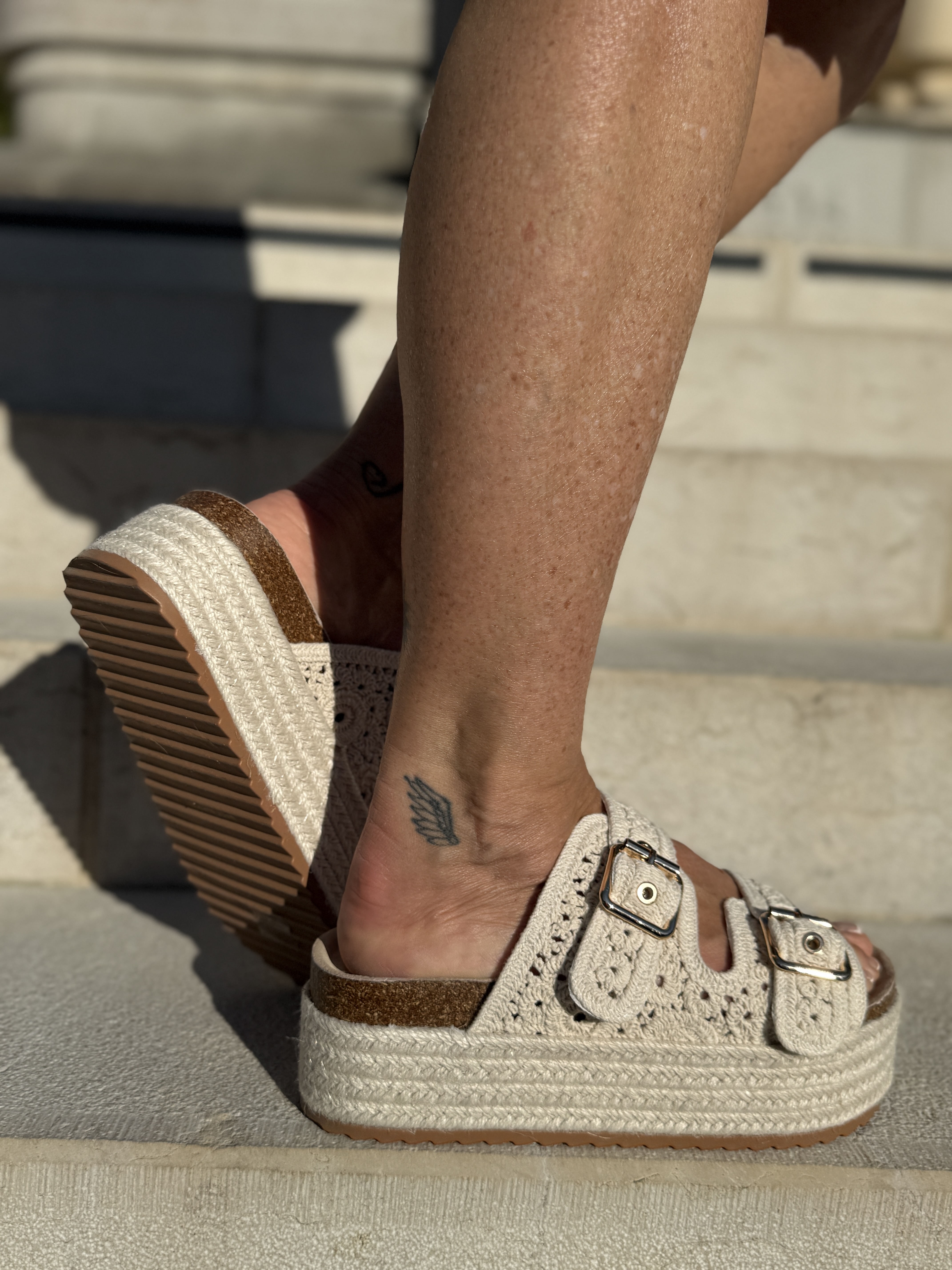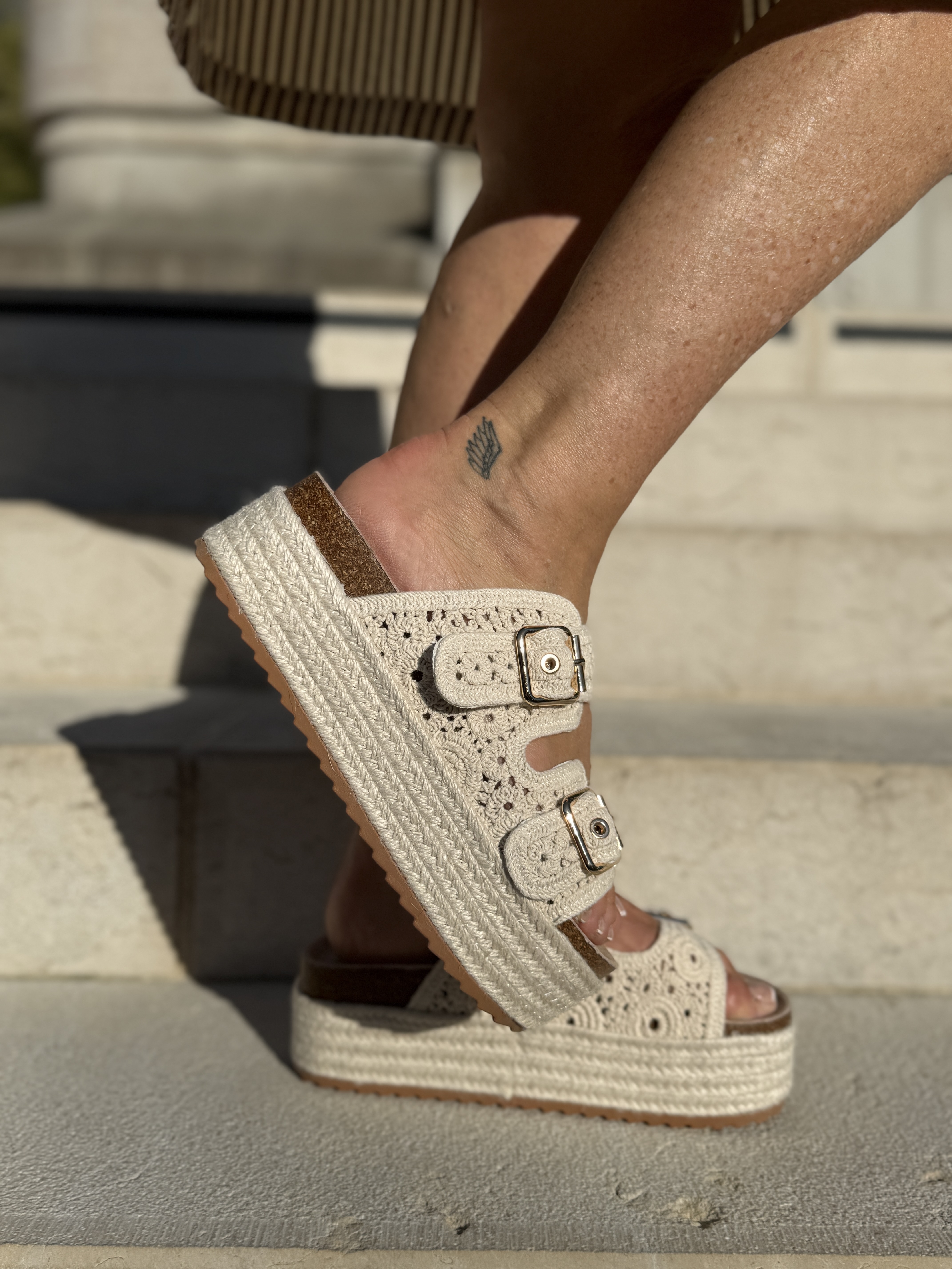 La sandale intemporelle à trois brides, avec une assise plantaire moulée et une semelle épaisse, et l’élève à un autre niveau.