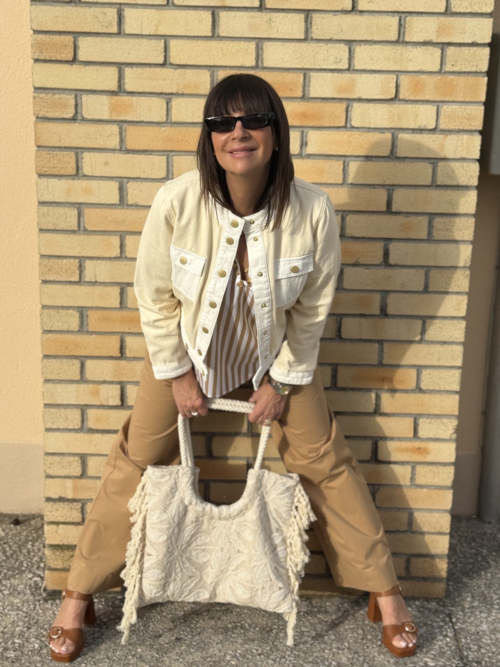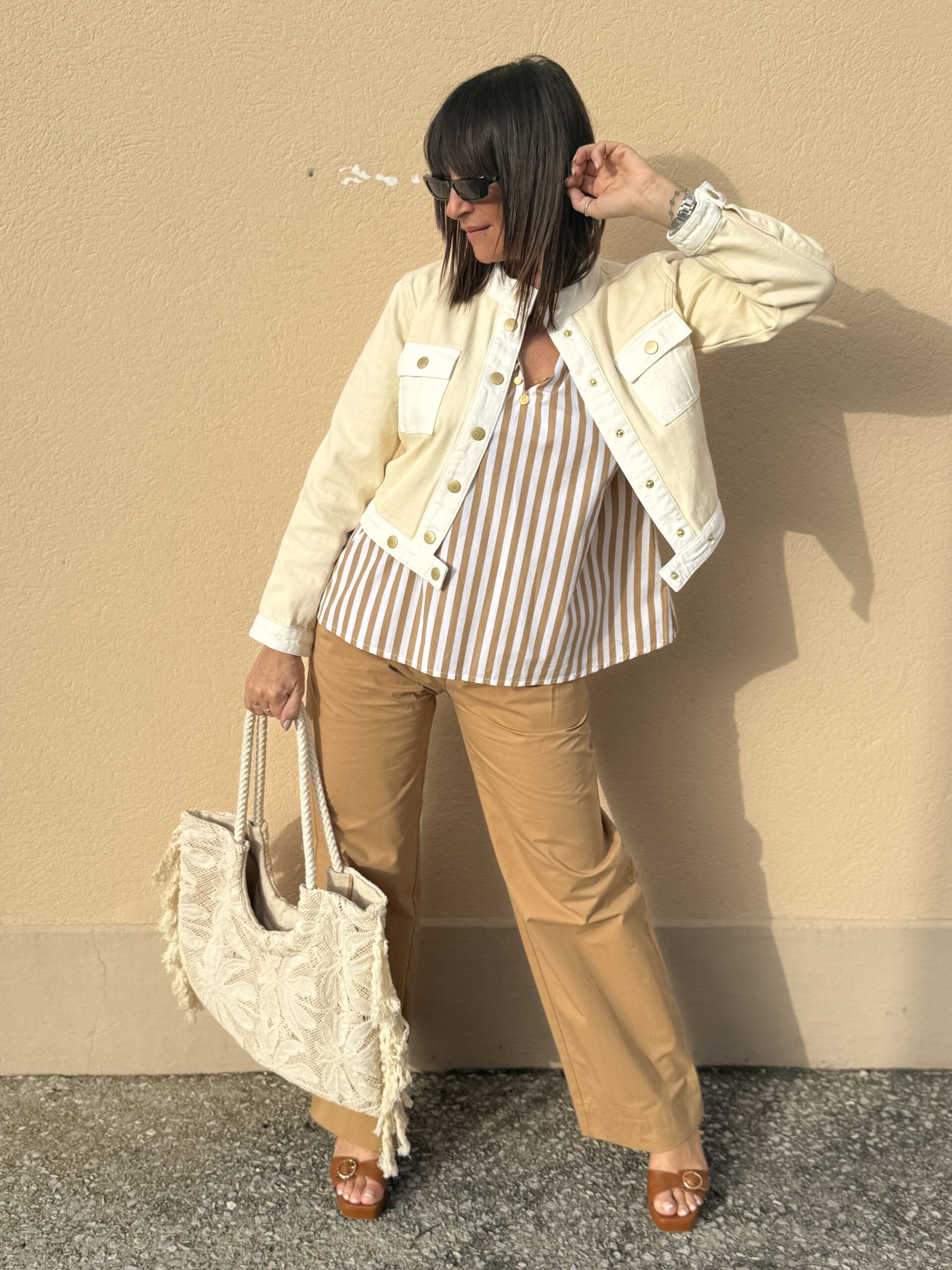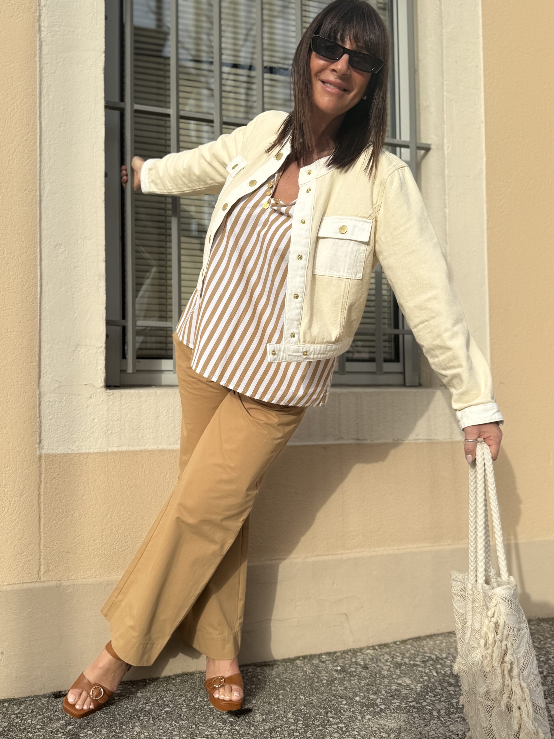 La veste écrue apporte de la lumière et structure la silhouette.