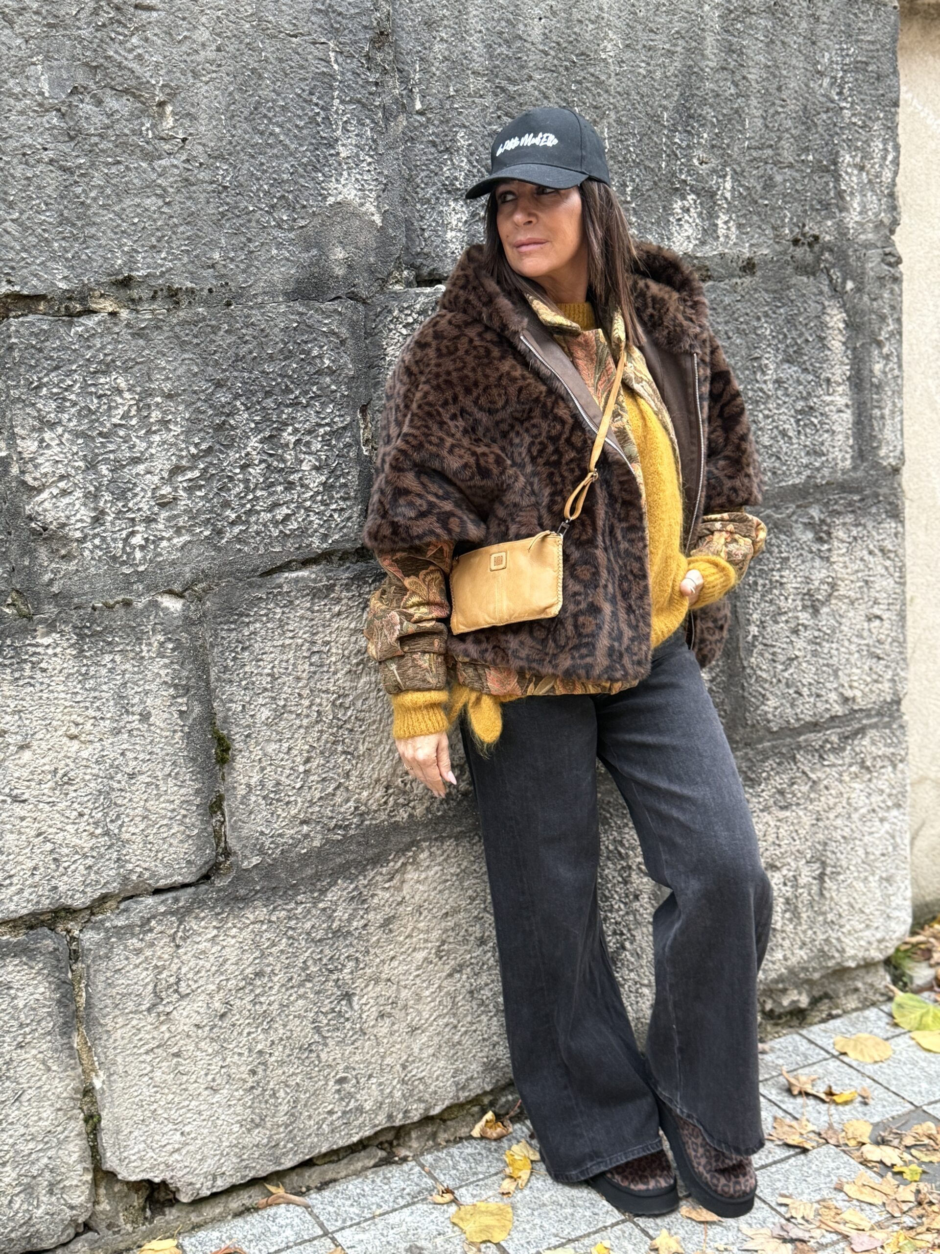 Le manteau court léopard créé une silhouette forte et ultra-tendance, parfaite pour un look d’hiver affirmé.