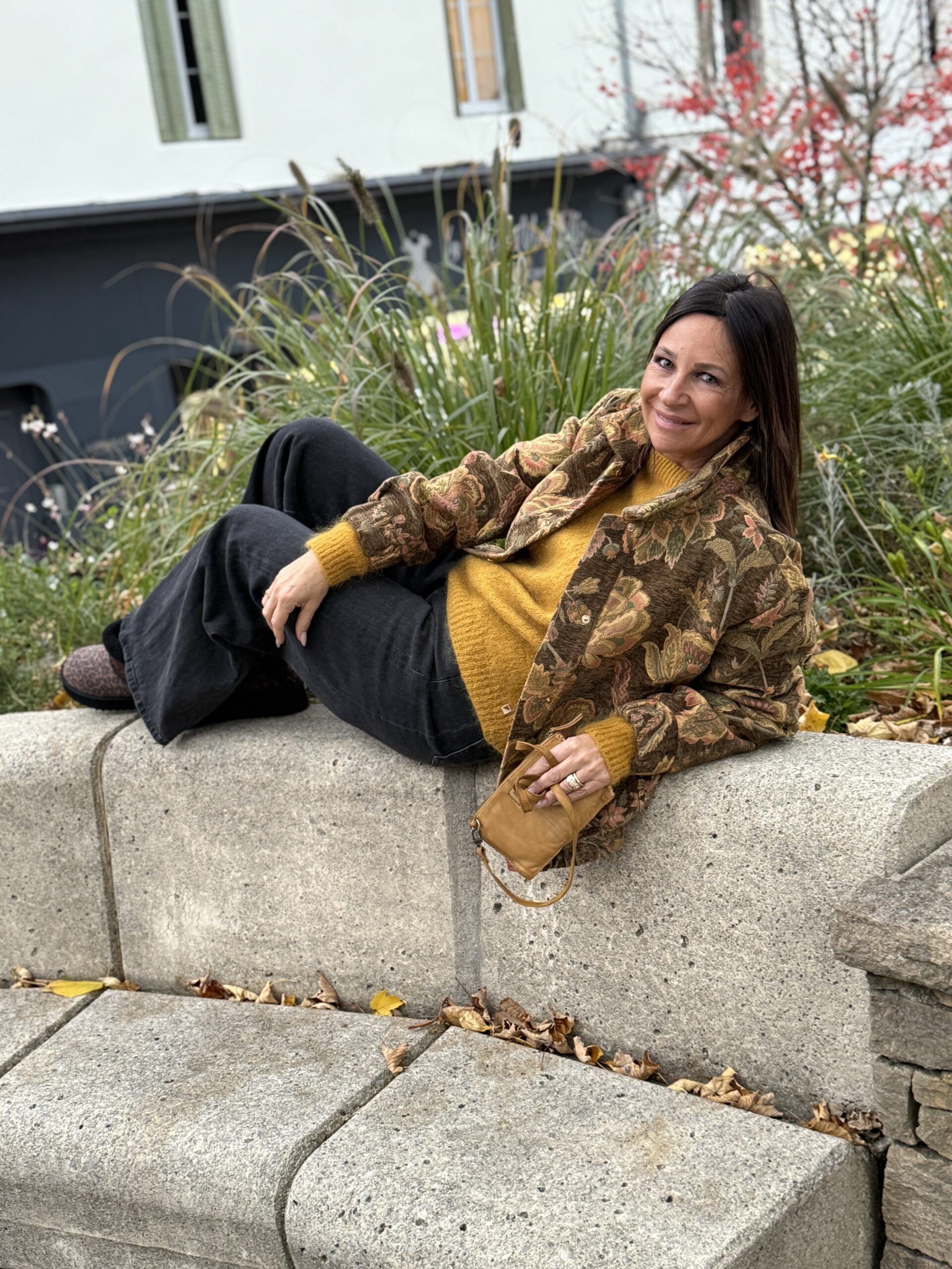 Le pull moutarde apporte une touche lumineuse, pile dans les codes mode saison.
