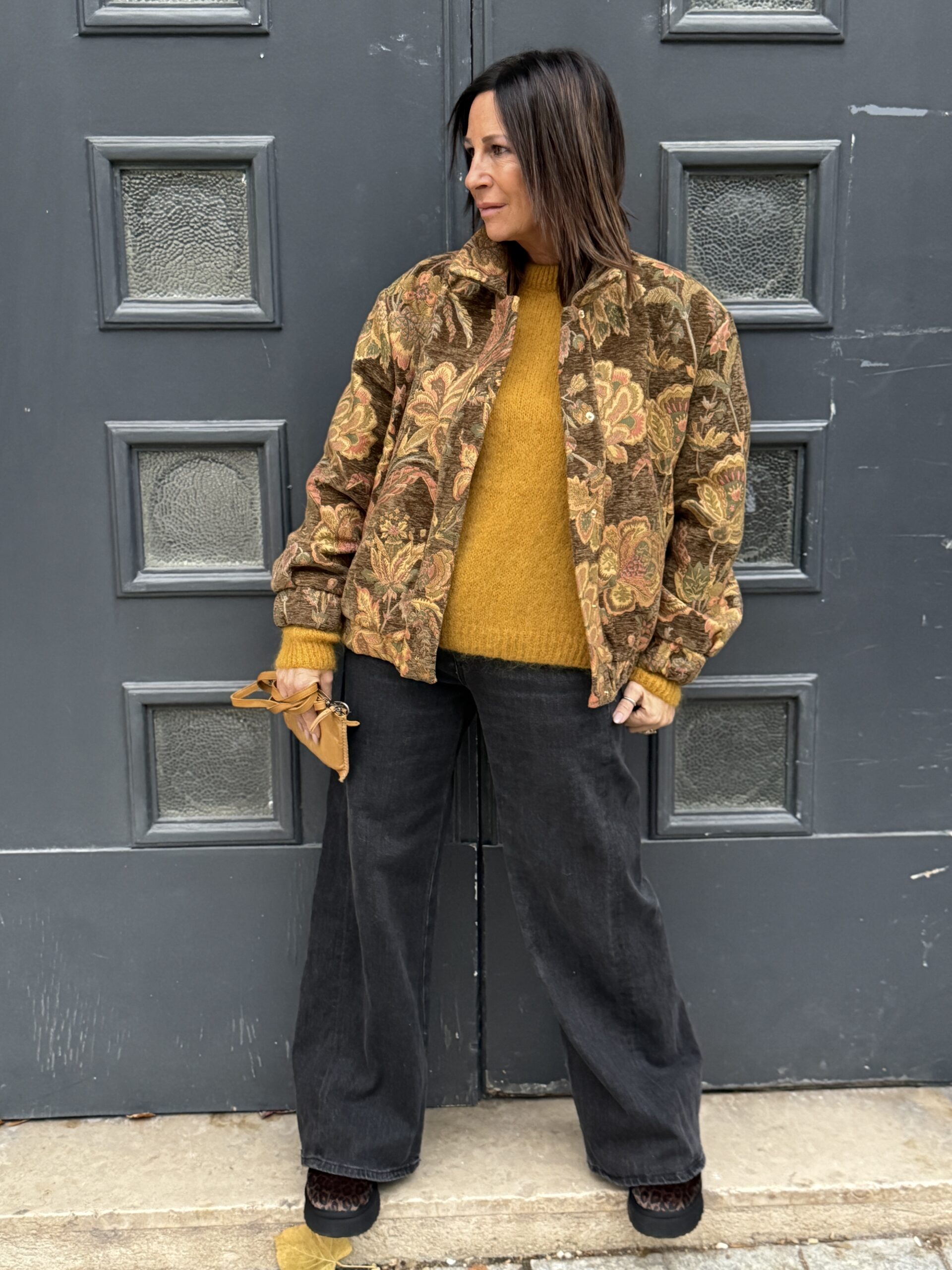 La veste jacquard, pièce statement, ajoute une dimension couture avec son motif riche et texturé.
