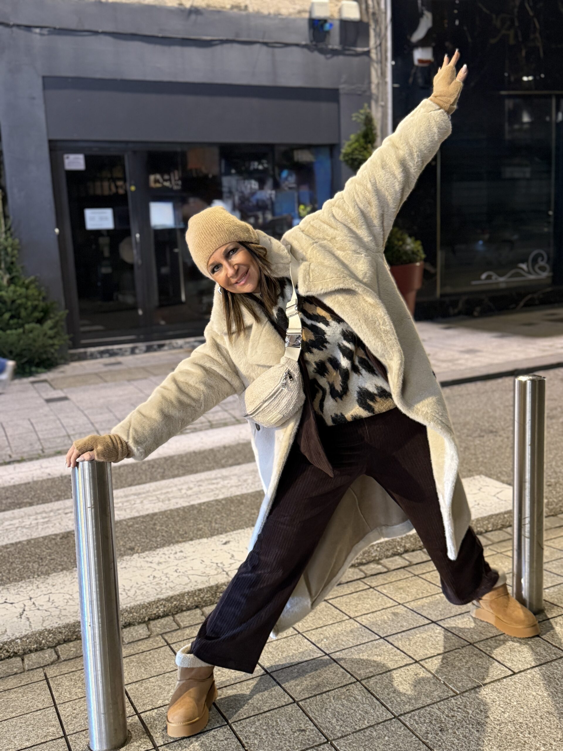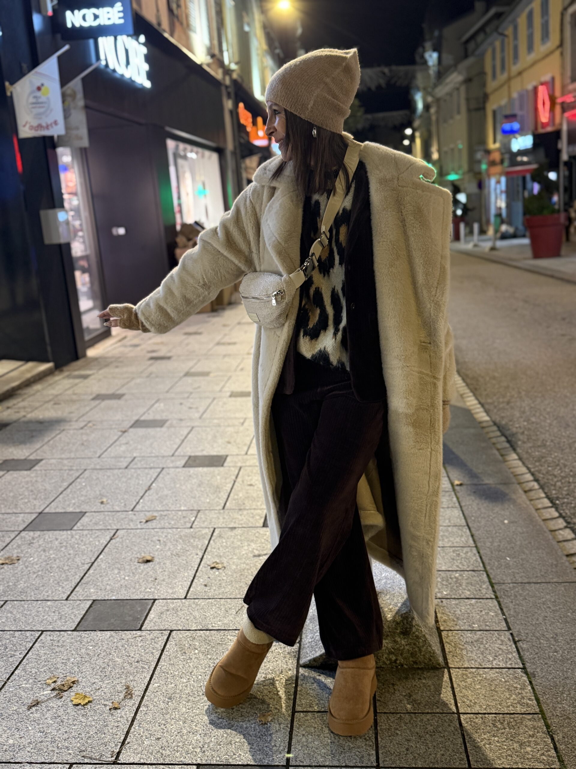 Les boots fourrées et le bonnet beige créent une harmonie toute douce, idéale pour les soirées froides.