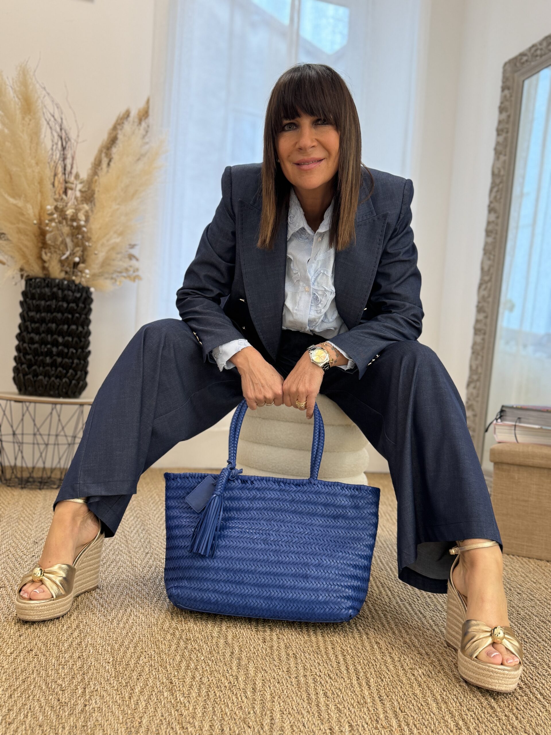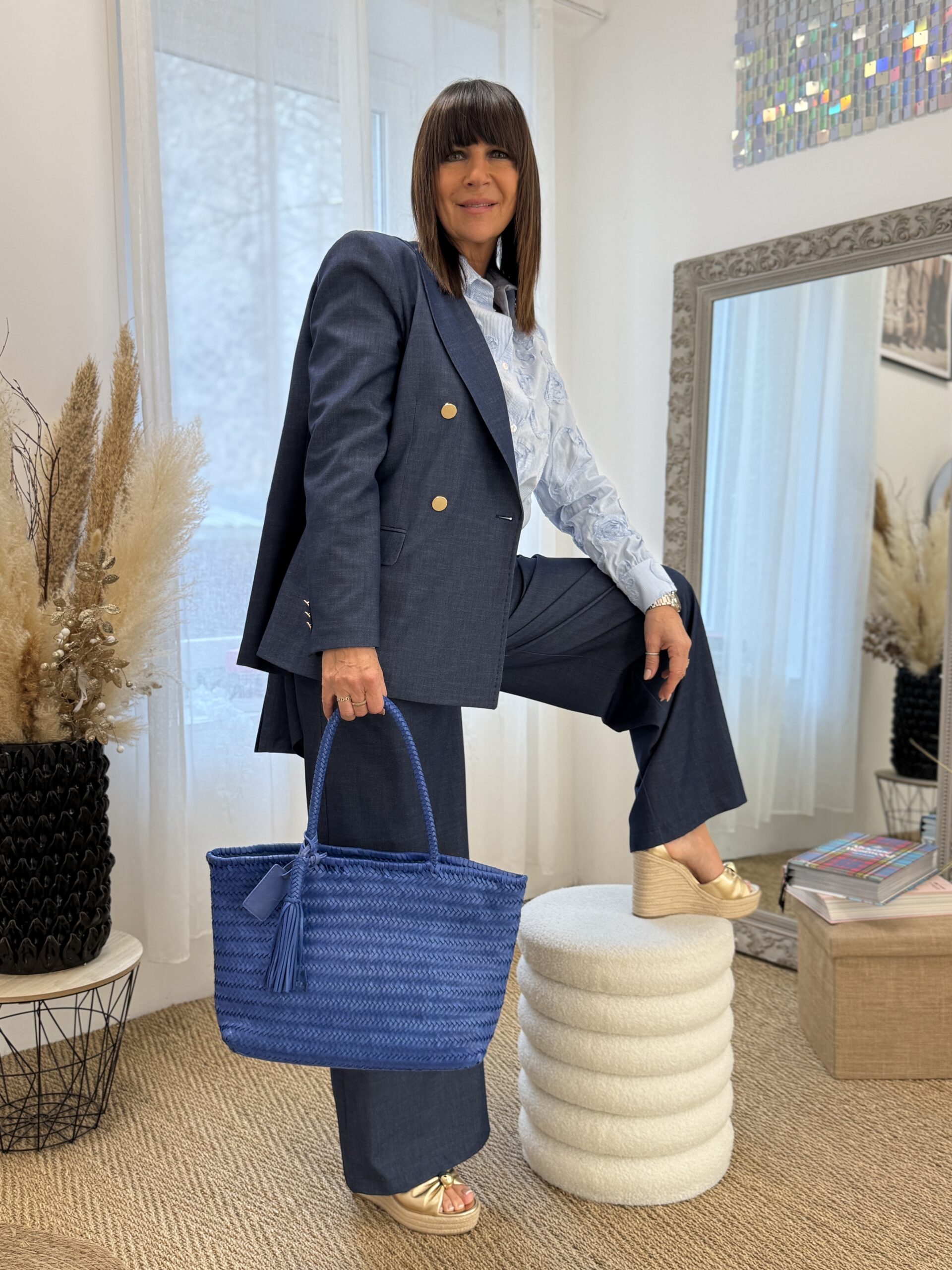 Le sac bleu devient la pièce forte qui dynamise l’ensemble avec caractère.