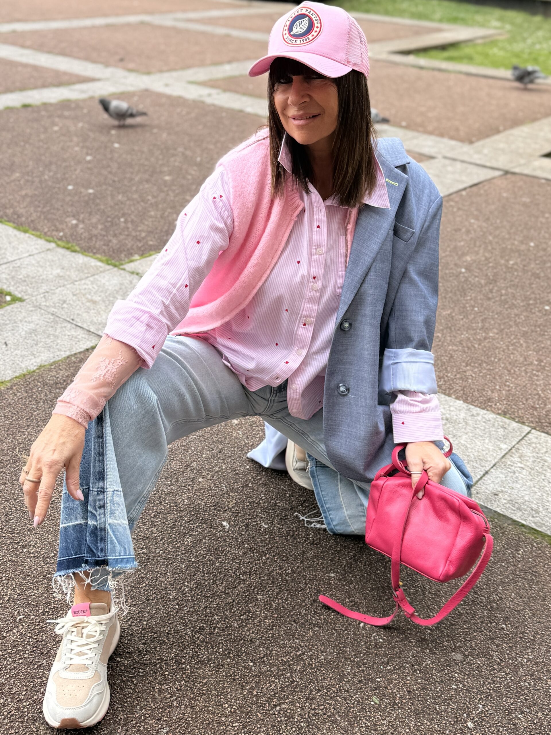 Le jean et les sneakers ancrent le look dans un esprit urbain moderne.