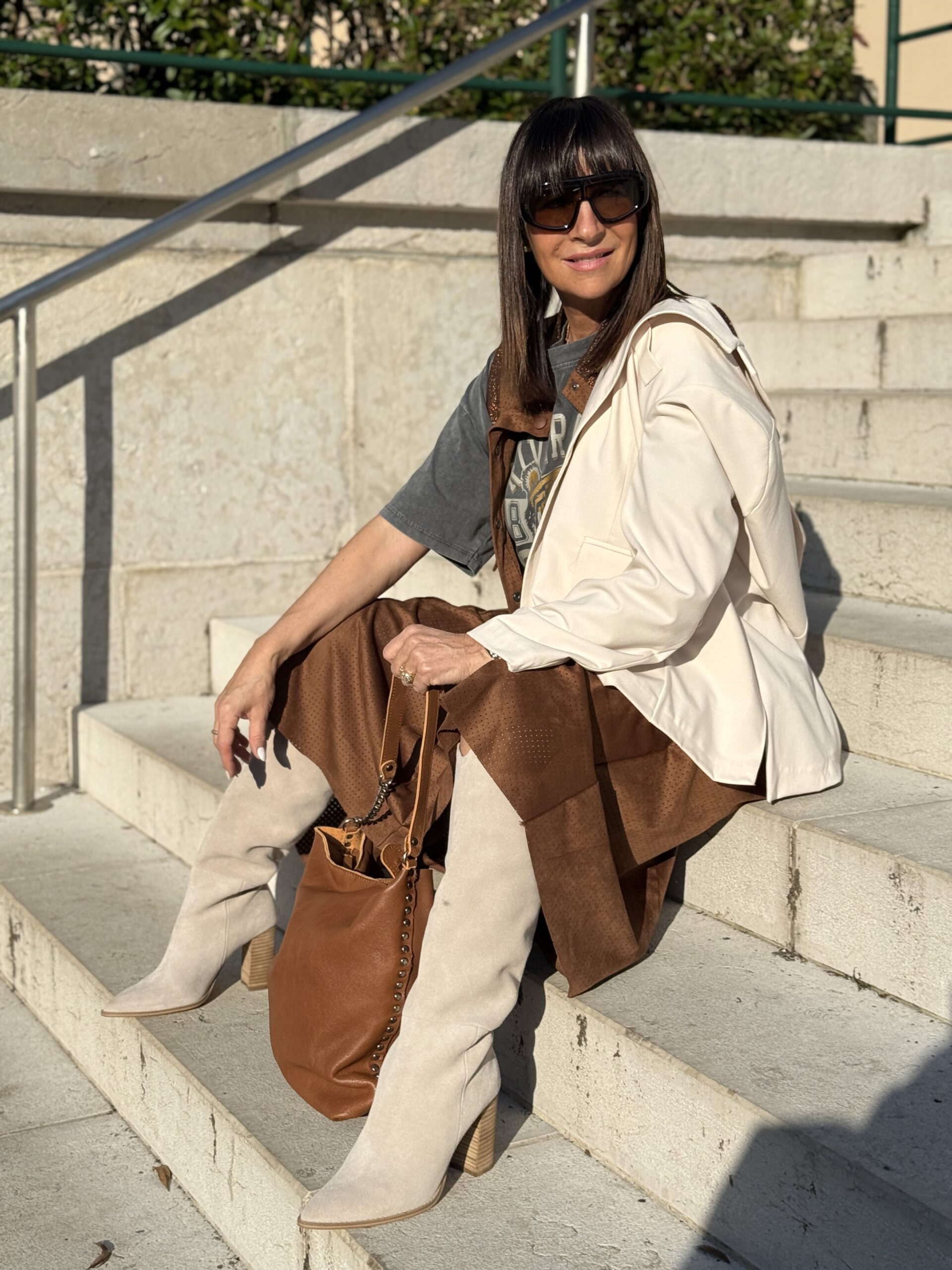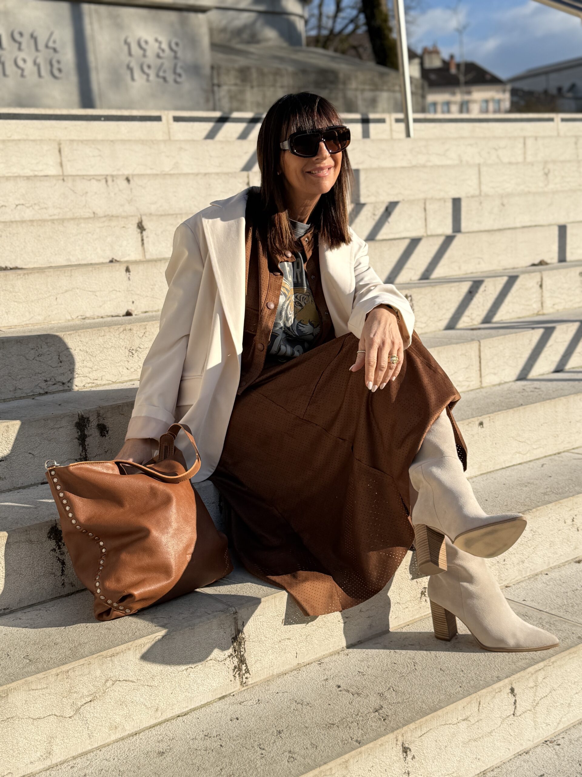 Le blazer clair illumine l’ensemble et équilibre parfaitement les tons chauds.