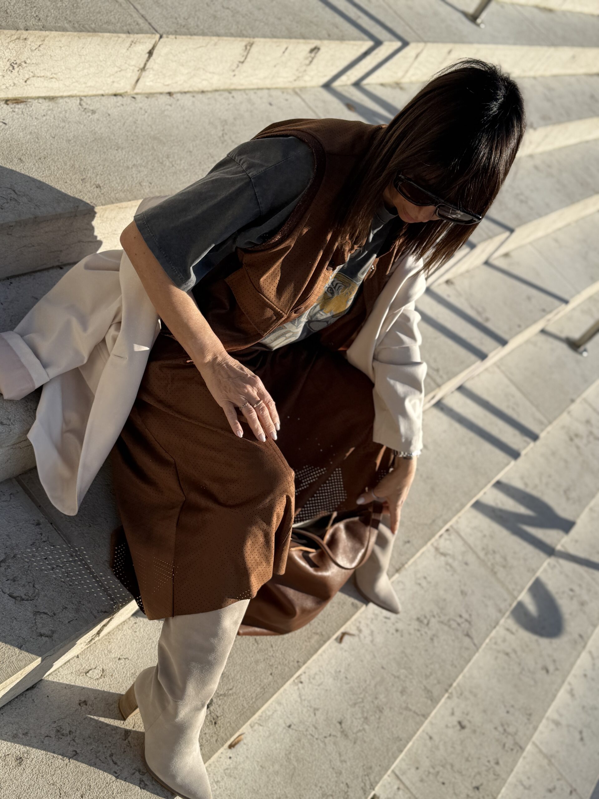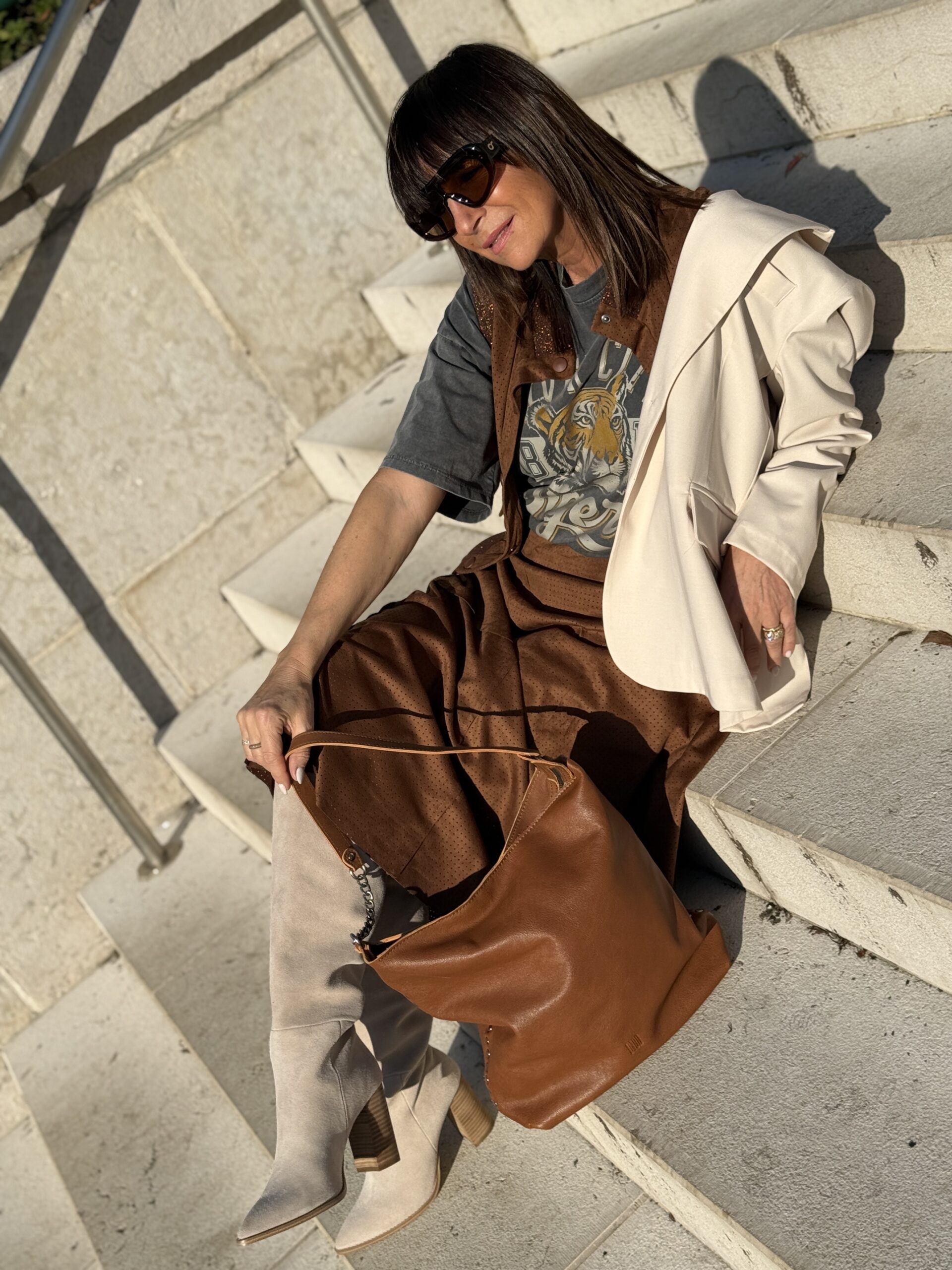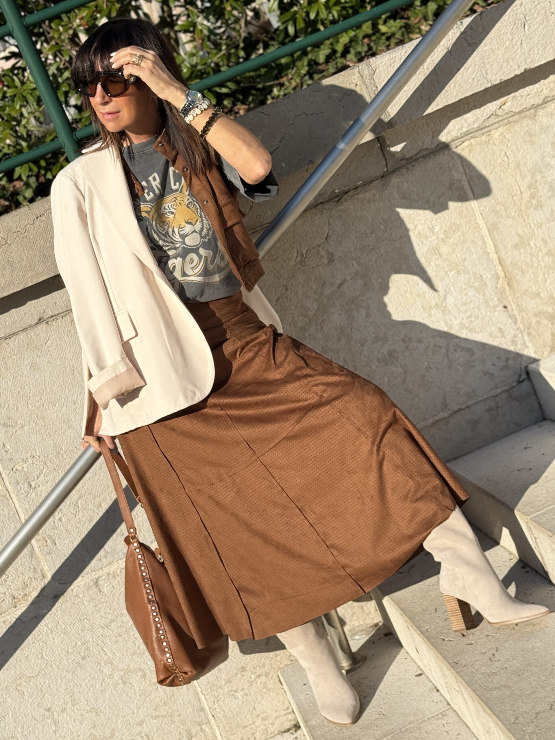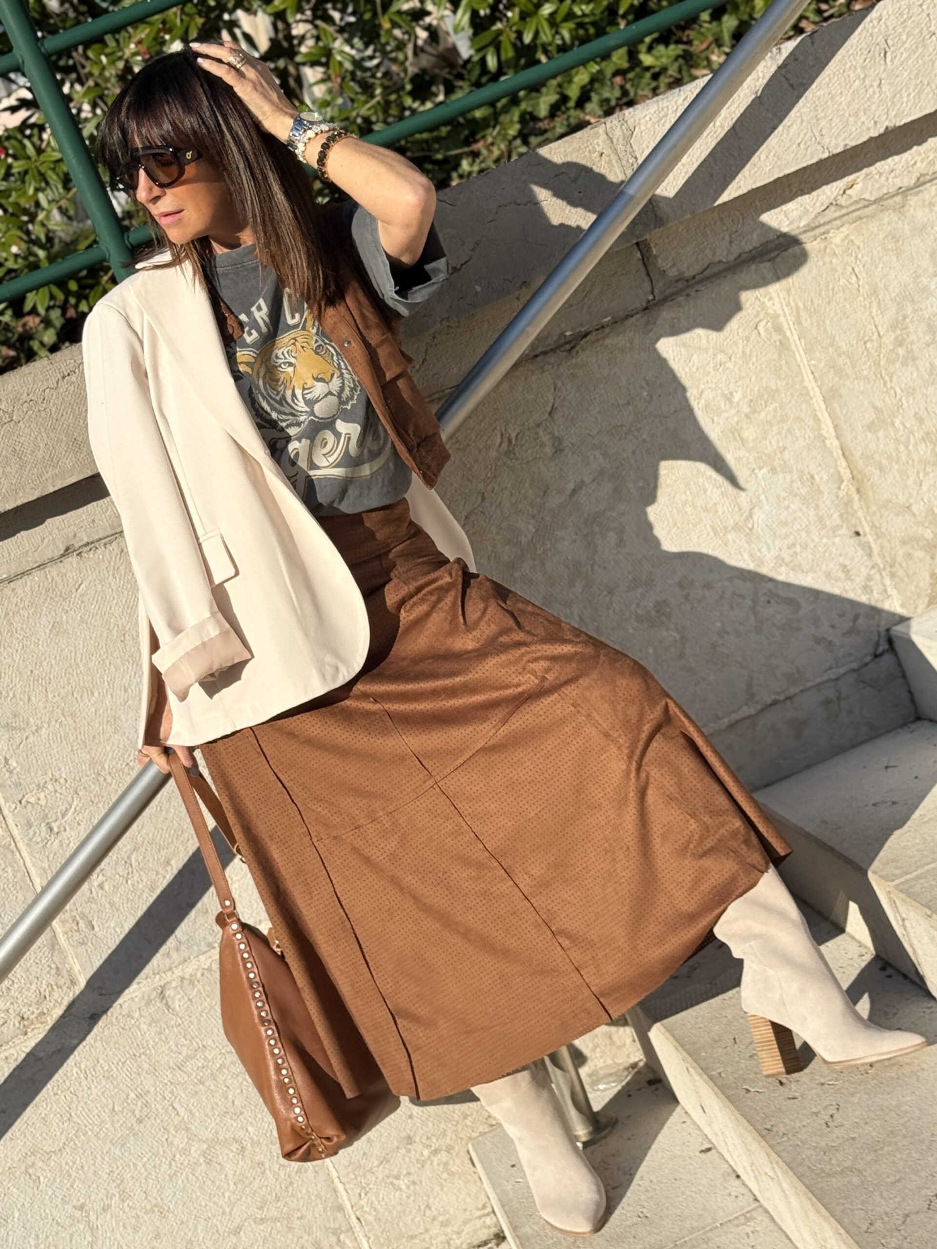 La jupe camel apporte de la profondeur et une élégance intemporelle, tandis que le T-shirt imprimé casse les codes avec une touche casual.