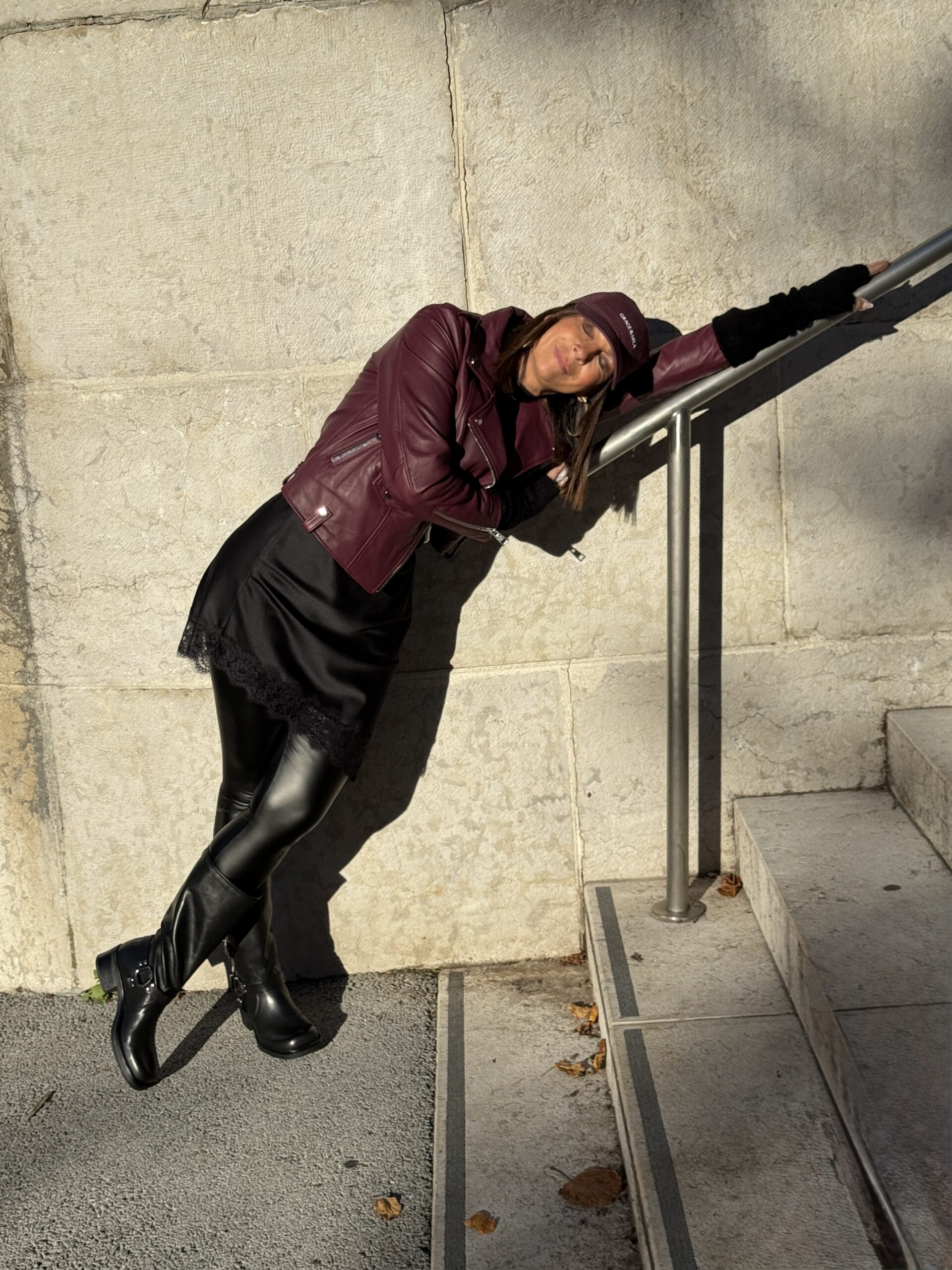 La veste en cuir bordeaux apporte la touche mode, en contraste avec la fluidité noire de la robe-lingerie.