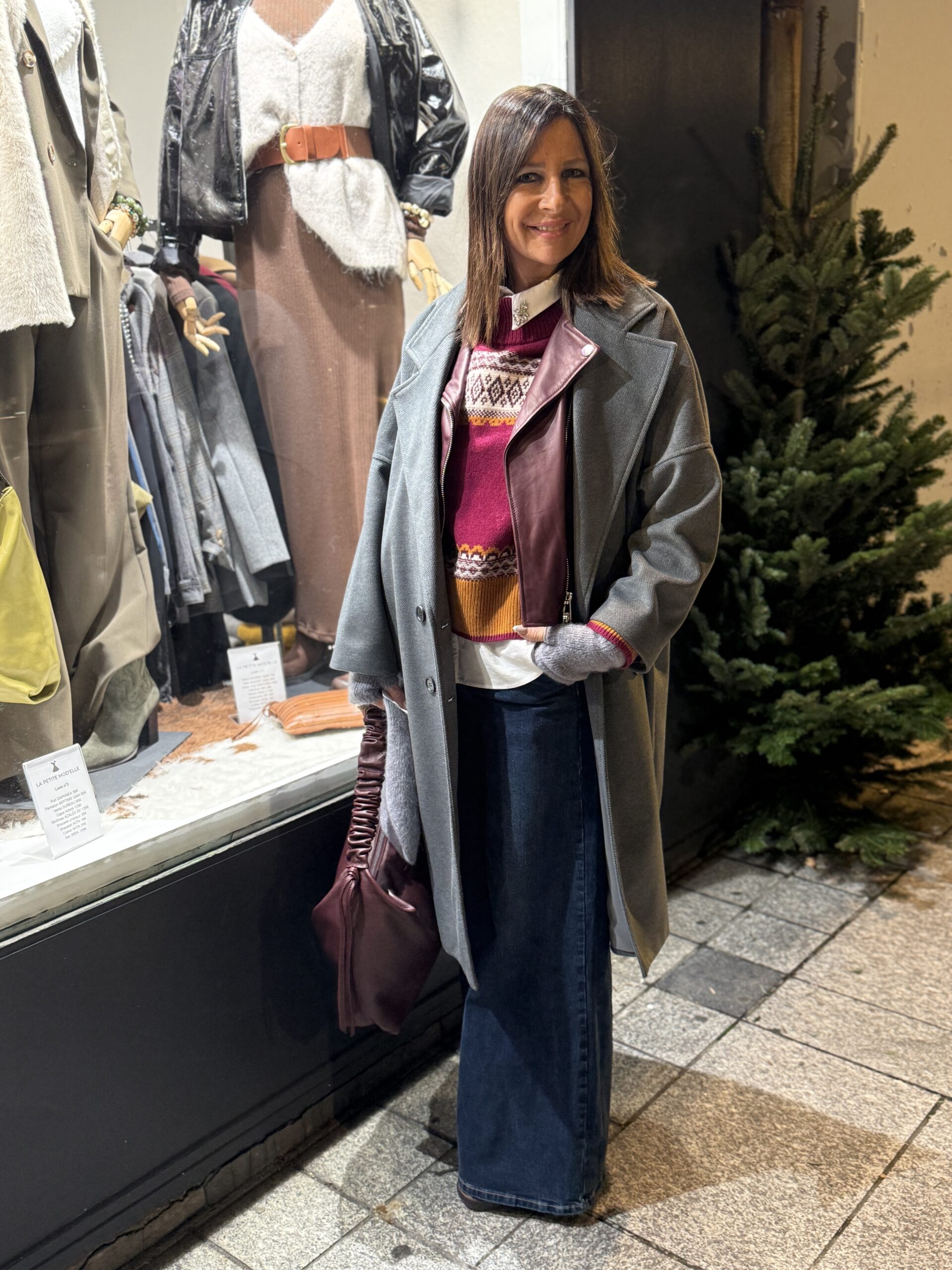 un pull jacquard aux couleurs vibrantes et un large manteau gris aux lignes oversize.