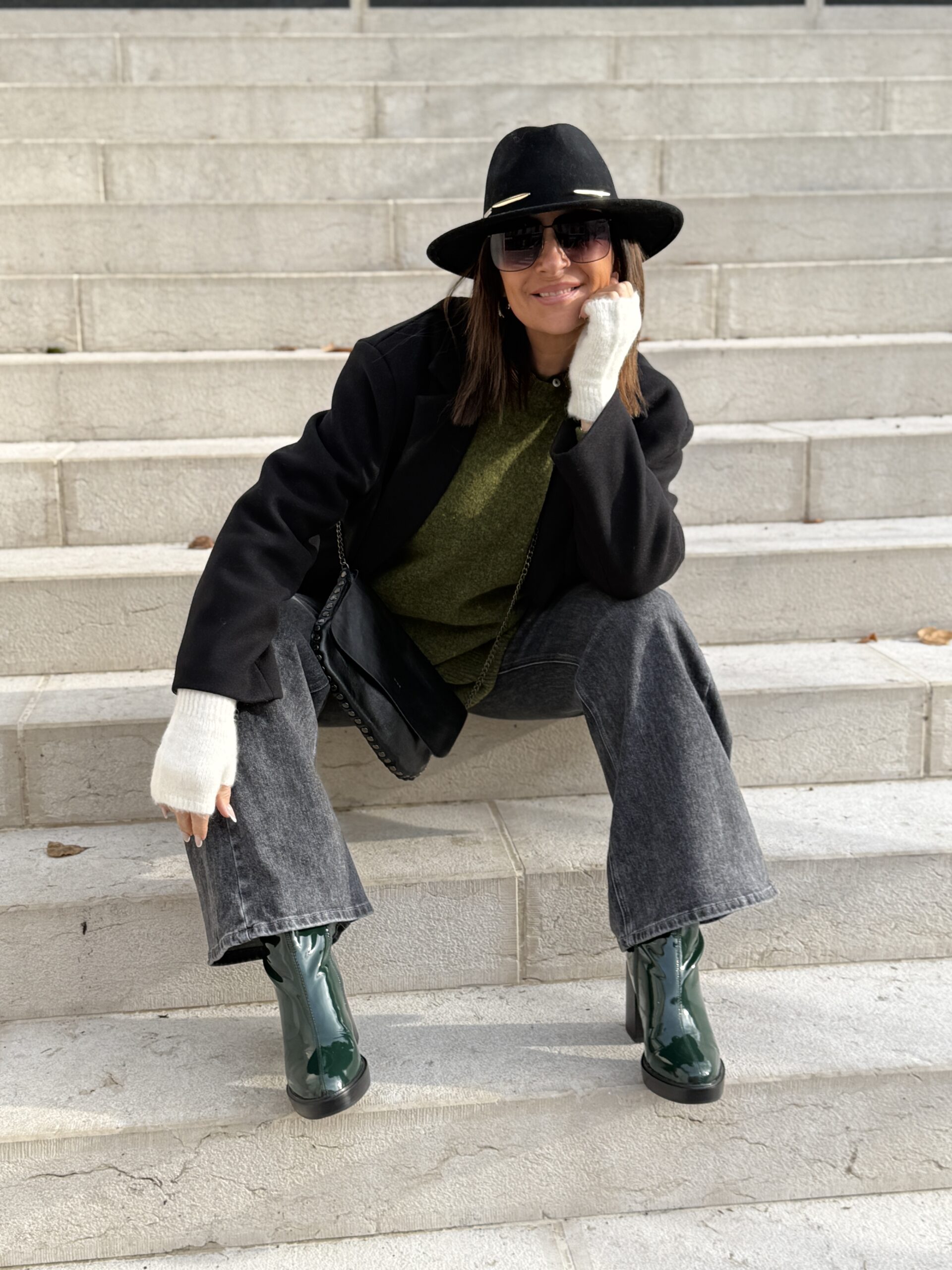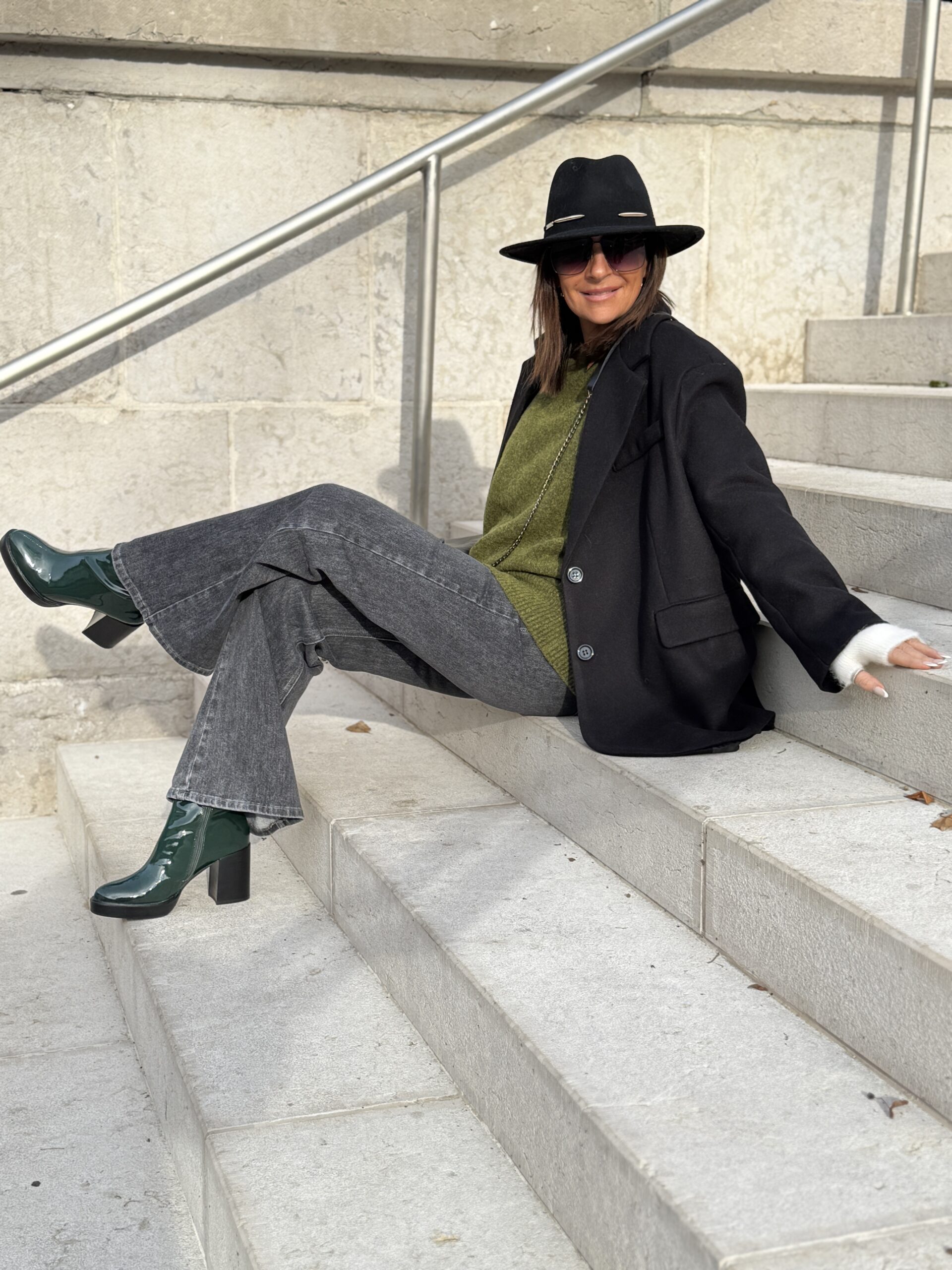 Les bottines vernies vertes réveillent la tenue avec audace.