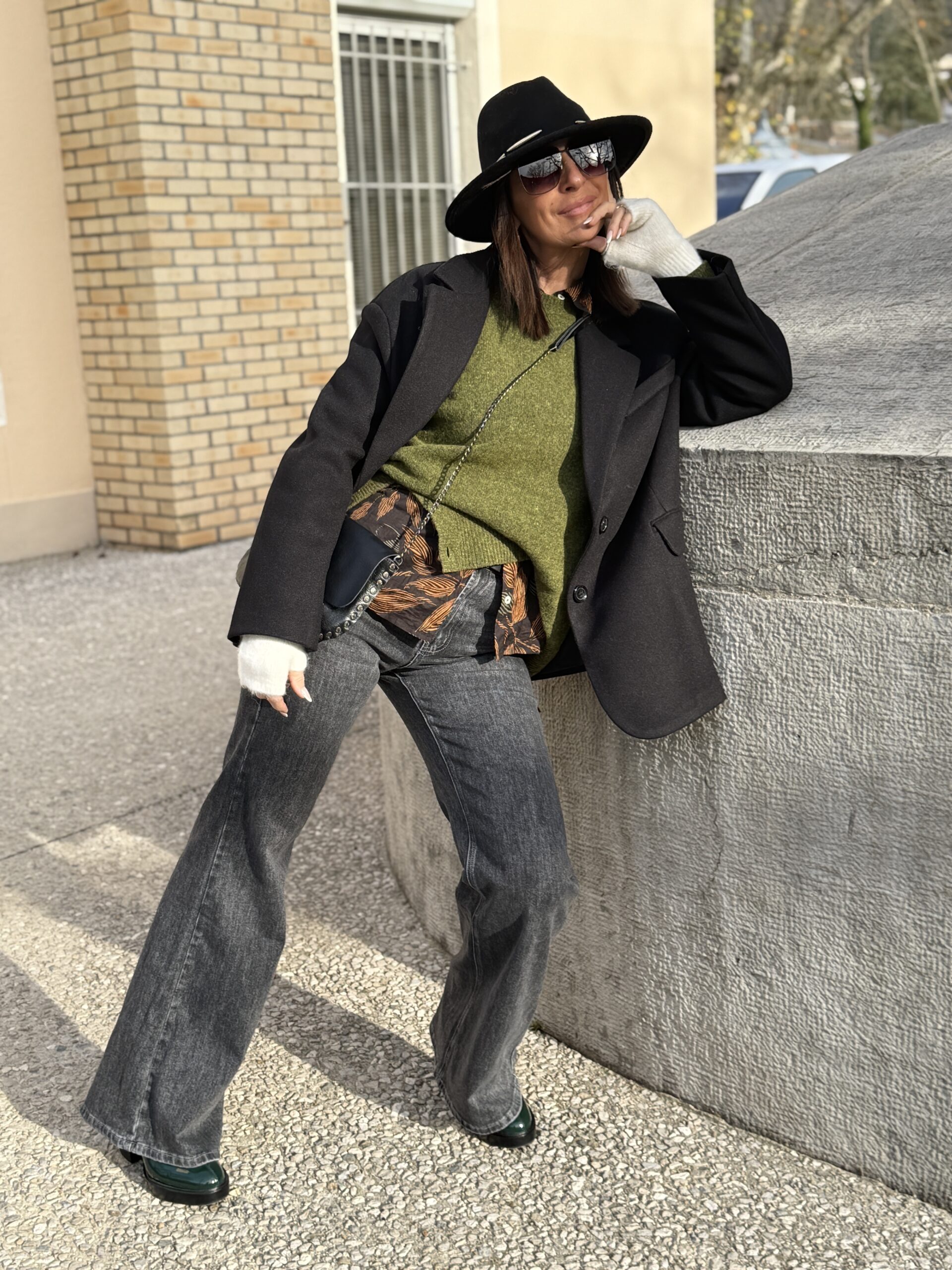Le blazer structuré donne l’allure, le pull apporte la touche chaleureuse.