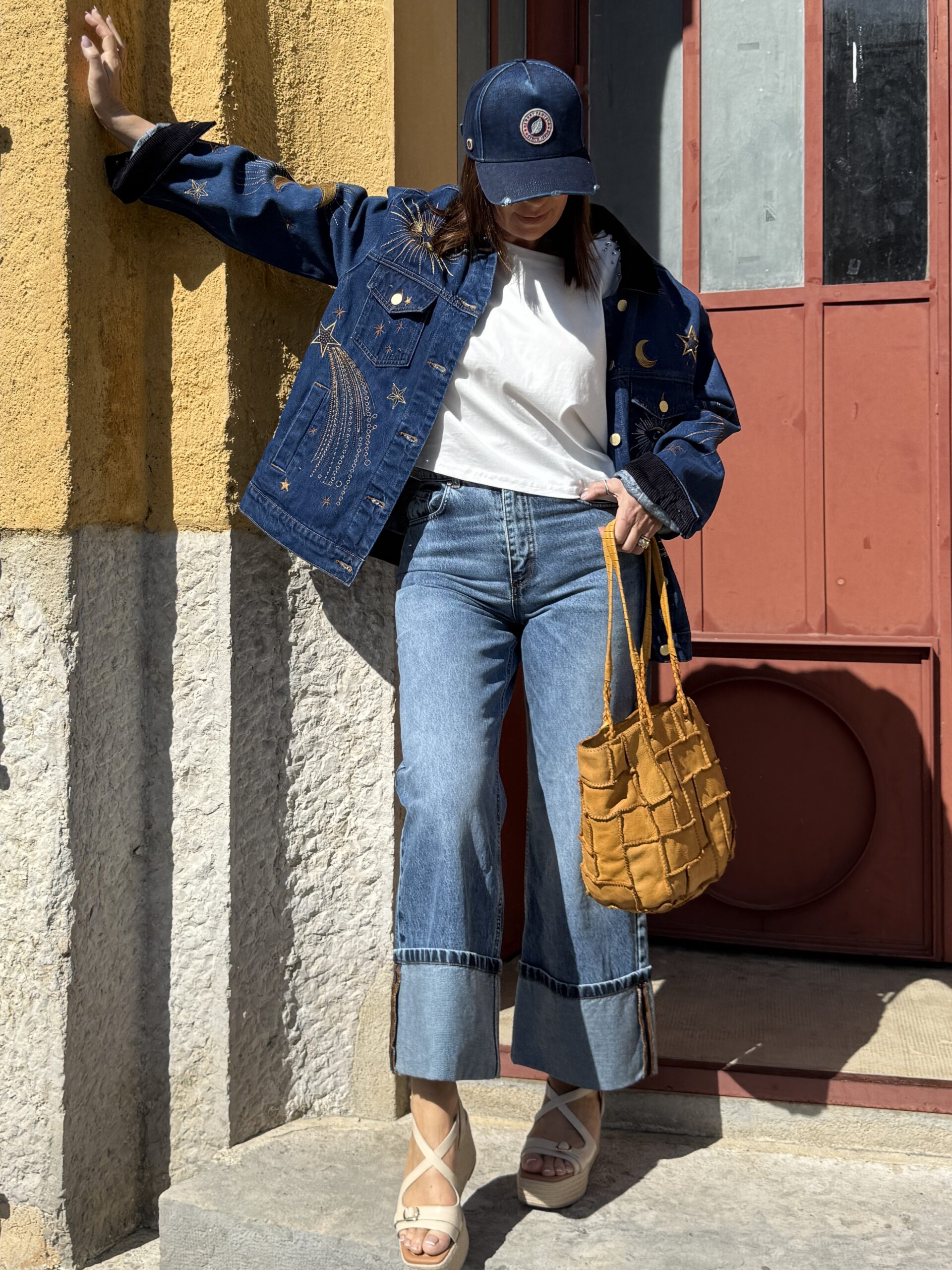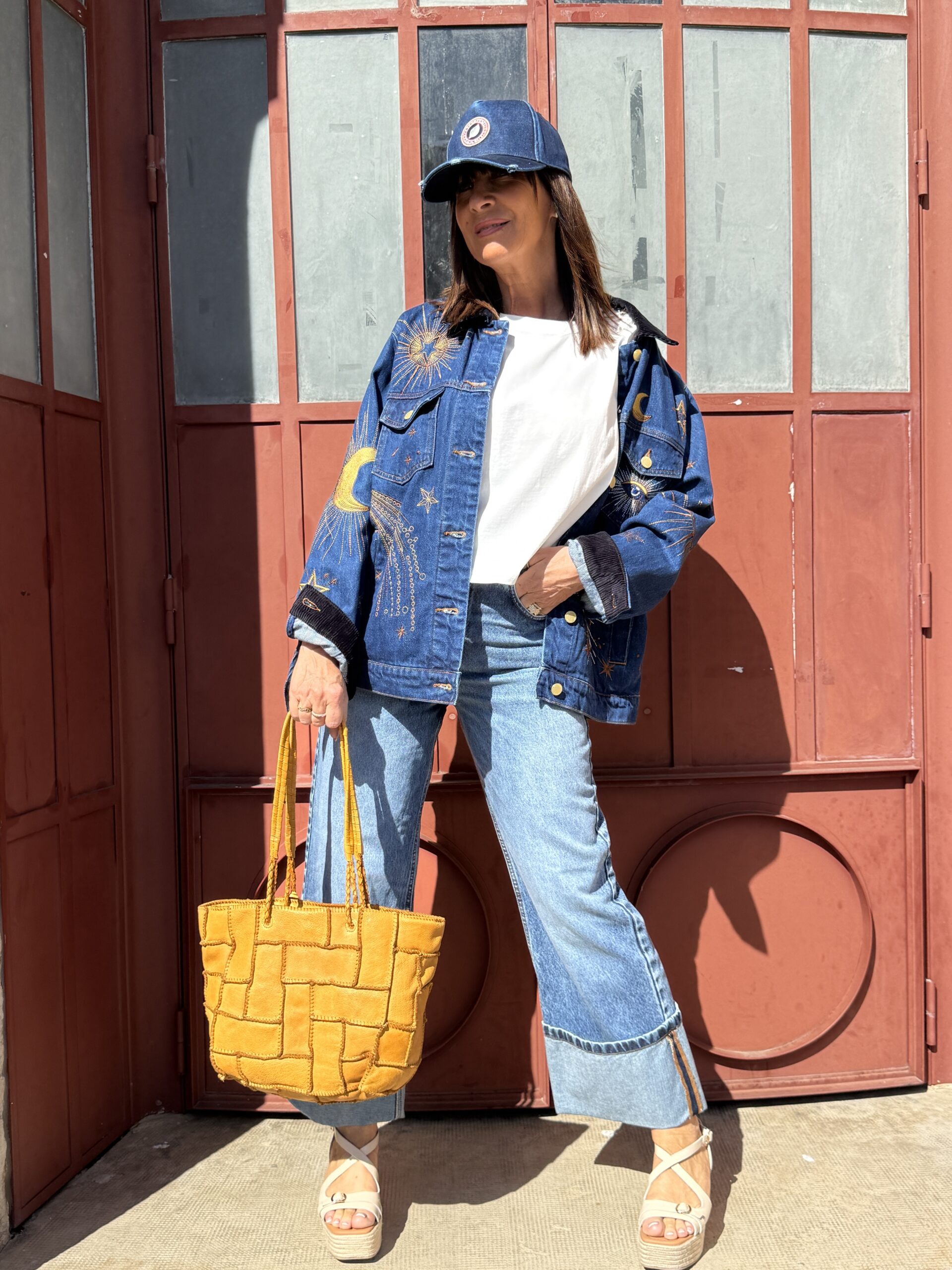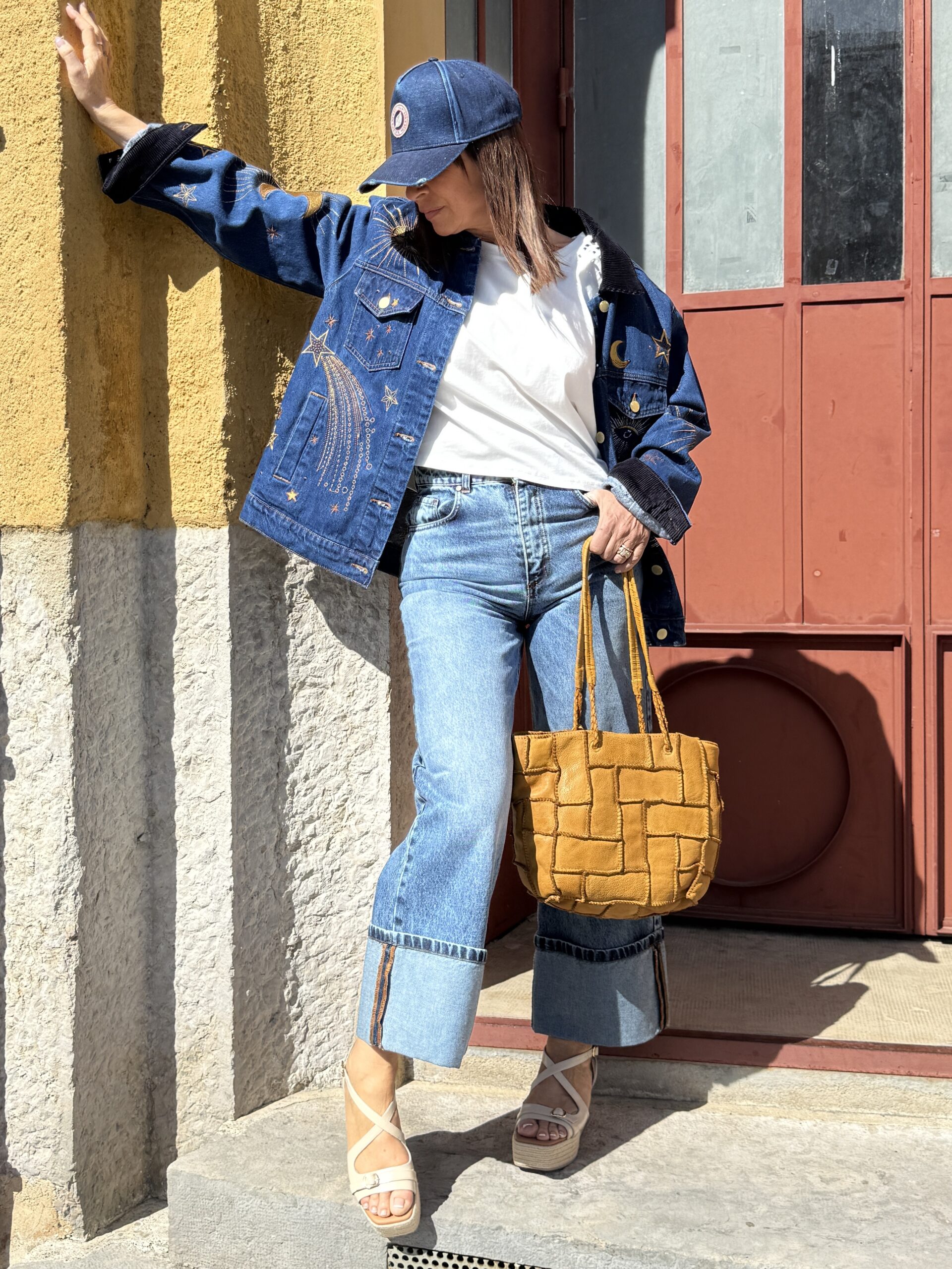 Une silhouette simple, mais twistée par cette veste en denim brodé qui fait toute la différence.