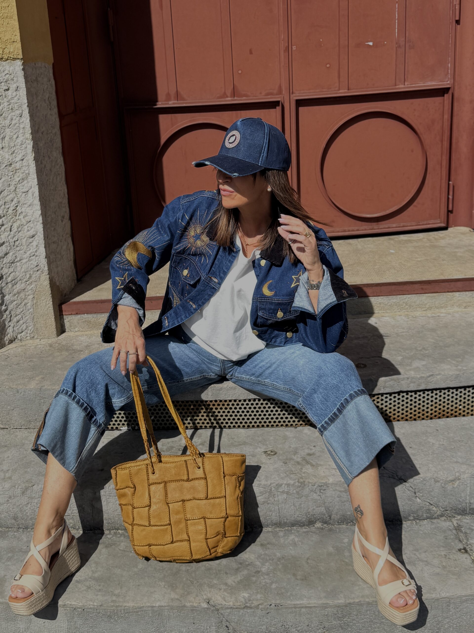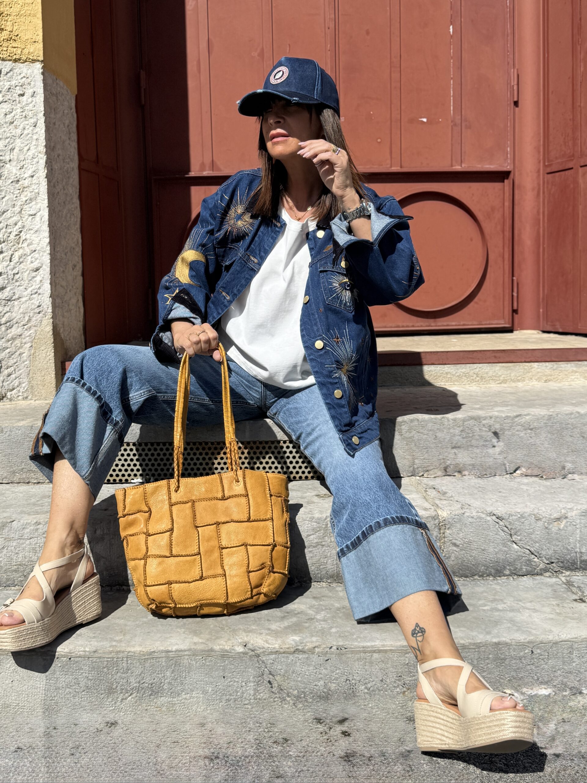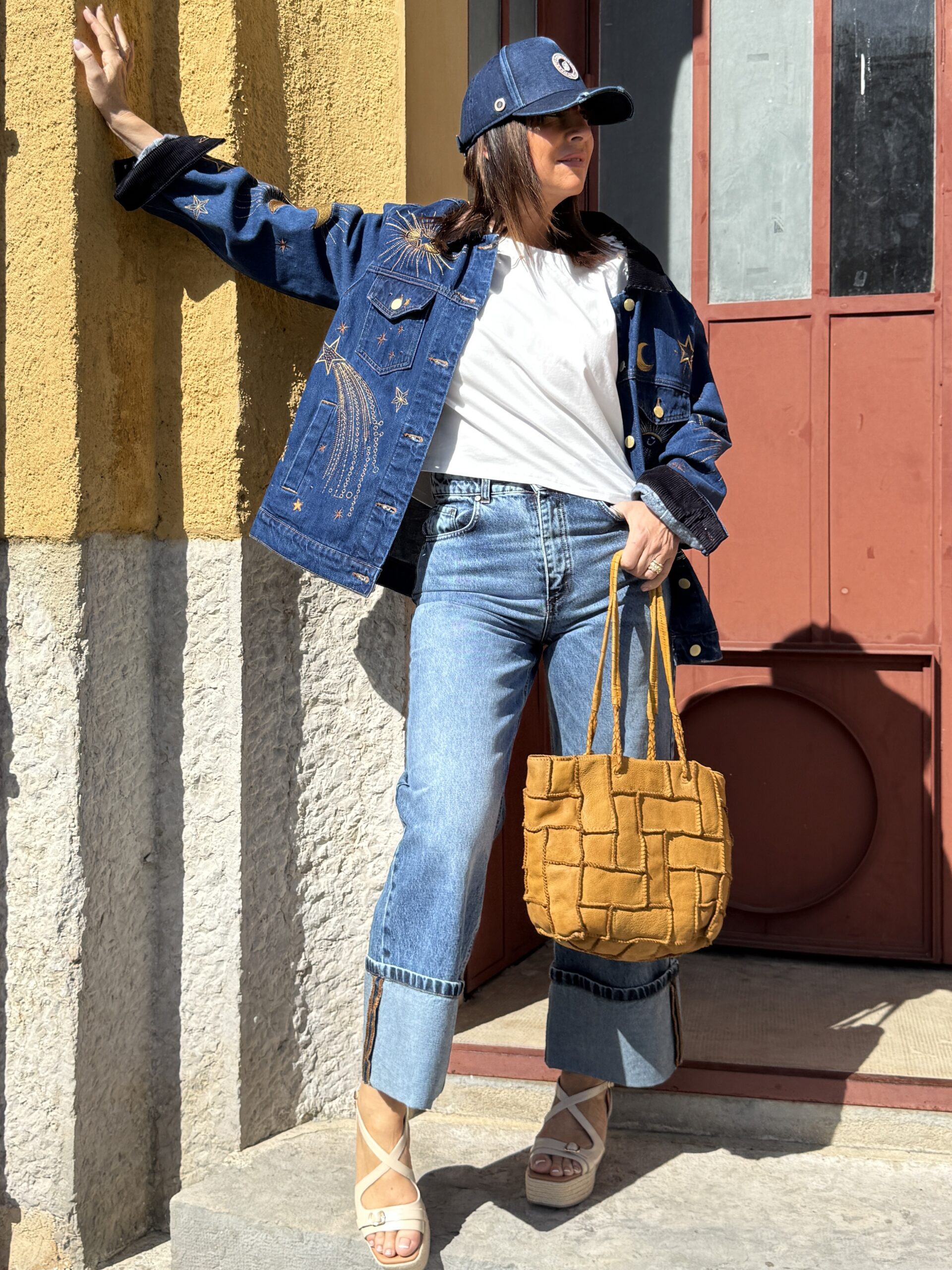 Une silhouette simple, mais twistée par cette veste en denim brodé qui fait toute la différence.