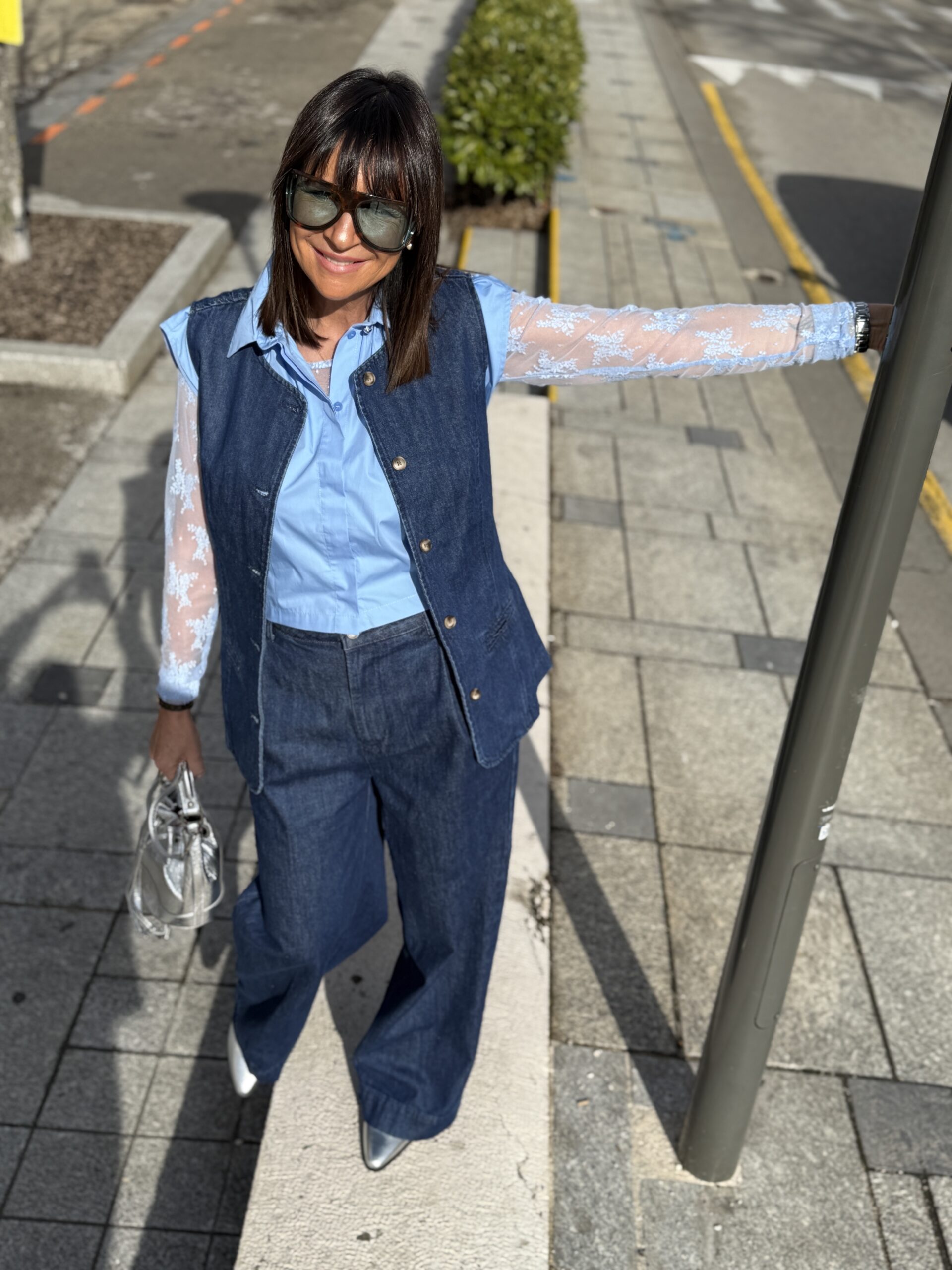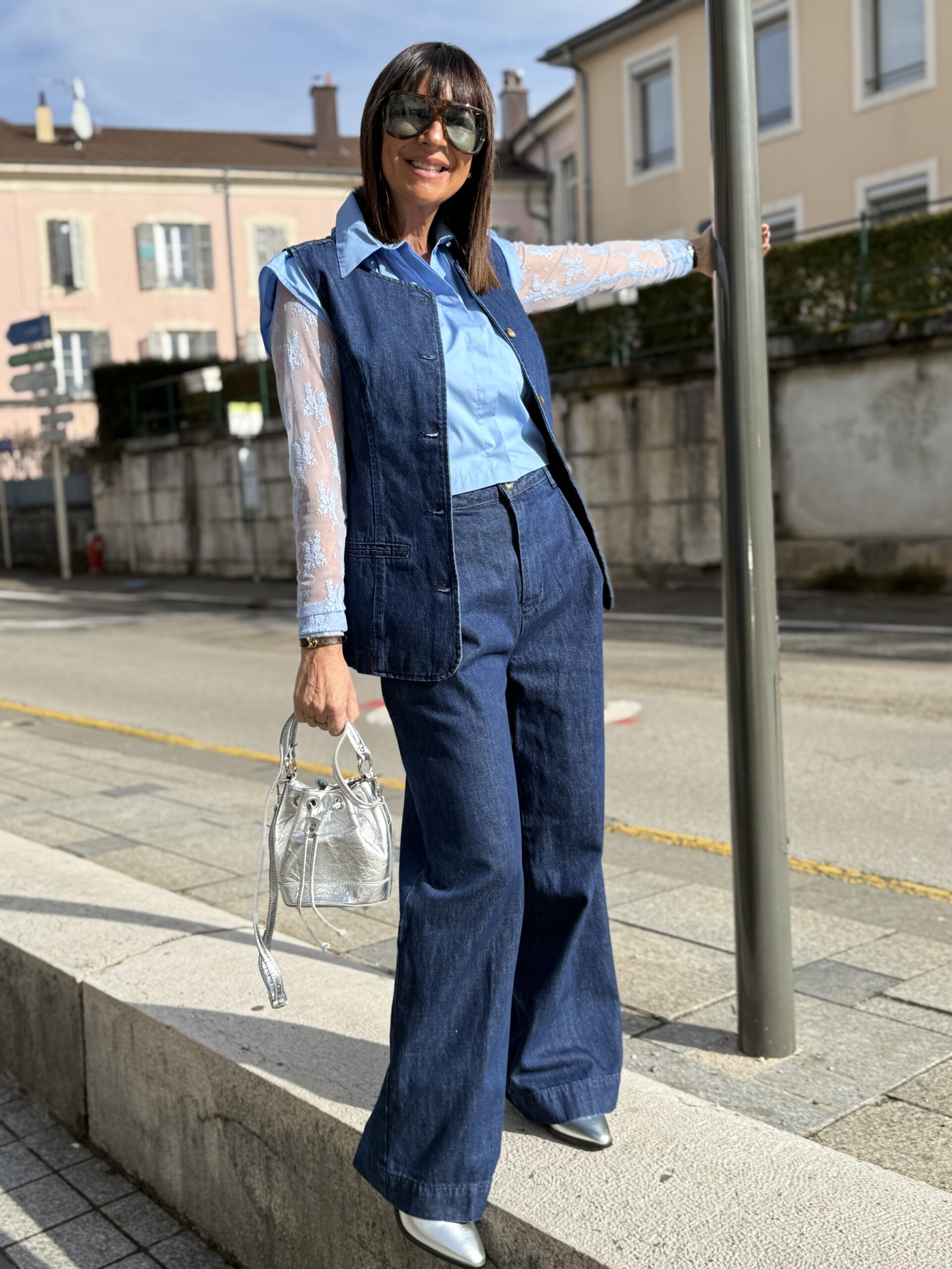 Elle capte la lumière avec une silhouette denim au charme résolument contemporain.