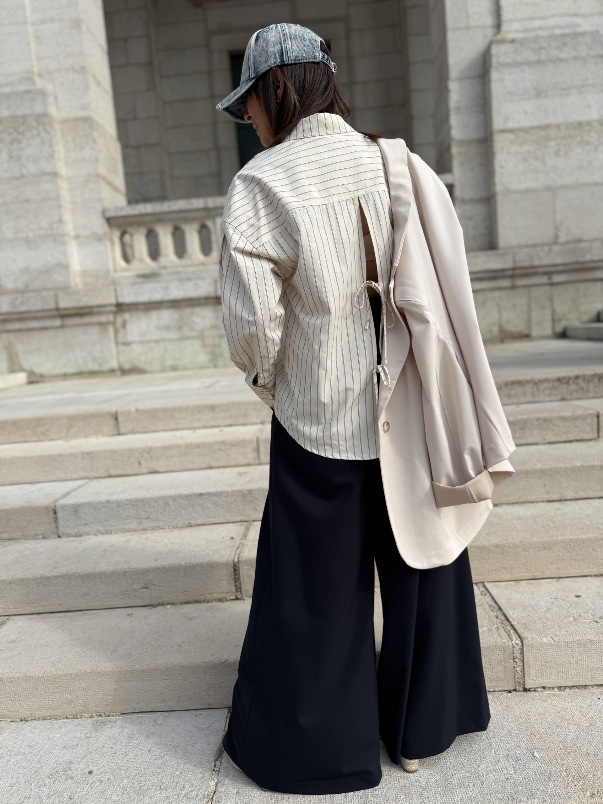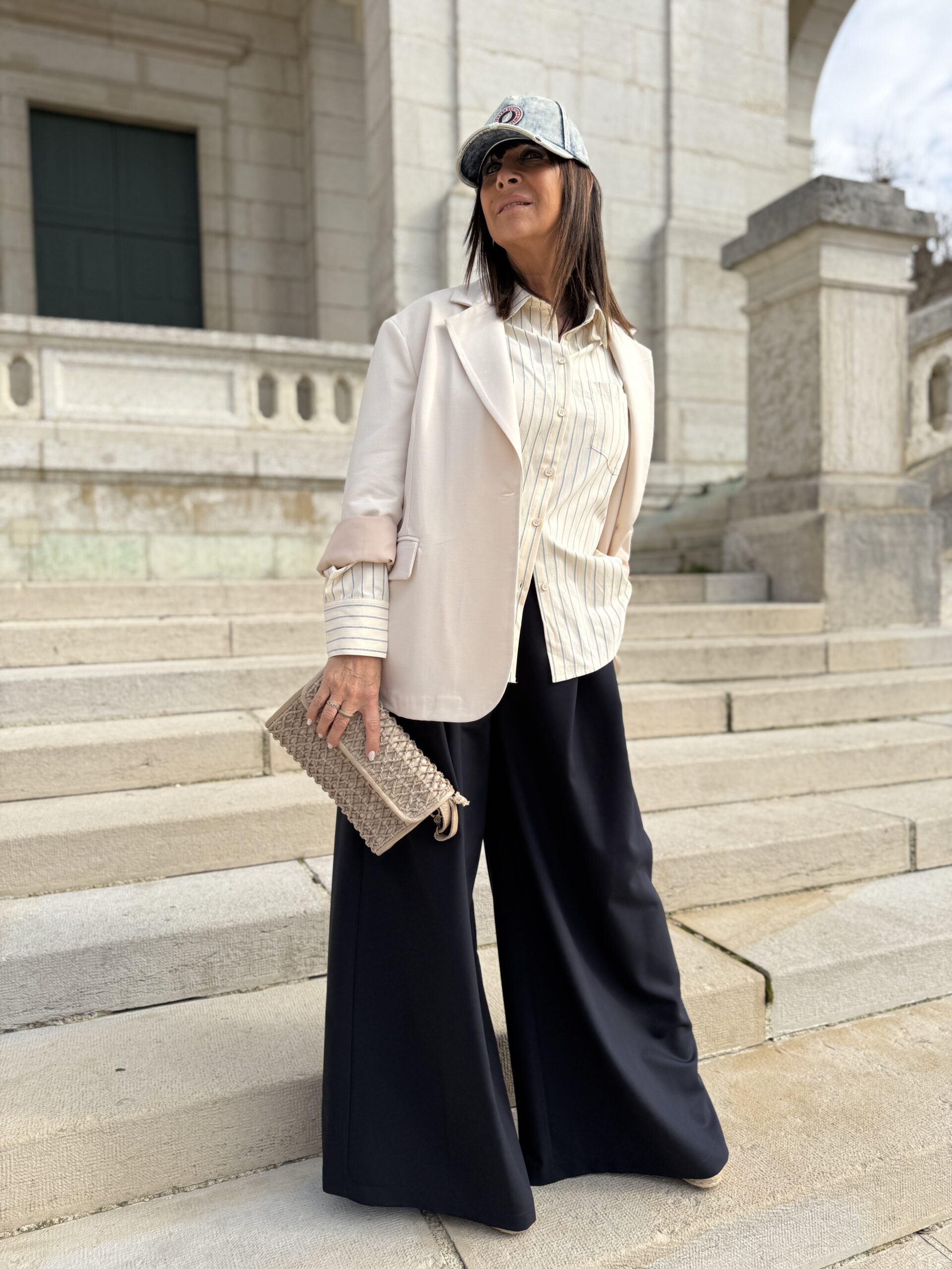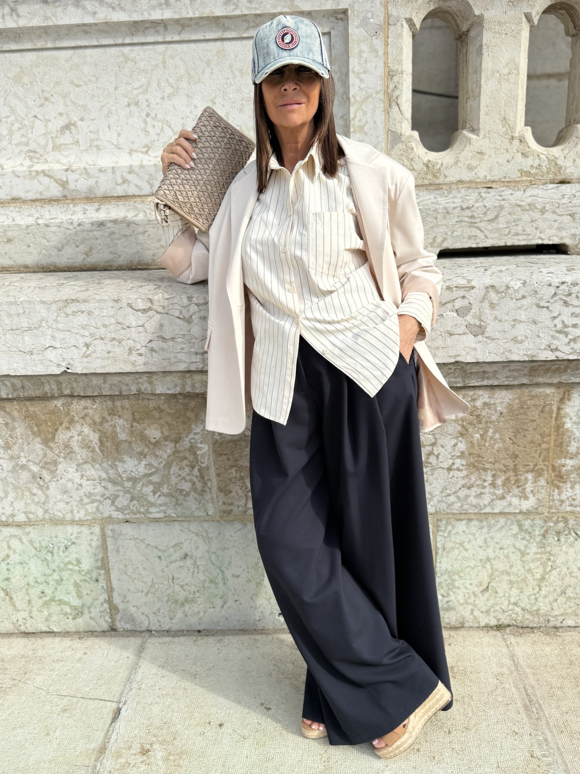 La chemise rayée et le blazer beige jouent la carte du Tailoring , chic et intemporel.