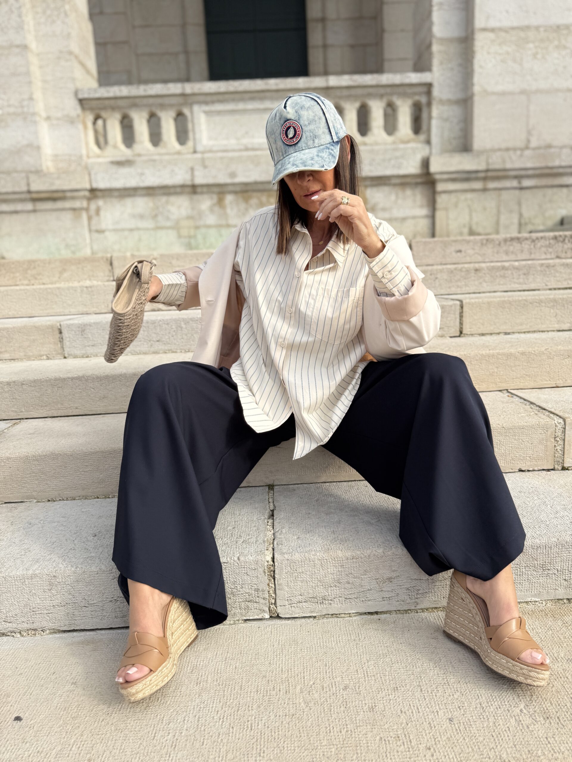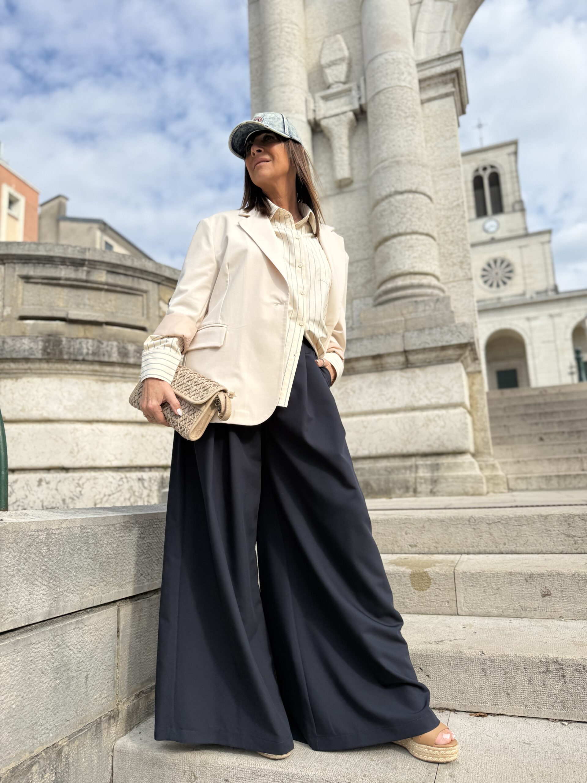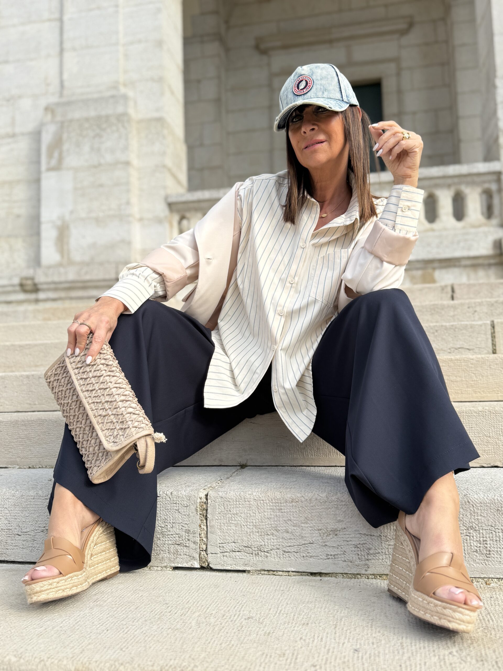 La chemise rayée et le blazer beige jouent la carte du Tailoring , chic et intemporel.