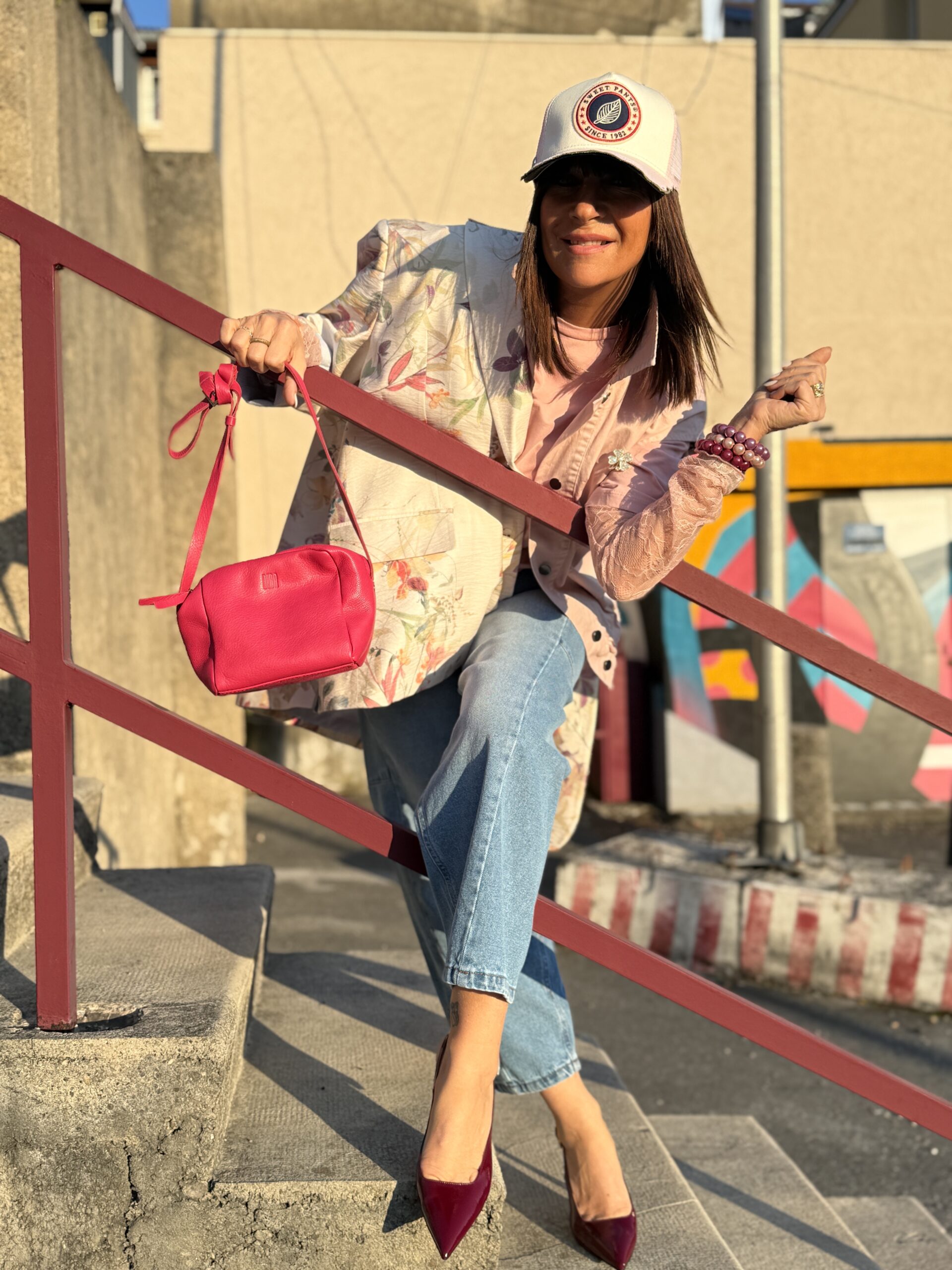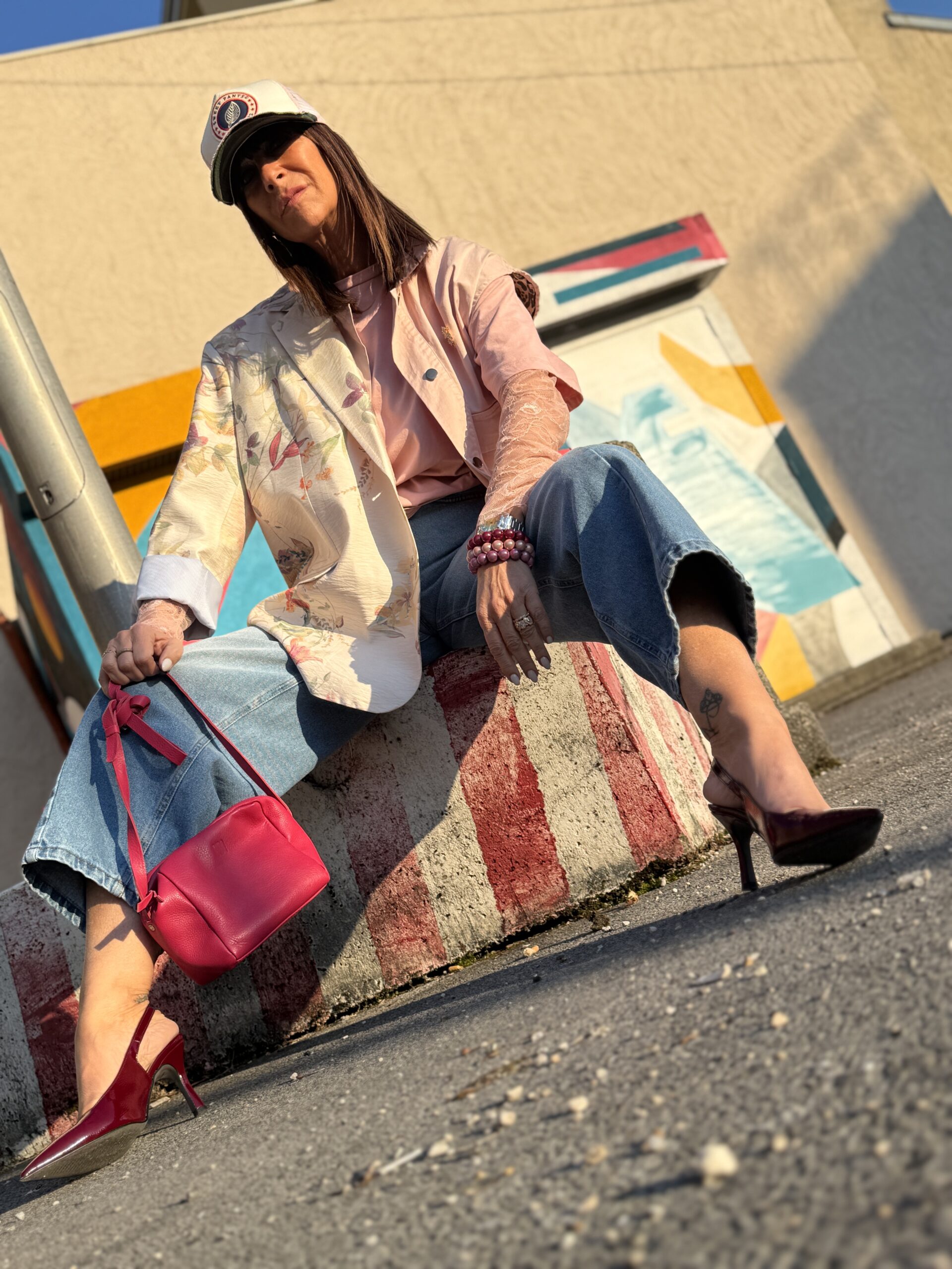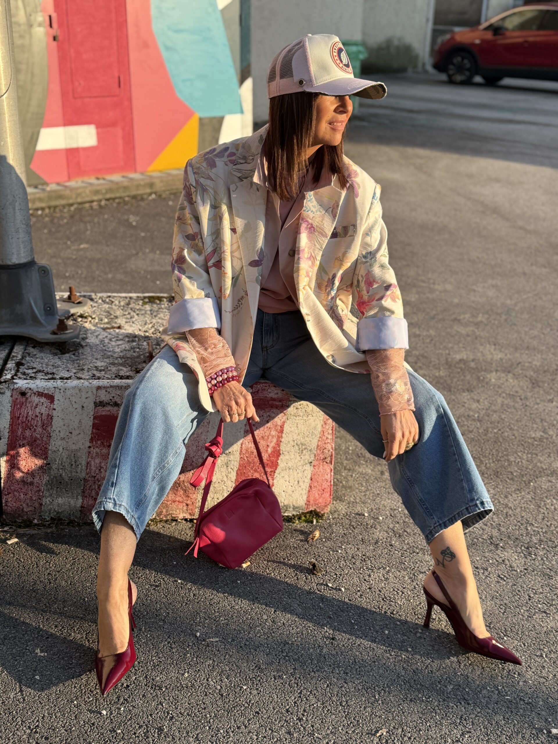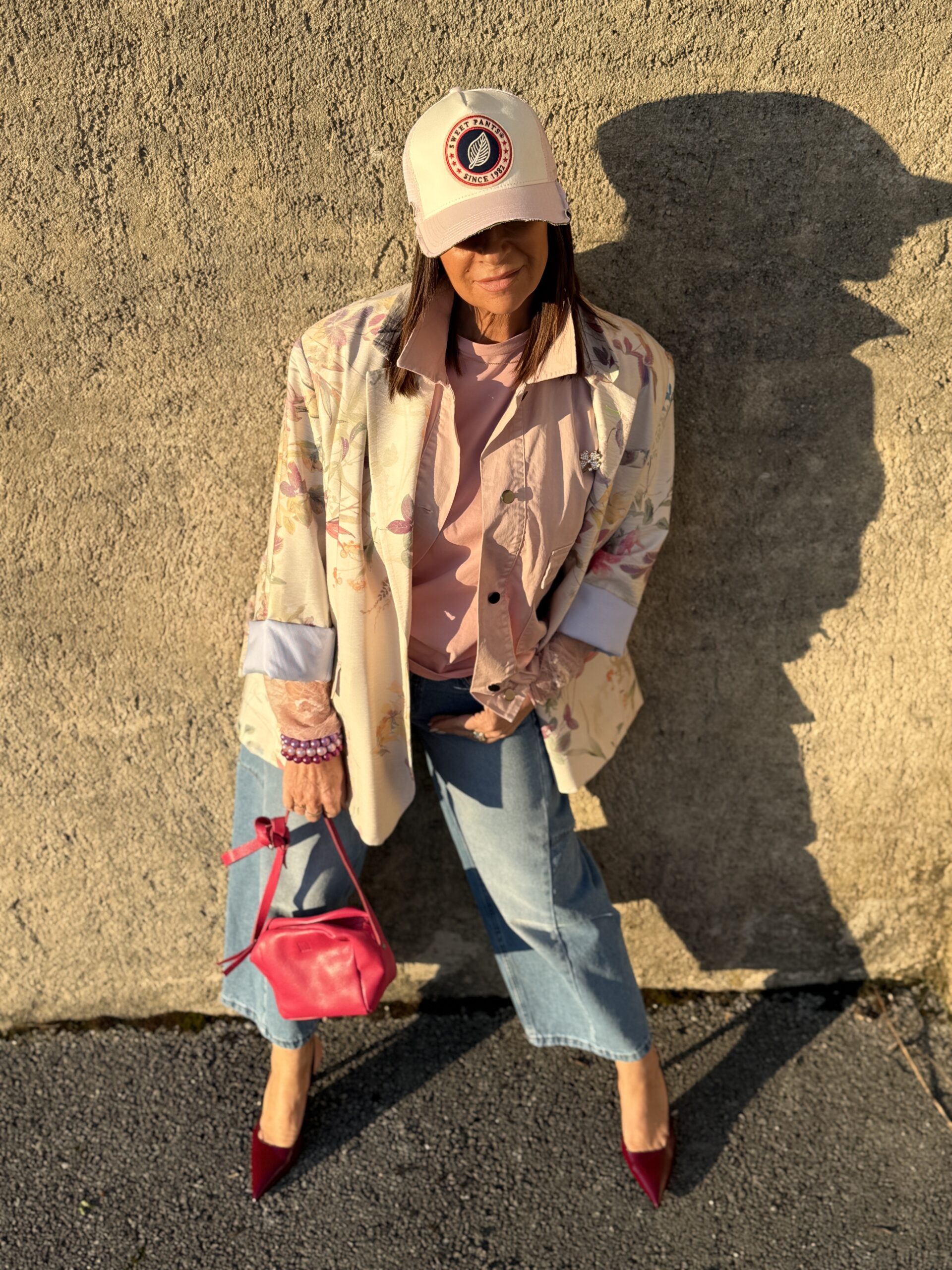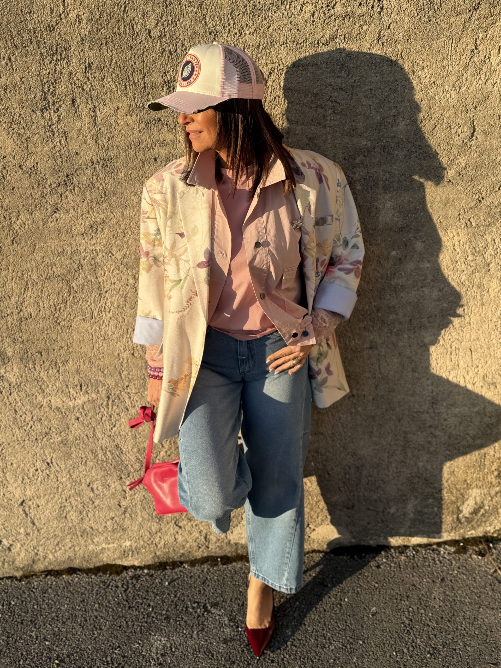 Le jean décontracté pose la base coule, tendit que le blazer fleuri apporte une touche douce et féminine.