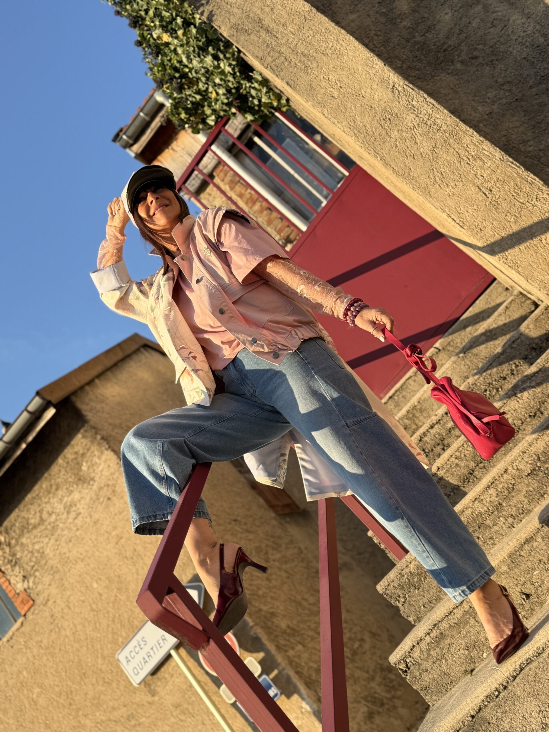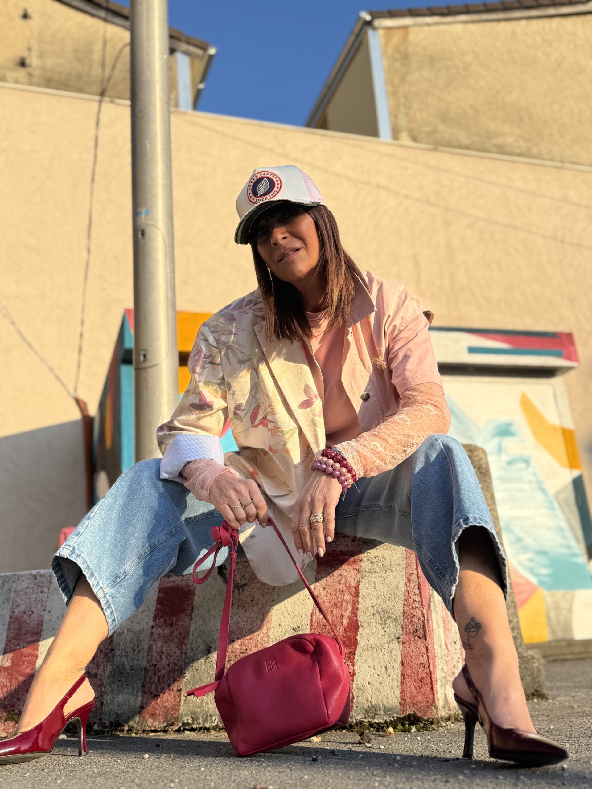 Les escarpins bordeaux viennent rehausser l’ensemble avec élégance et caractère, en rappels subtile du sac.
