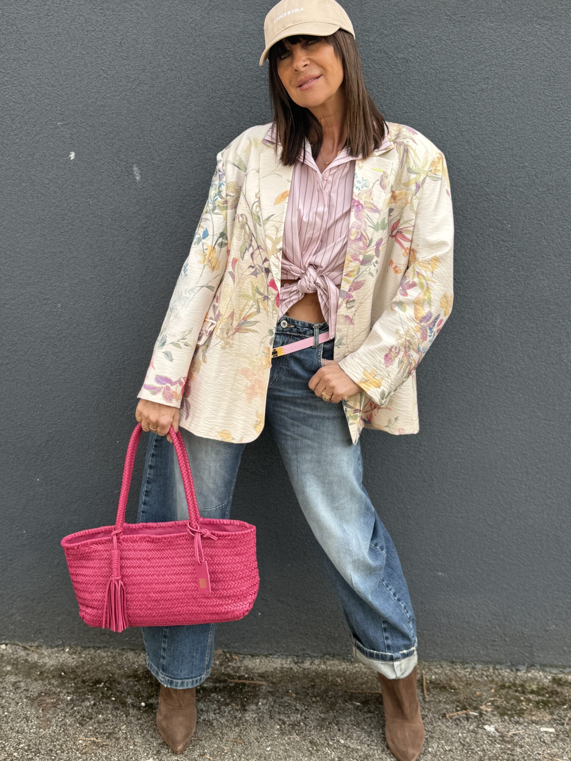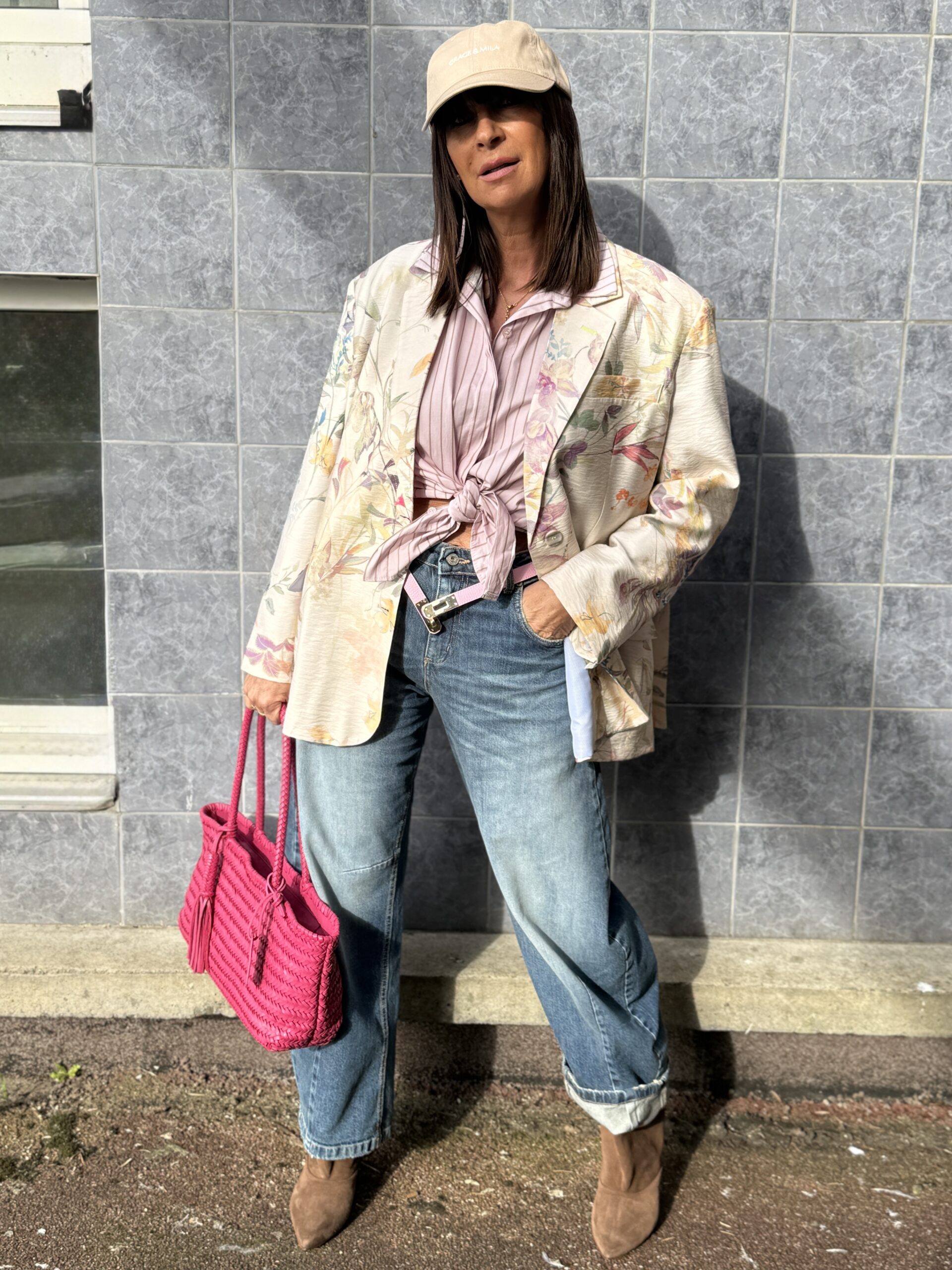Le sac rose vient réveiller le look avec une note vibrante et féminine, tandis que la casquette apporte twist moderne et effortless.