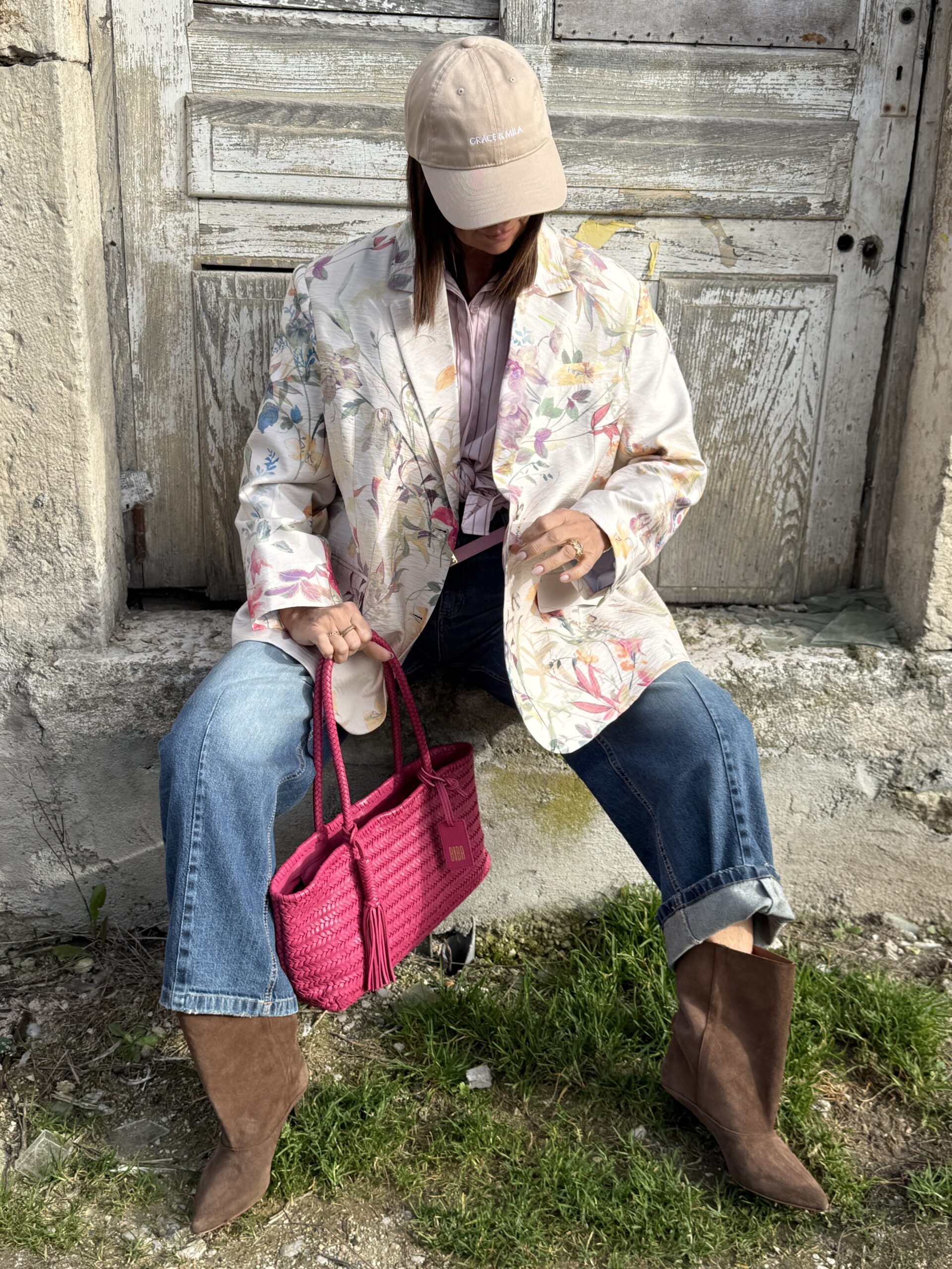 Le blazer à imprimé floral apporte douceur et fraîcheur à la silhouette.