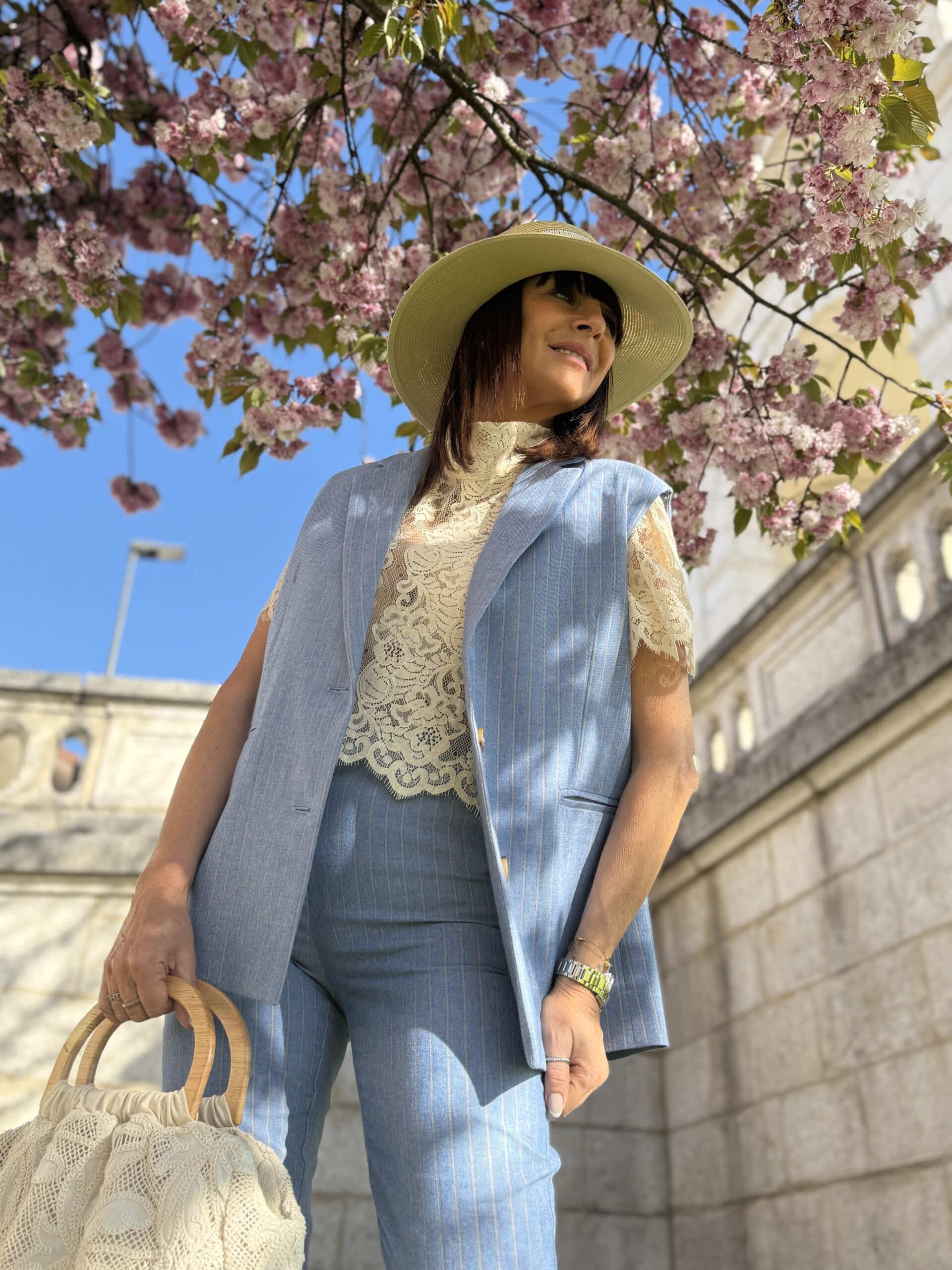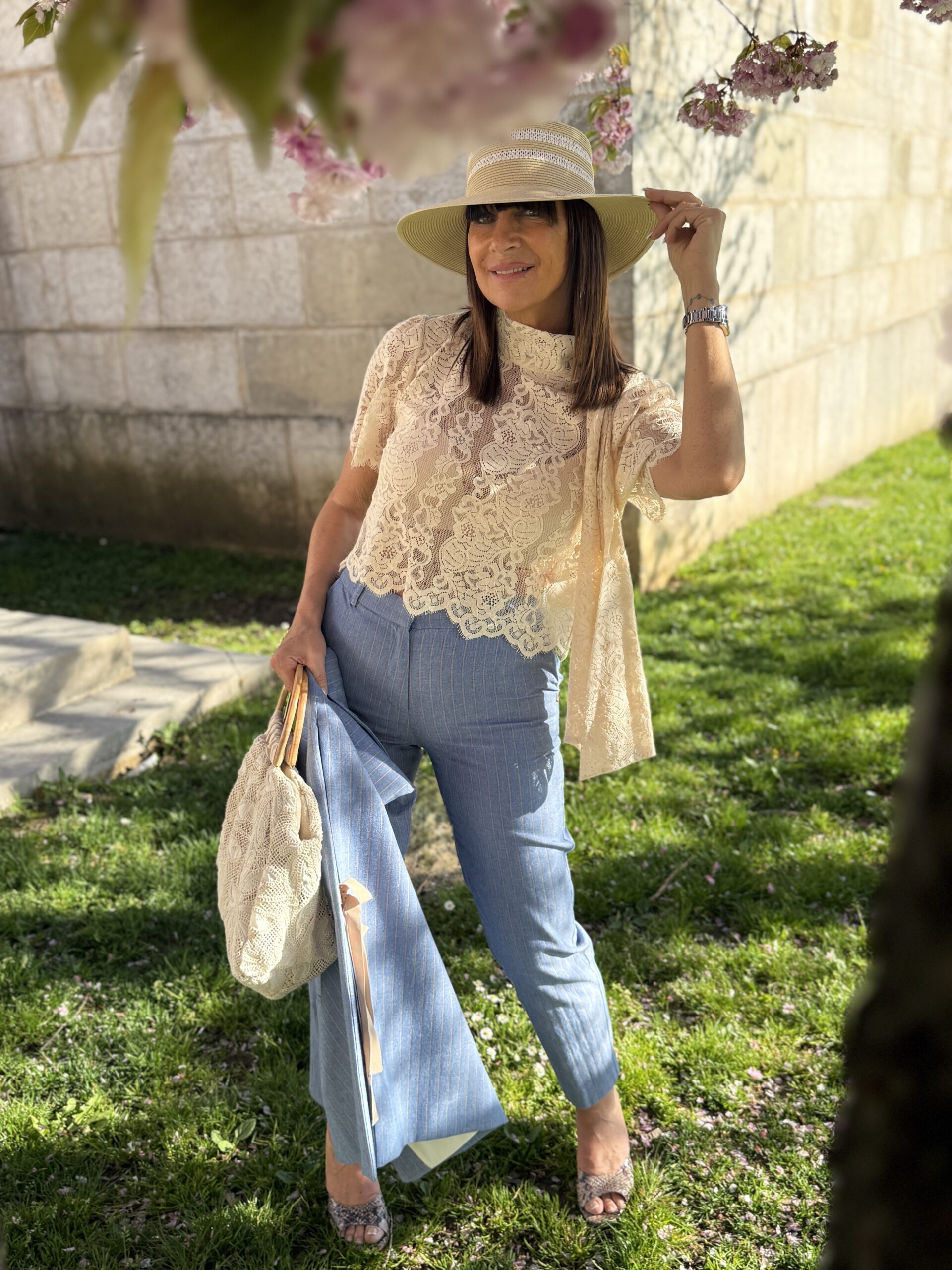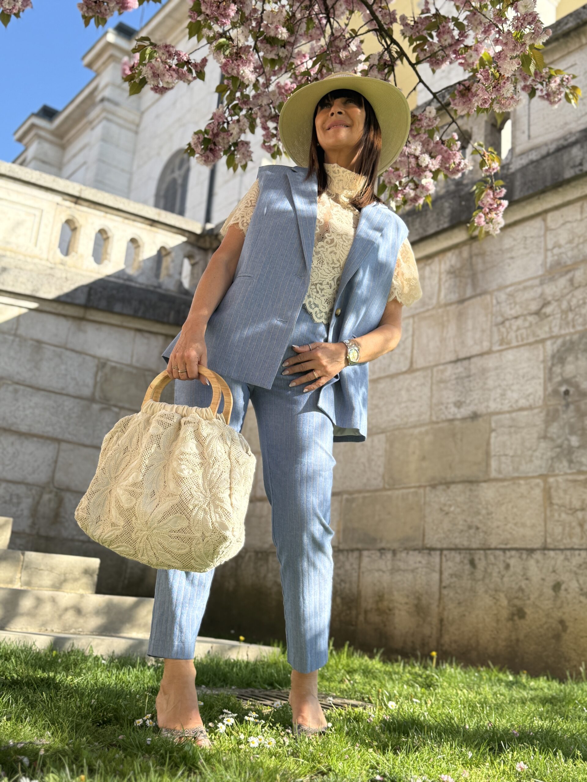 Entre le bleu délicat et la dentelle raffinée, tout respire l’élégance naturelle.