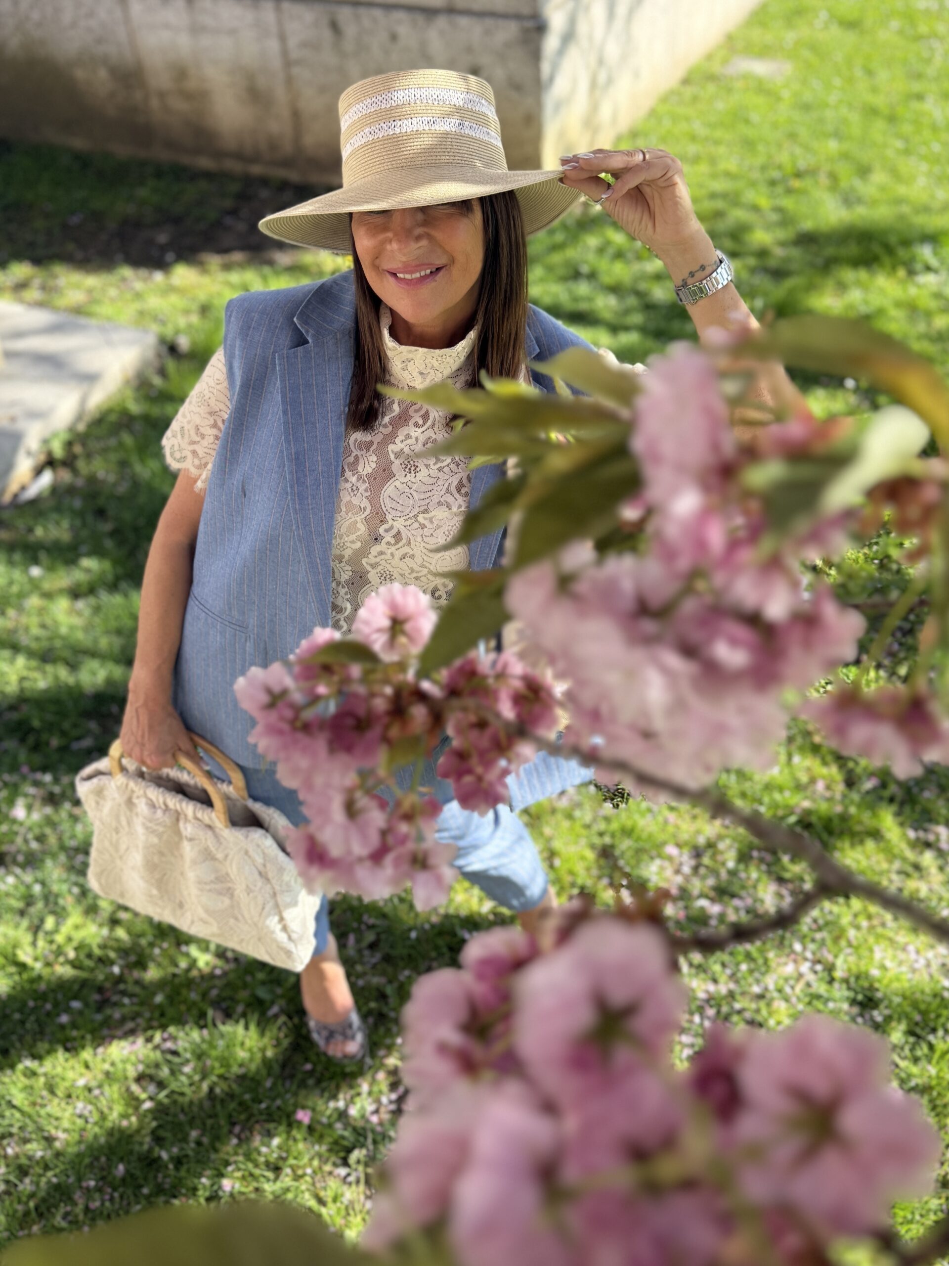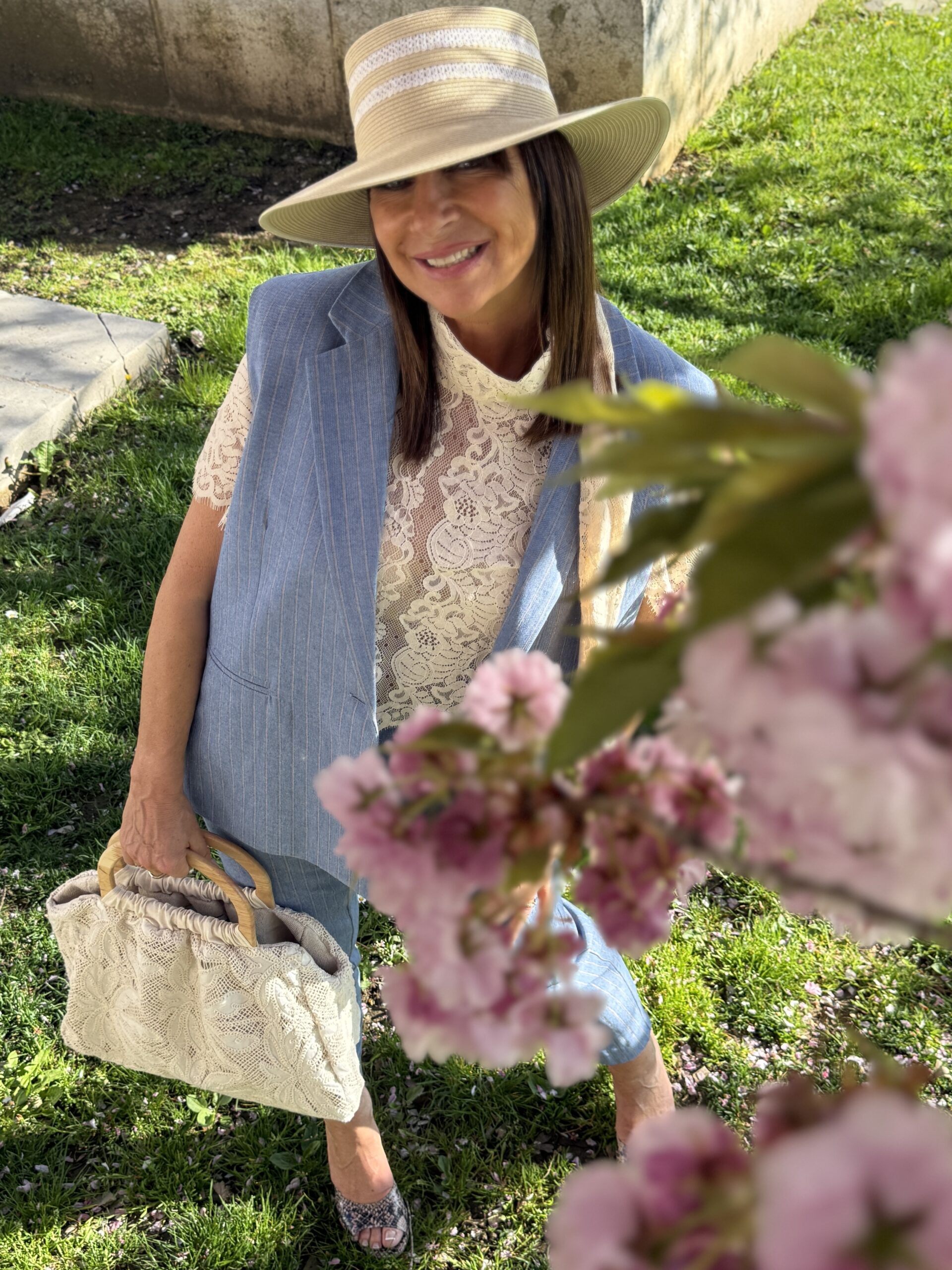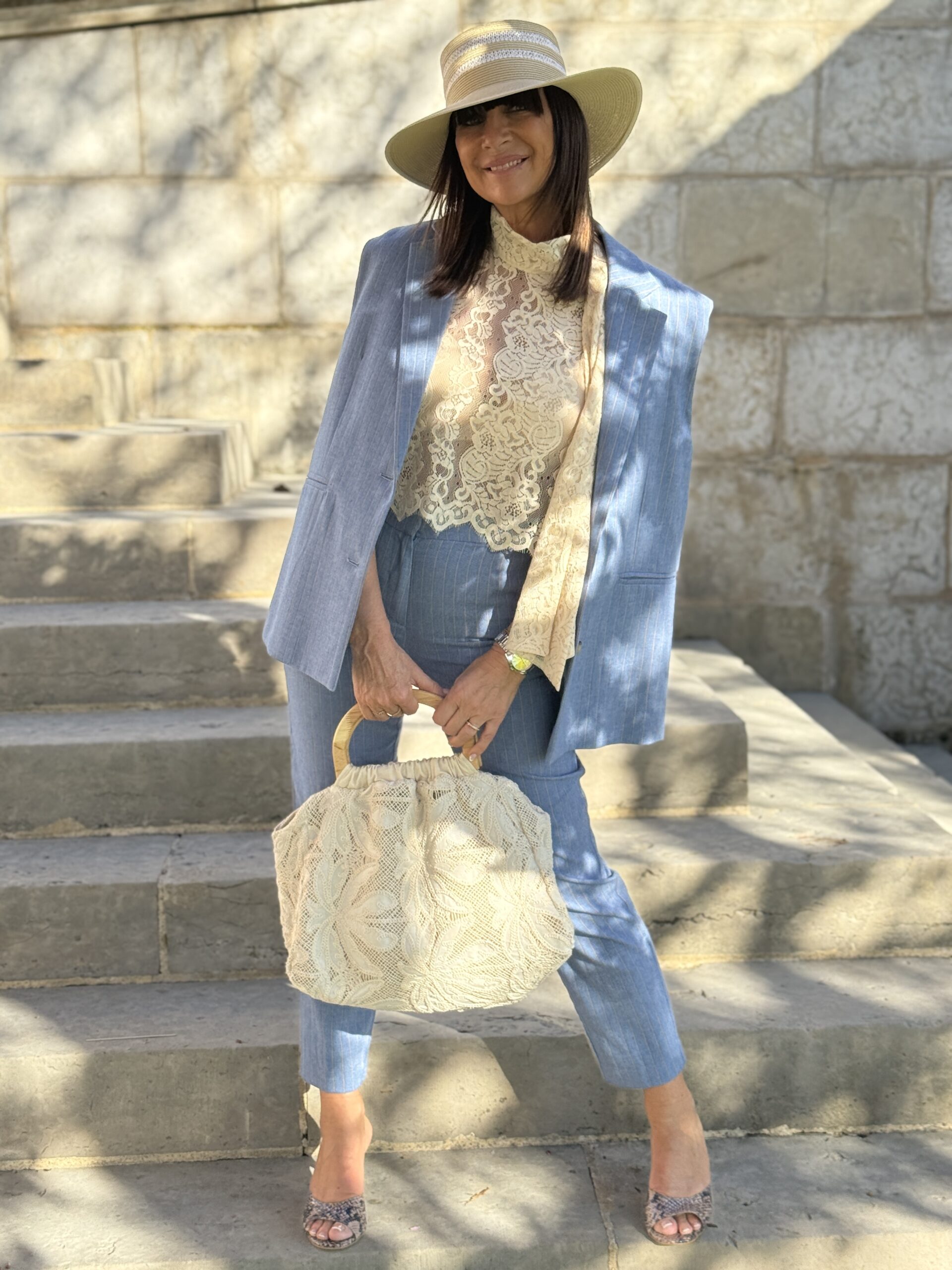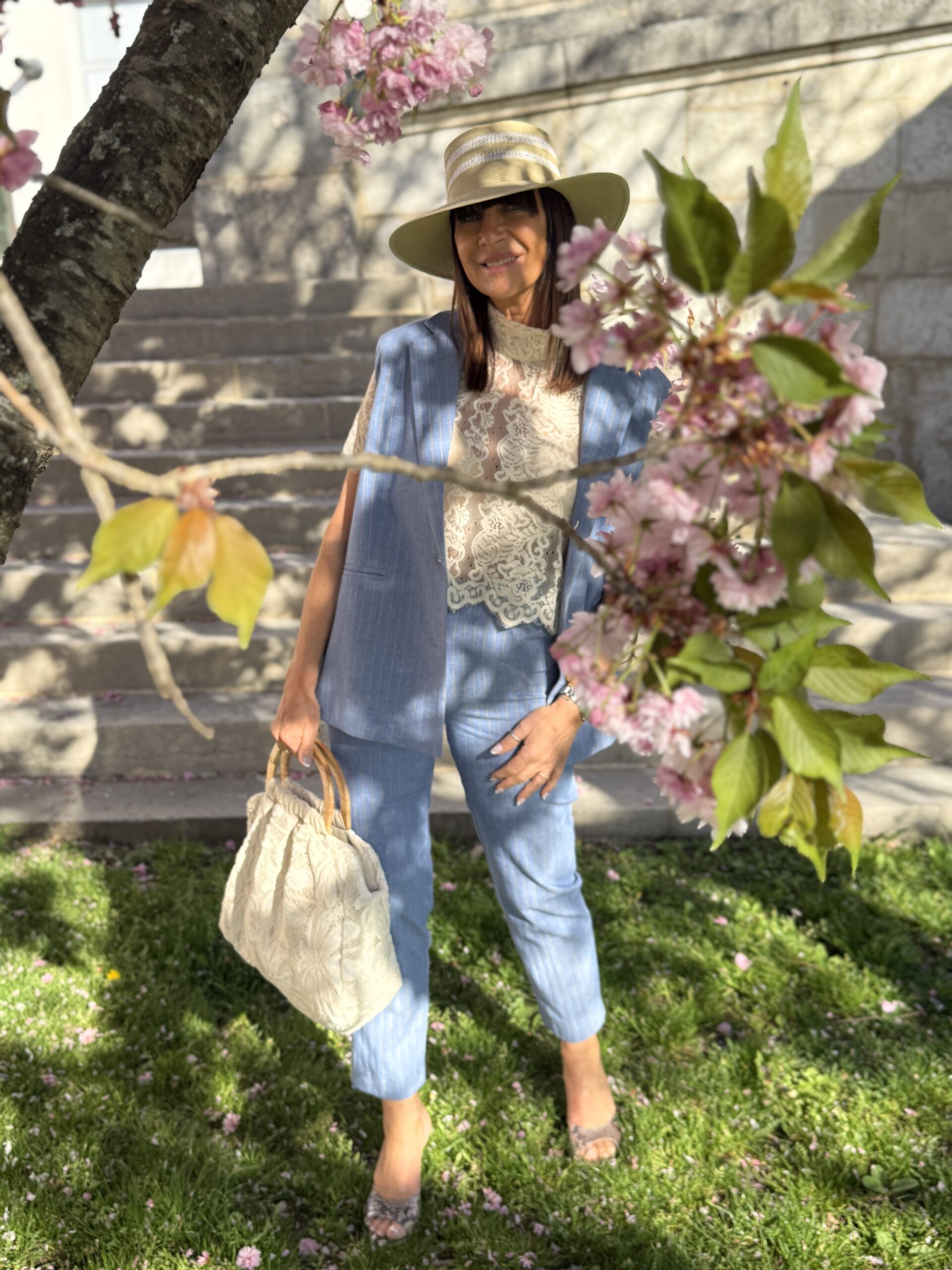 Entre le bleu délicat et la dentelle raffinée, tout respire l’élégance naturelle.