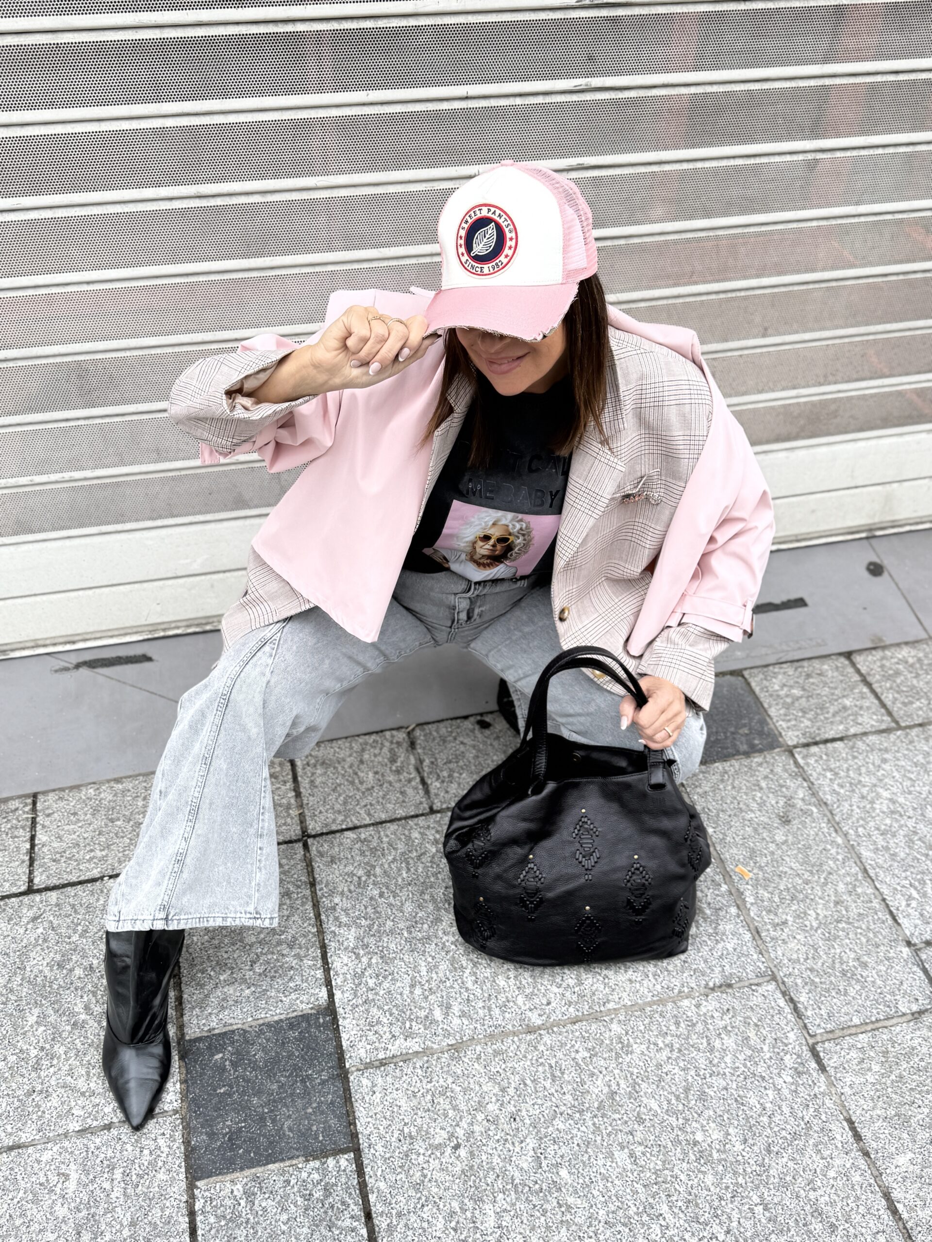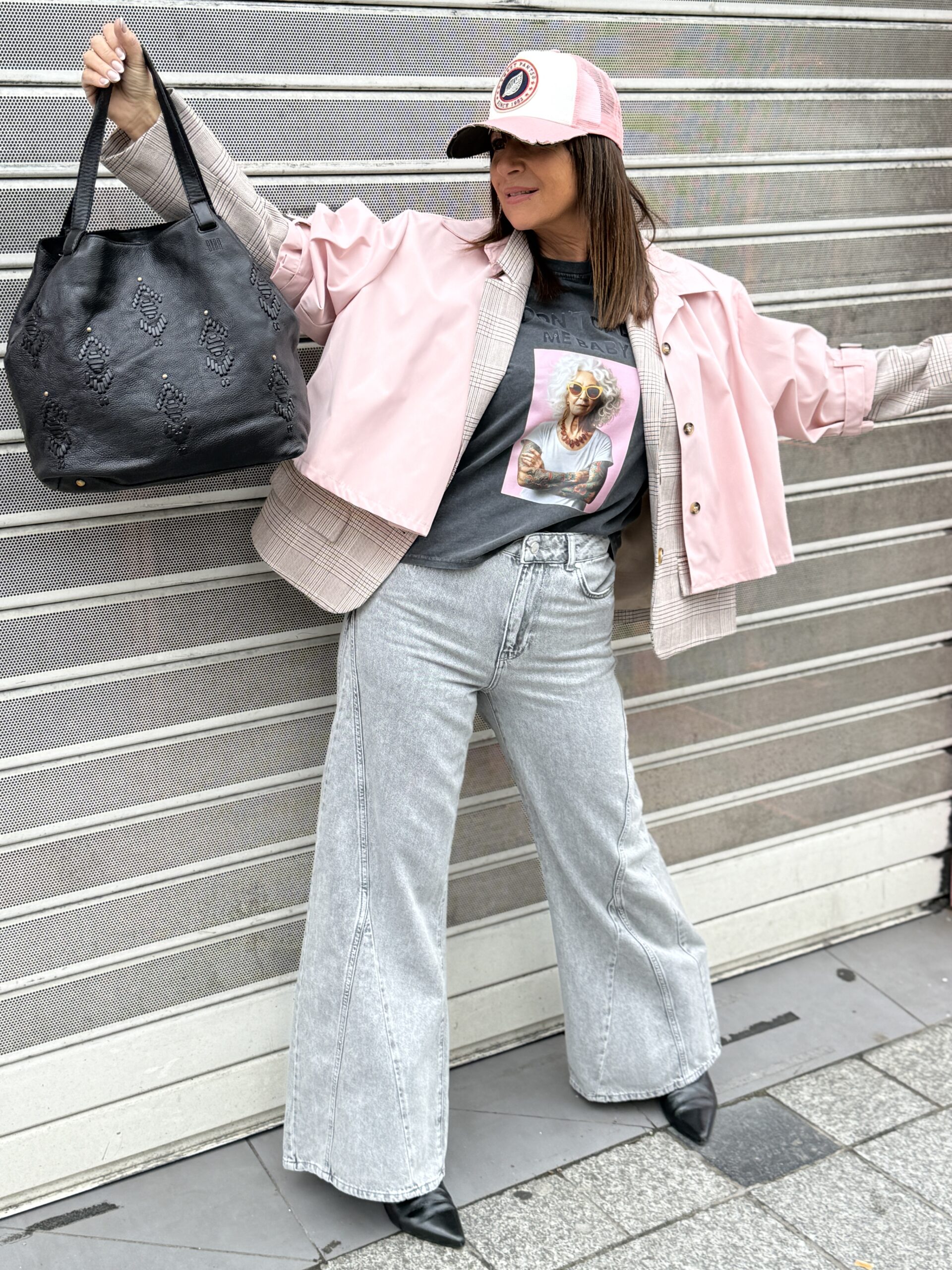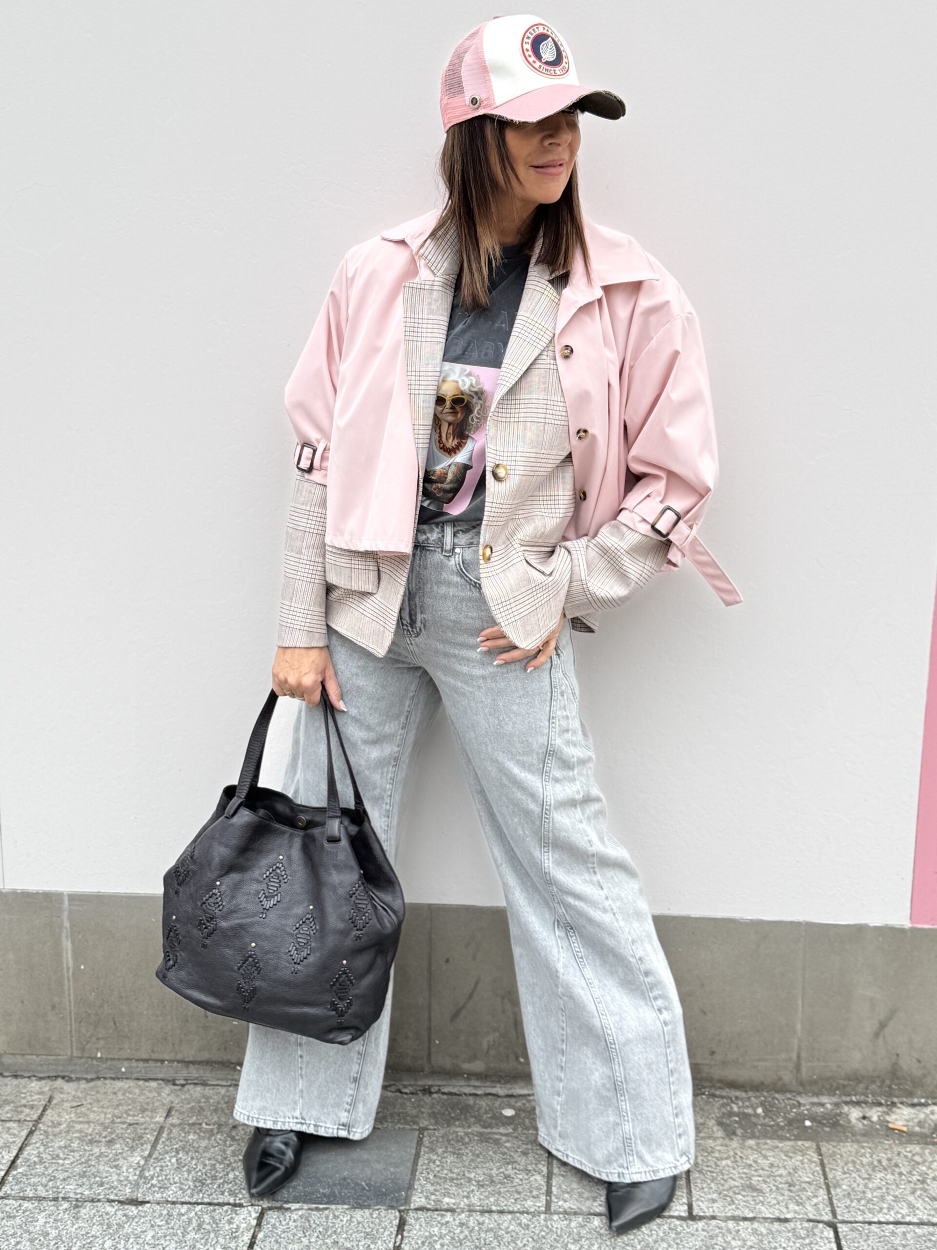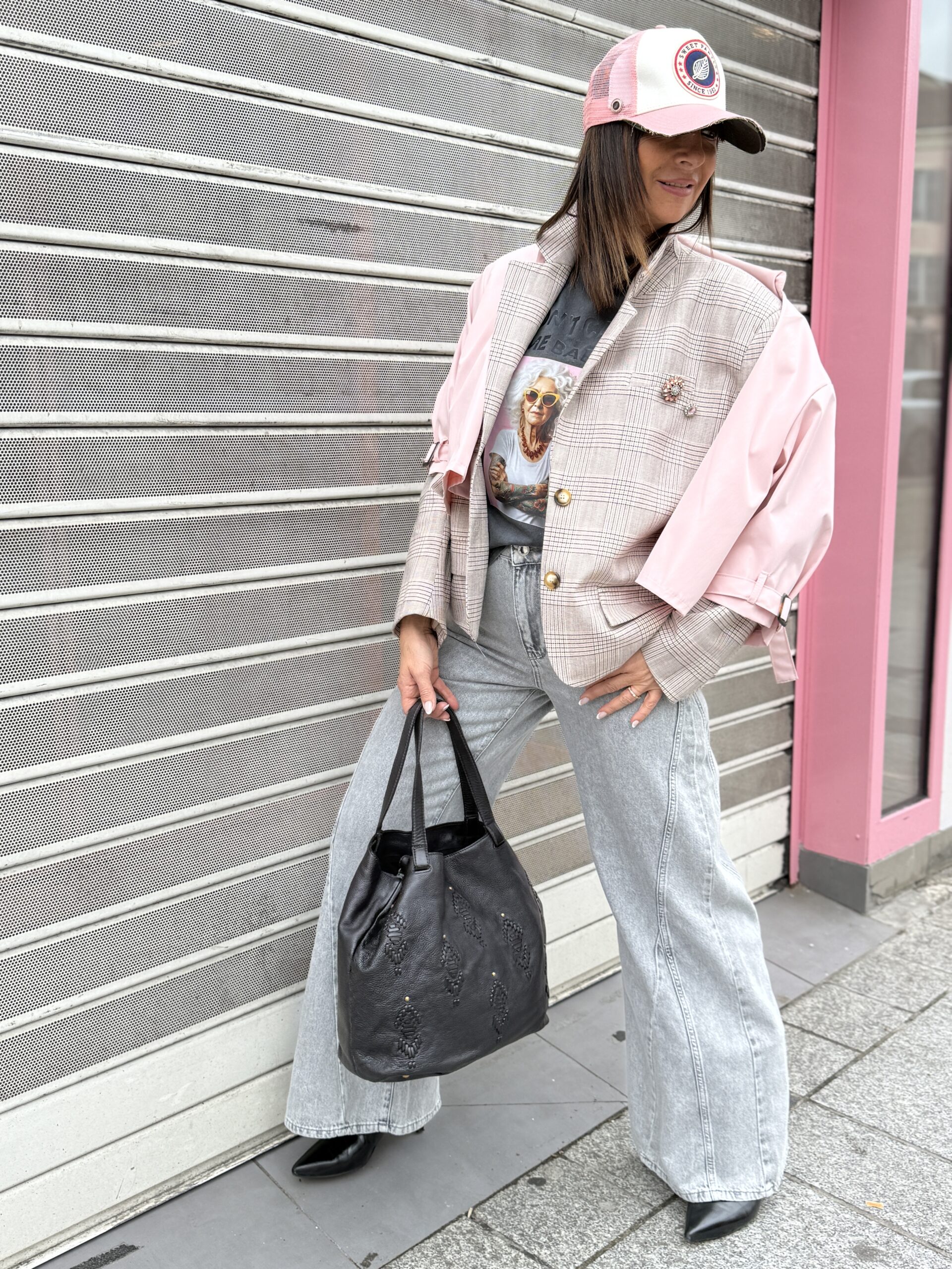 Le combo parfait entre douceur et caractère : la veste pastel qui illumine, le jean wild ultra cool, et le T-shirt qui donne le temps
