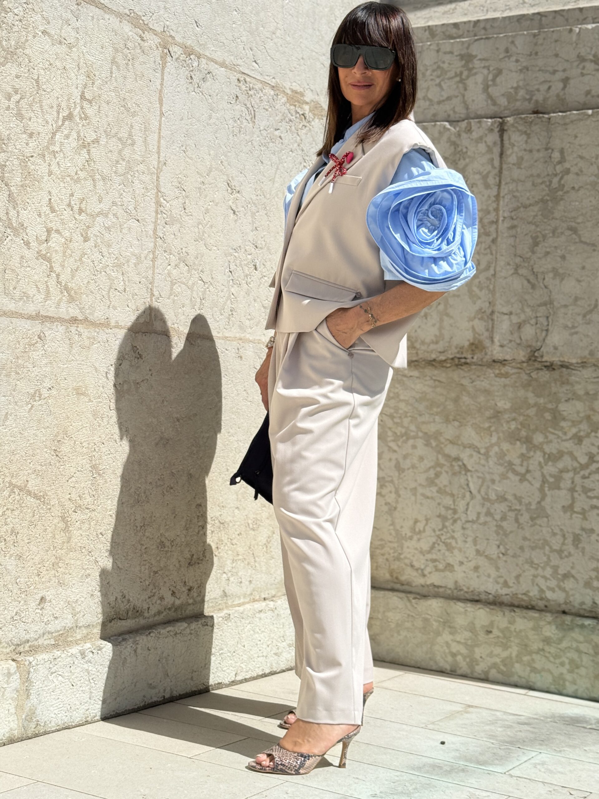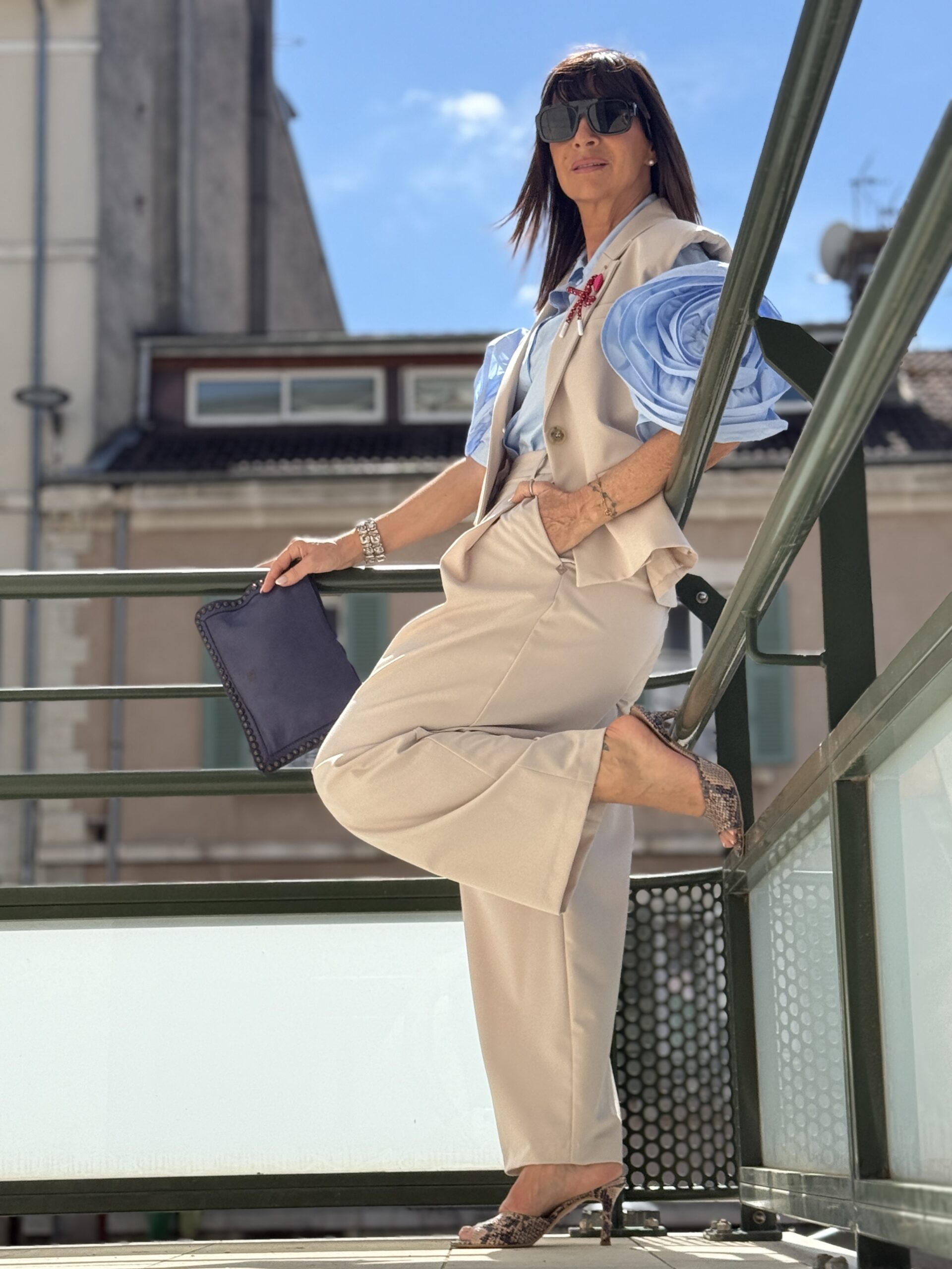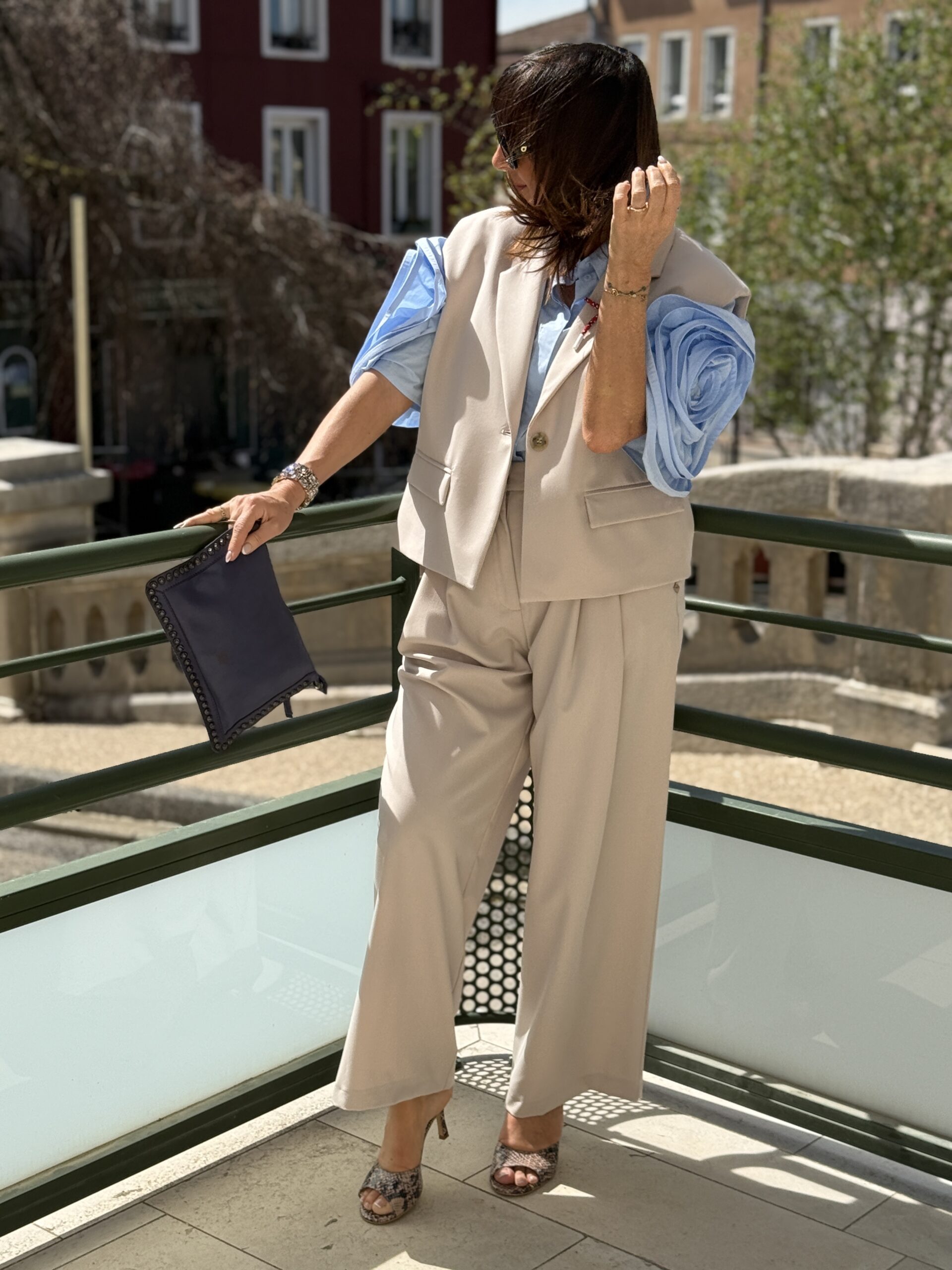Le beige structuré rencontre le bleu aérien pour créer un équilibre parfait entre élégance et modernité.