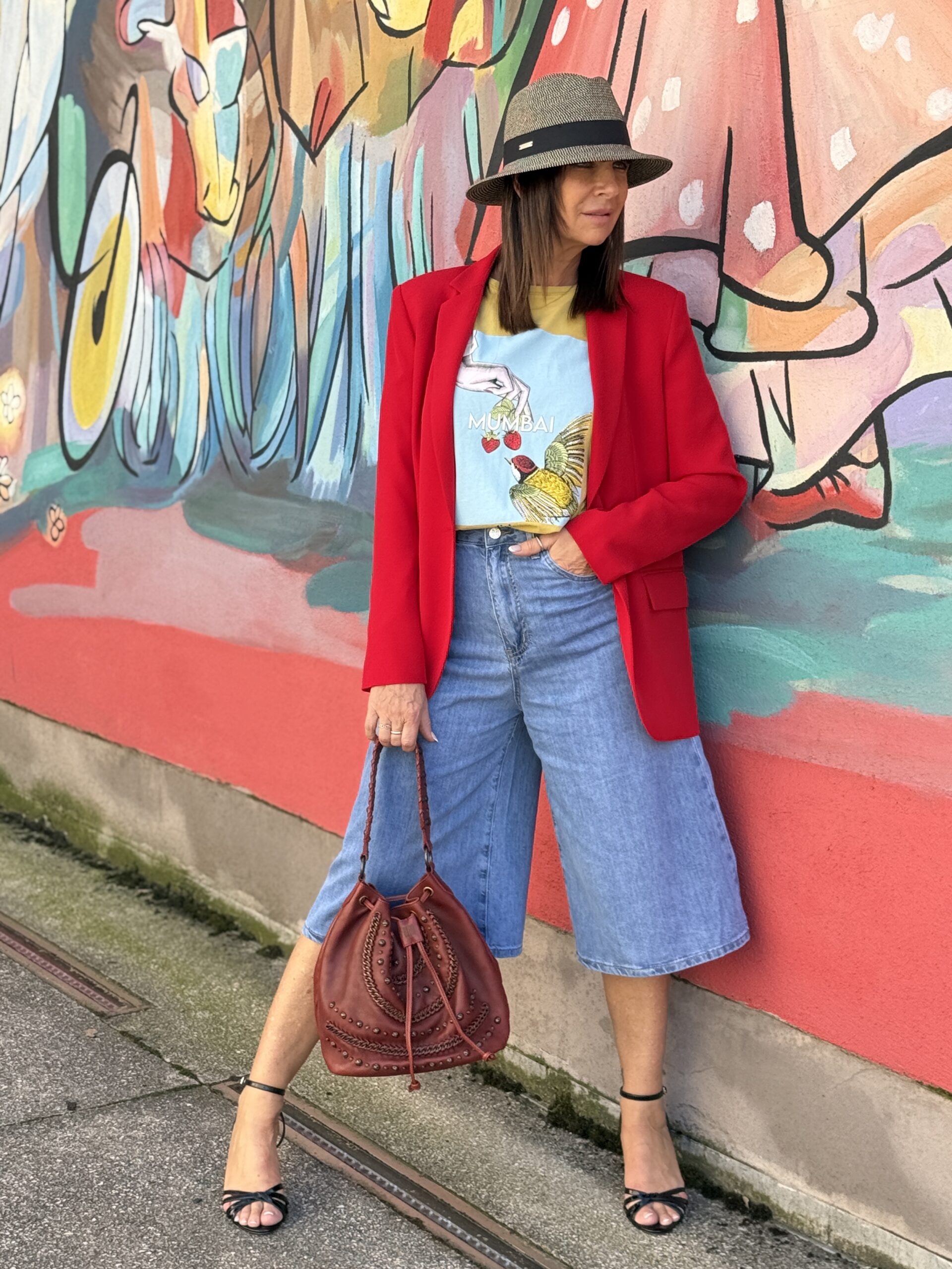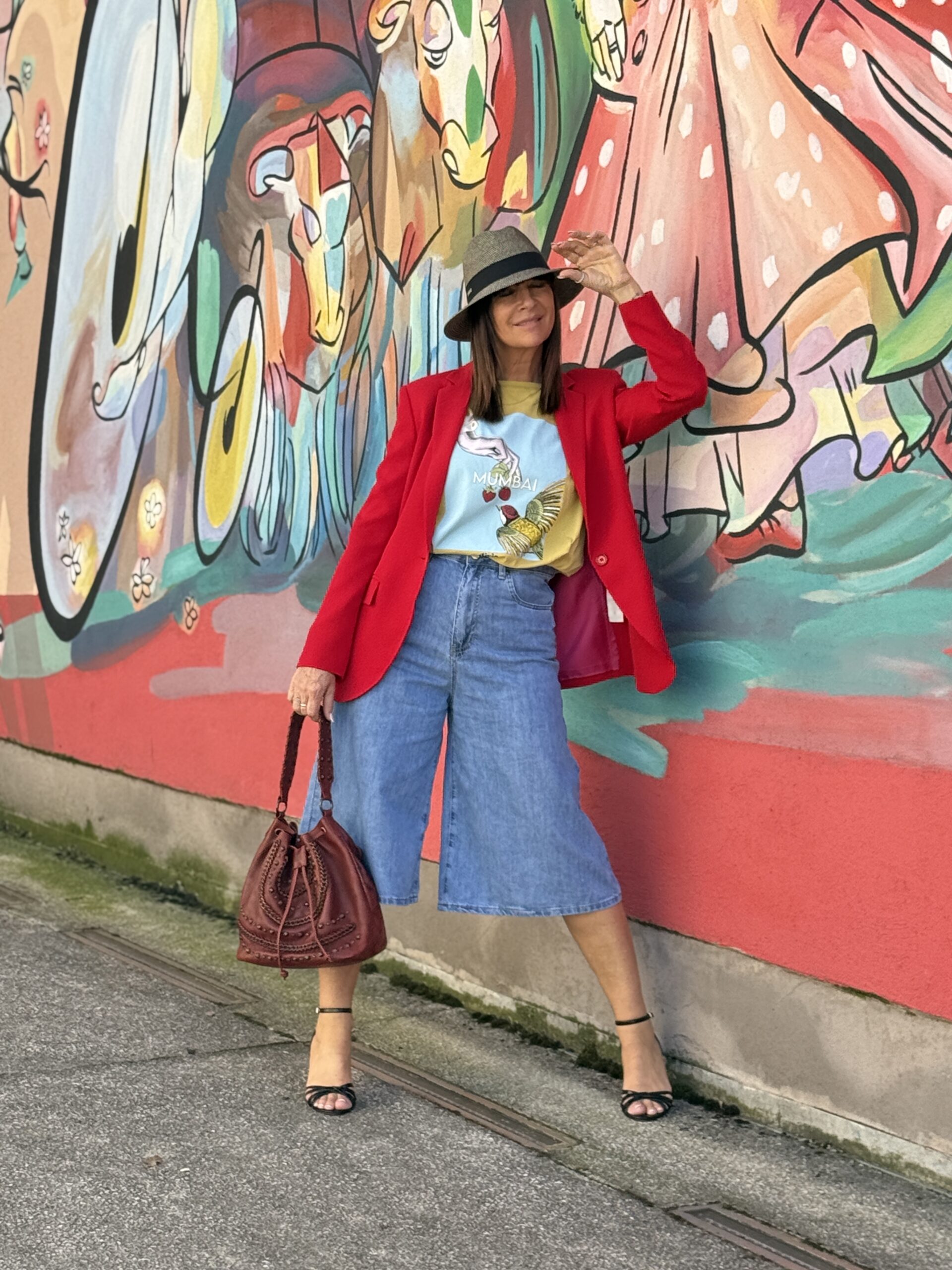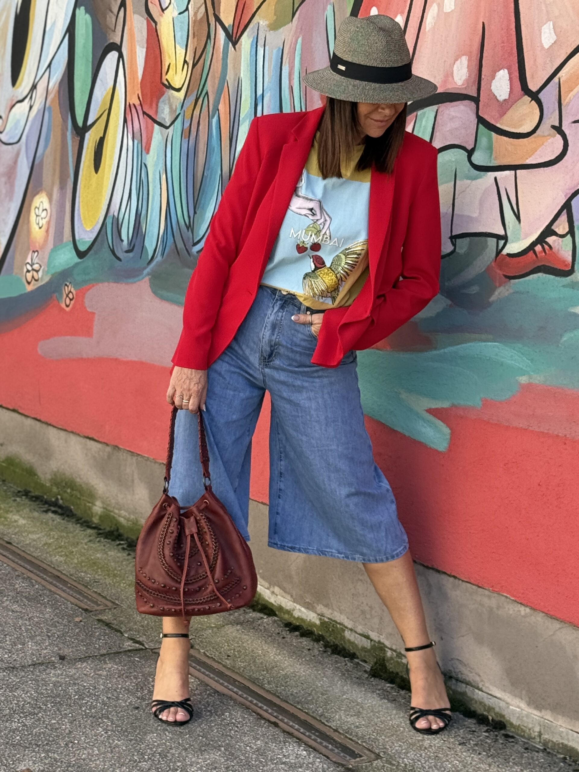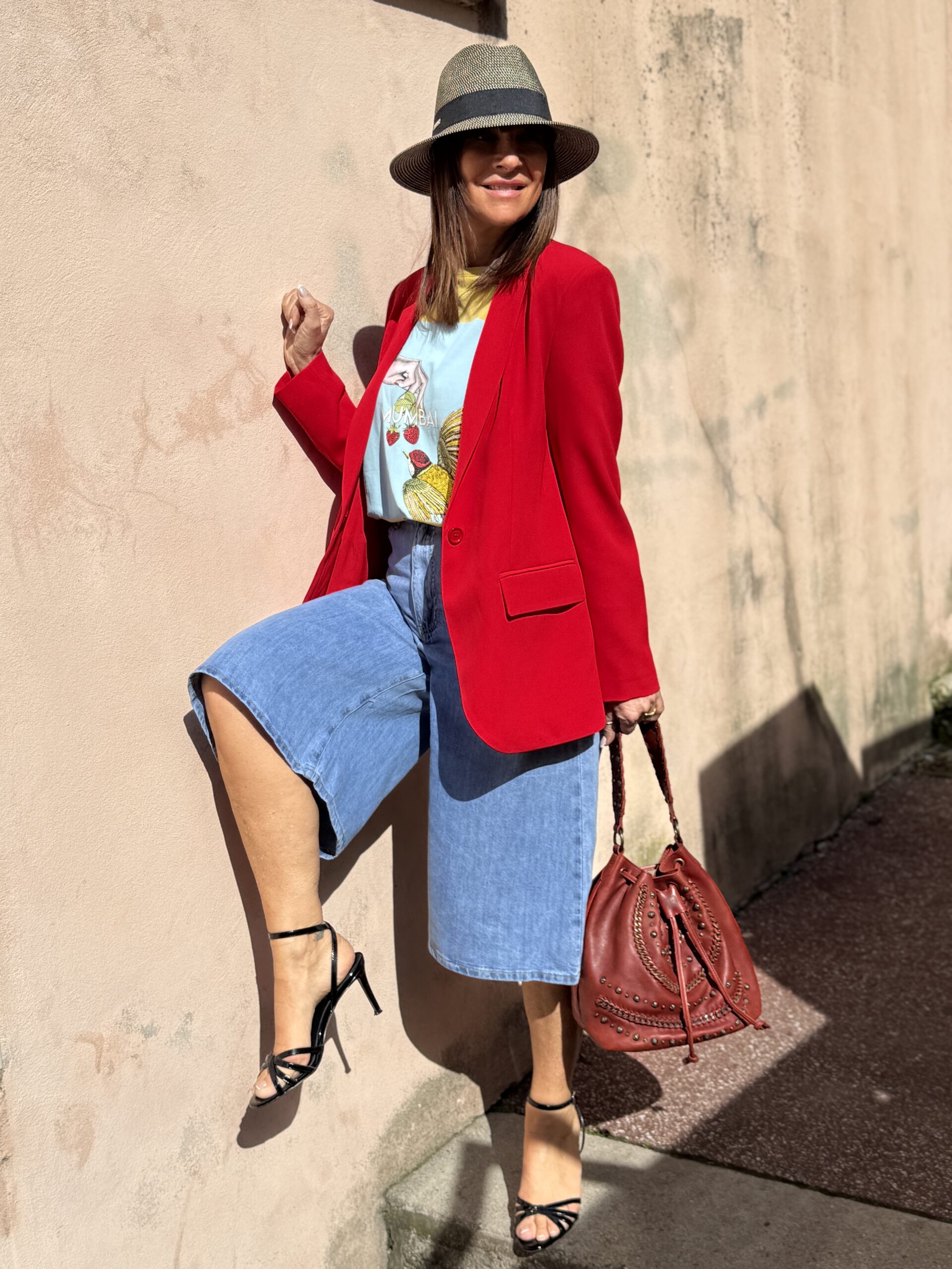 Le rouge vibrant booste le look, le denim équilibre… et le tout respire la bonne humeur.