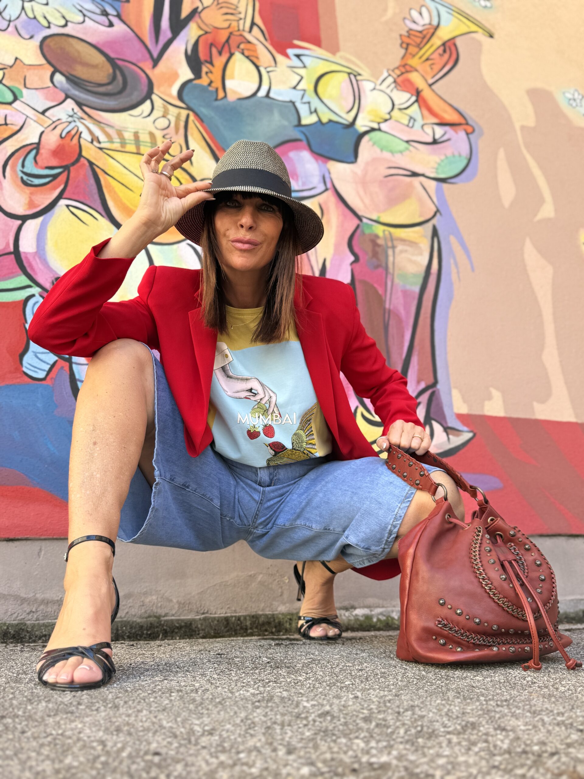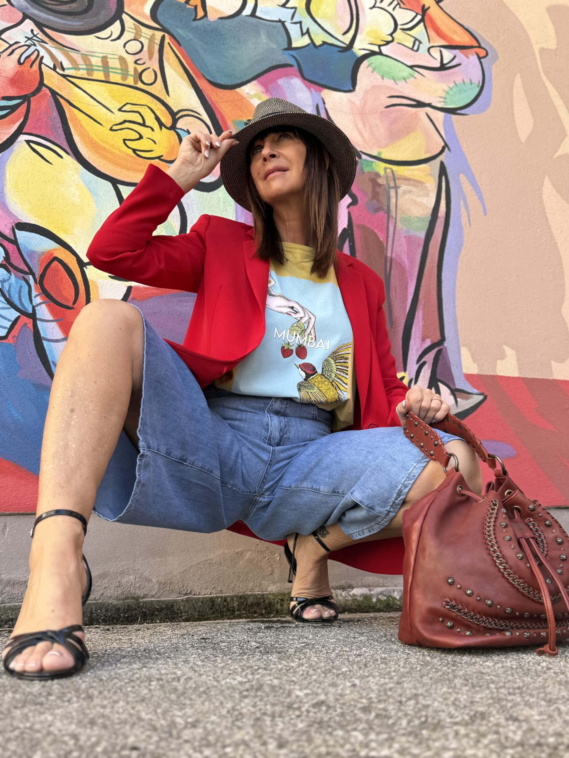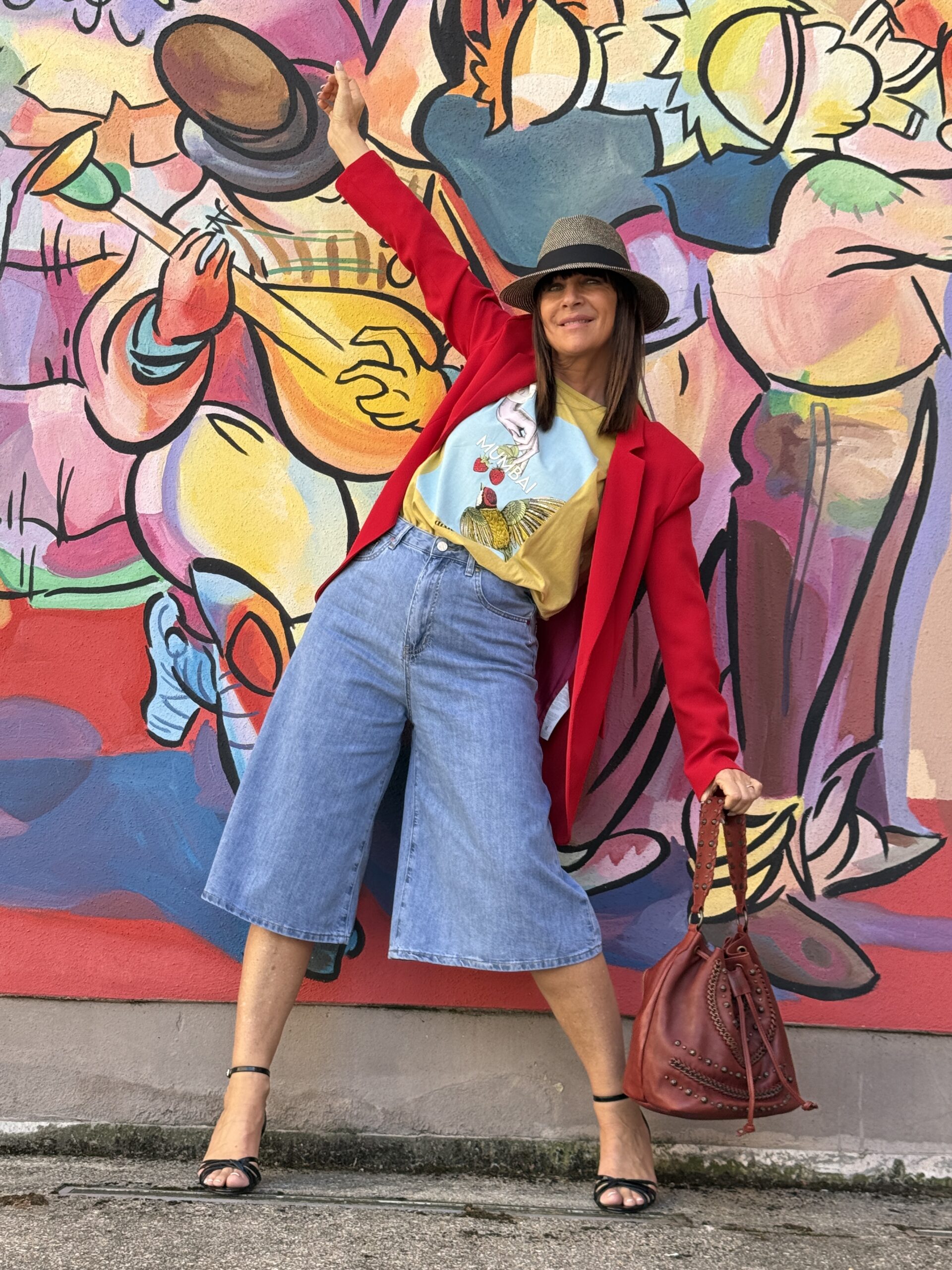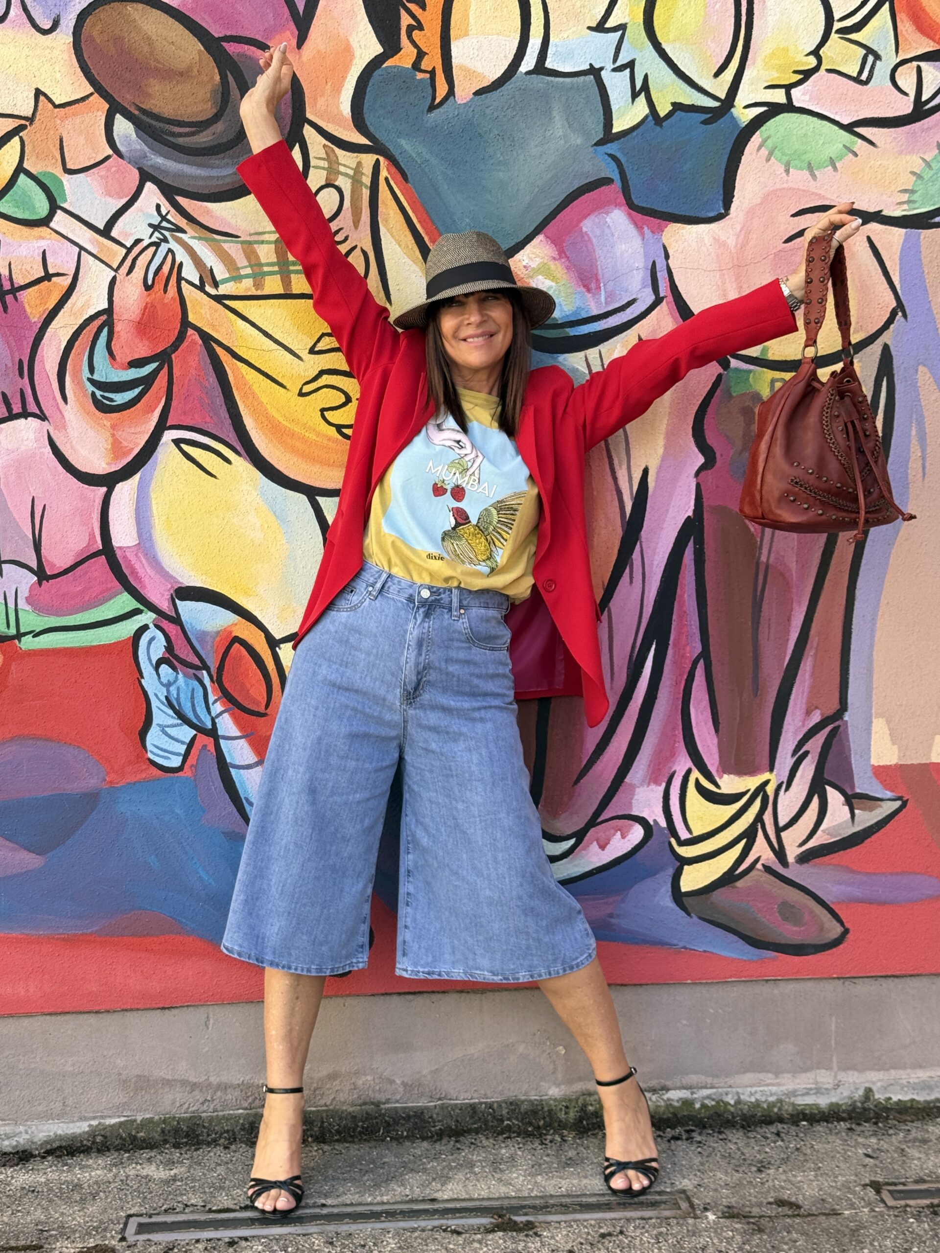 Le rouge vibrant booste le look, le denim équilibre… et le tout respire la bonne humeur.